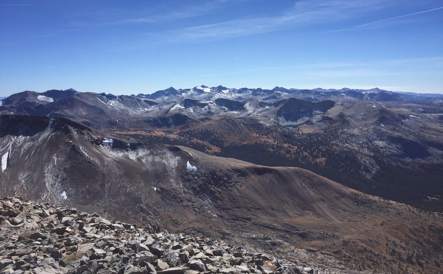 The view south from the summit. Lyell and Maclure dominate the skyline, but Kuna Crest is visible as well.