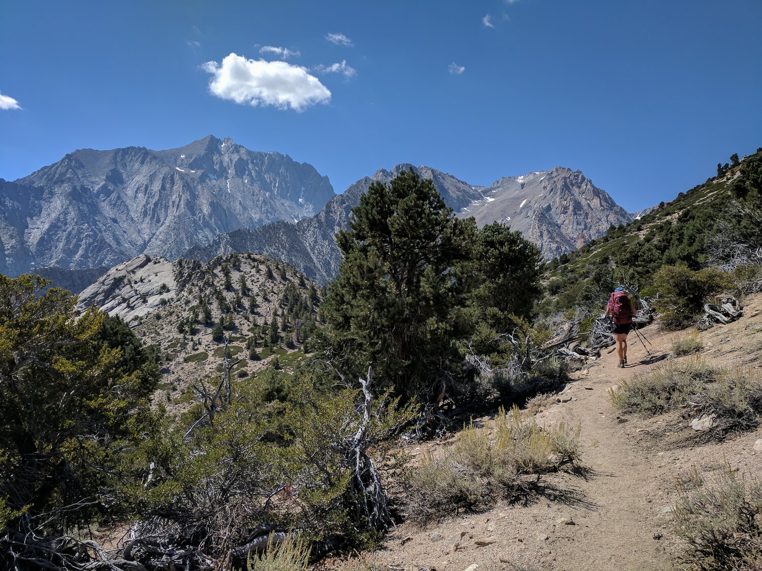 We didn’t rise too early, tired from our long drive, but eventually the morning heat woke us and we packed up and headed up the Shepherd Pass Trail. Despite its reputation, the Shepherd Pass Trail has some redeeming qualities. It’s very beautiful, climbing from the desert sagebrush through pine forests, along a creek to Anvil Camp, and finally easily passing through a boulder field en route to Shepherd Pass. There are some online who complain of the difficulty of this climb, which is made worse by a 500’ descent about halfway up, and that’s fair, but it’s a high bar to ask all of these eastside trails to provide the beauty and easy access of Onion Valley or Bishop Pass.
