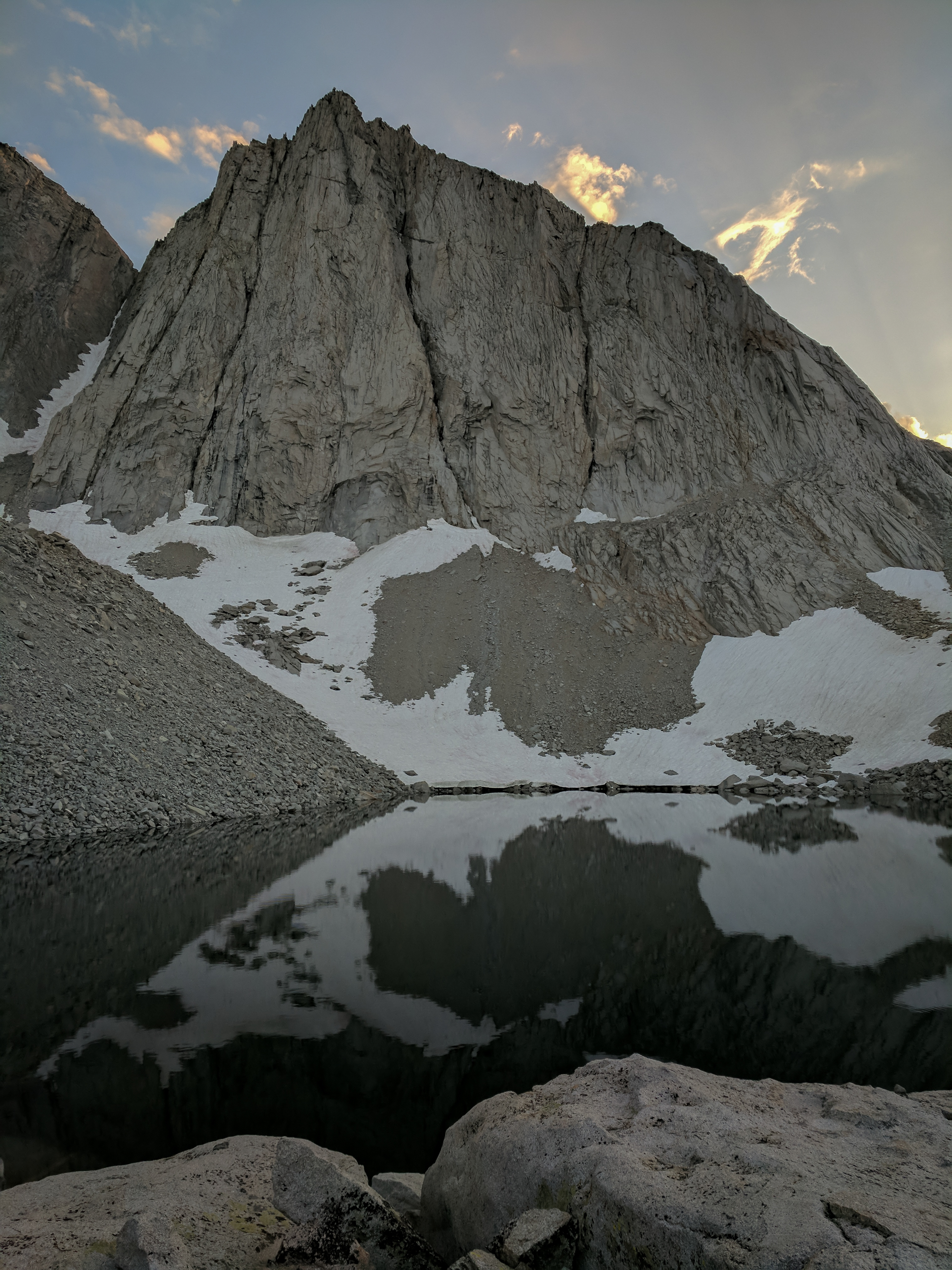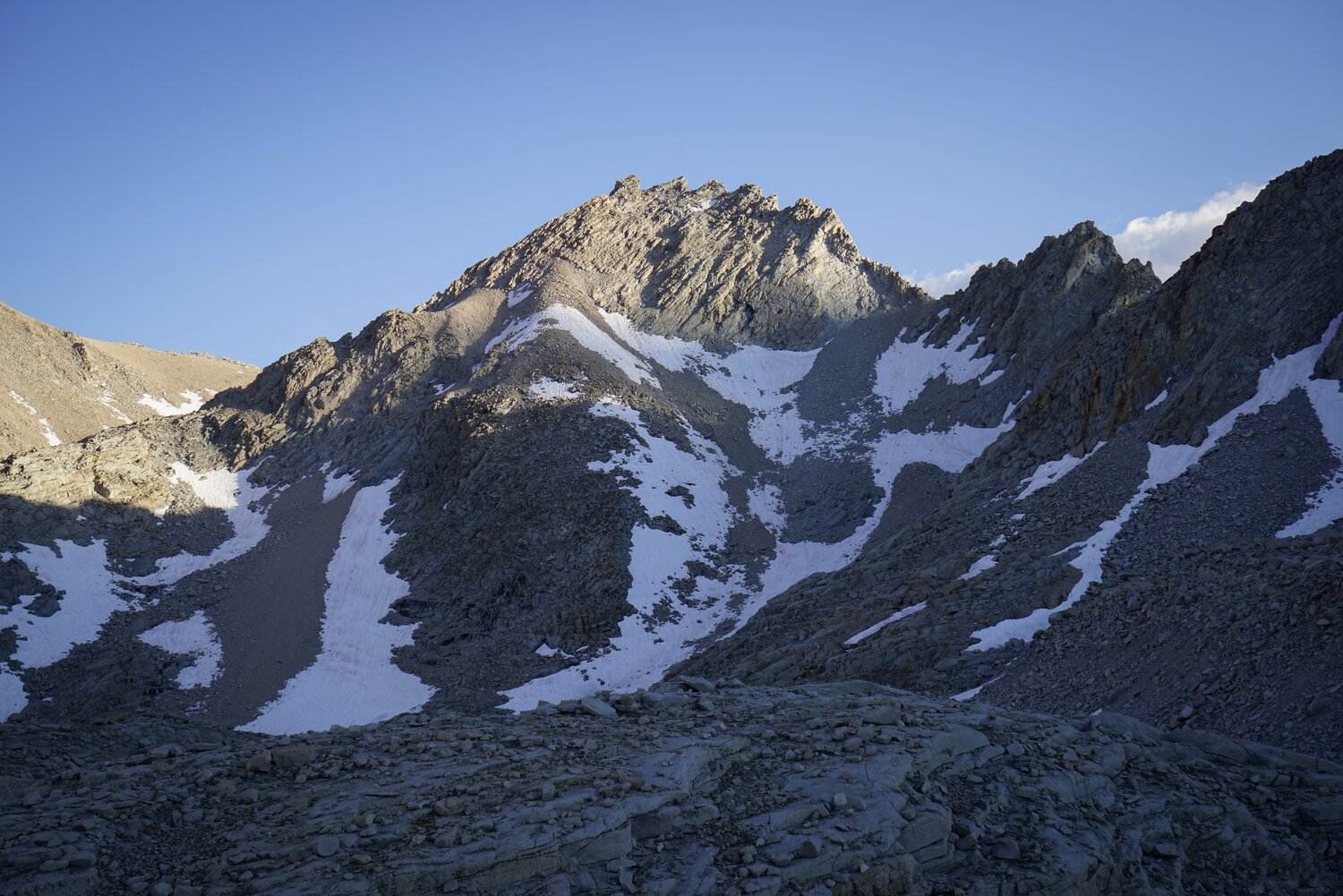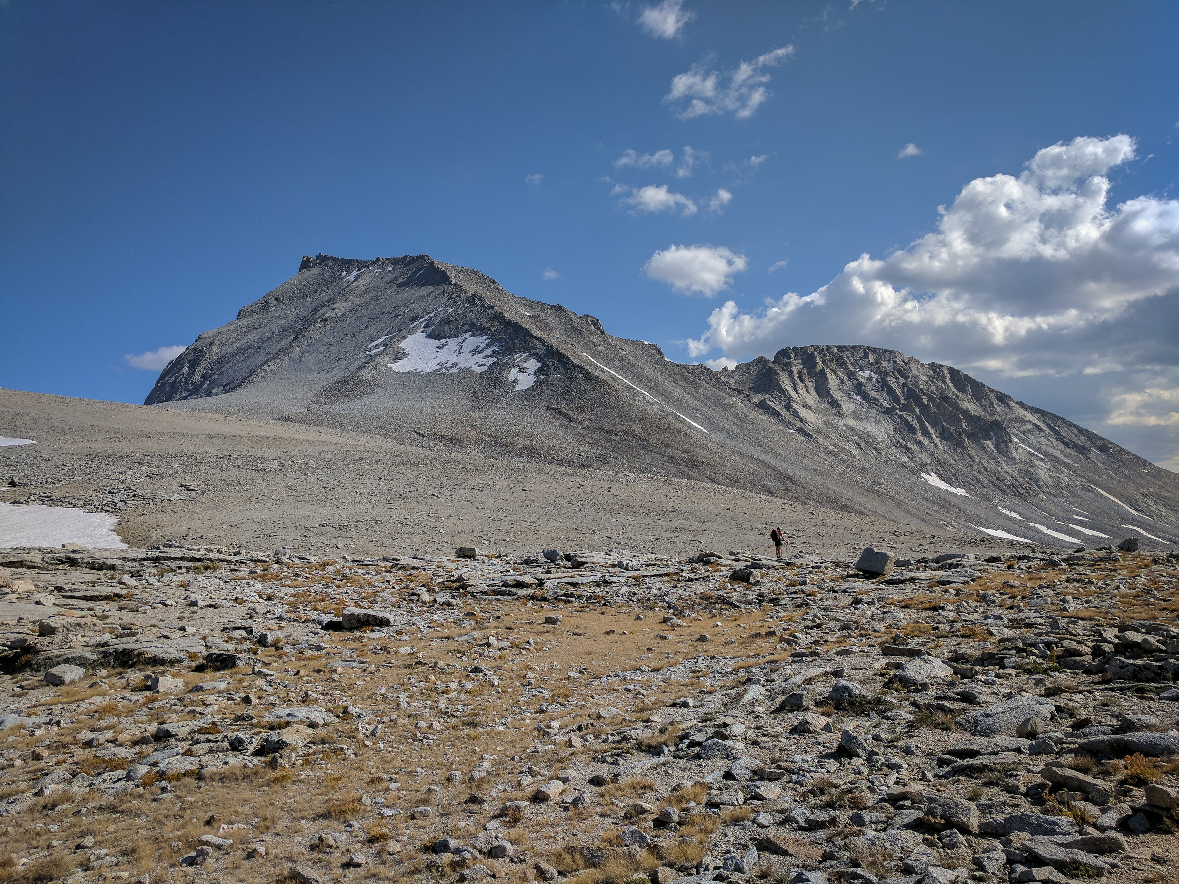 We toiled up the climb towards Shepherd Pass all day, eventually reaching the pass in mid afternoon. We were treated to awesome views of Mount Tyndall. We figured we would tackle Williamson first, the next day, and decided to drop to one of the lakes in the Williamson Bowl, hoping we could find a flat space to sleep in the talus.