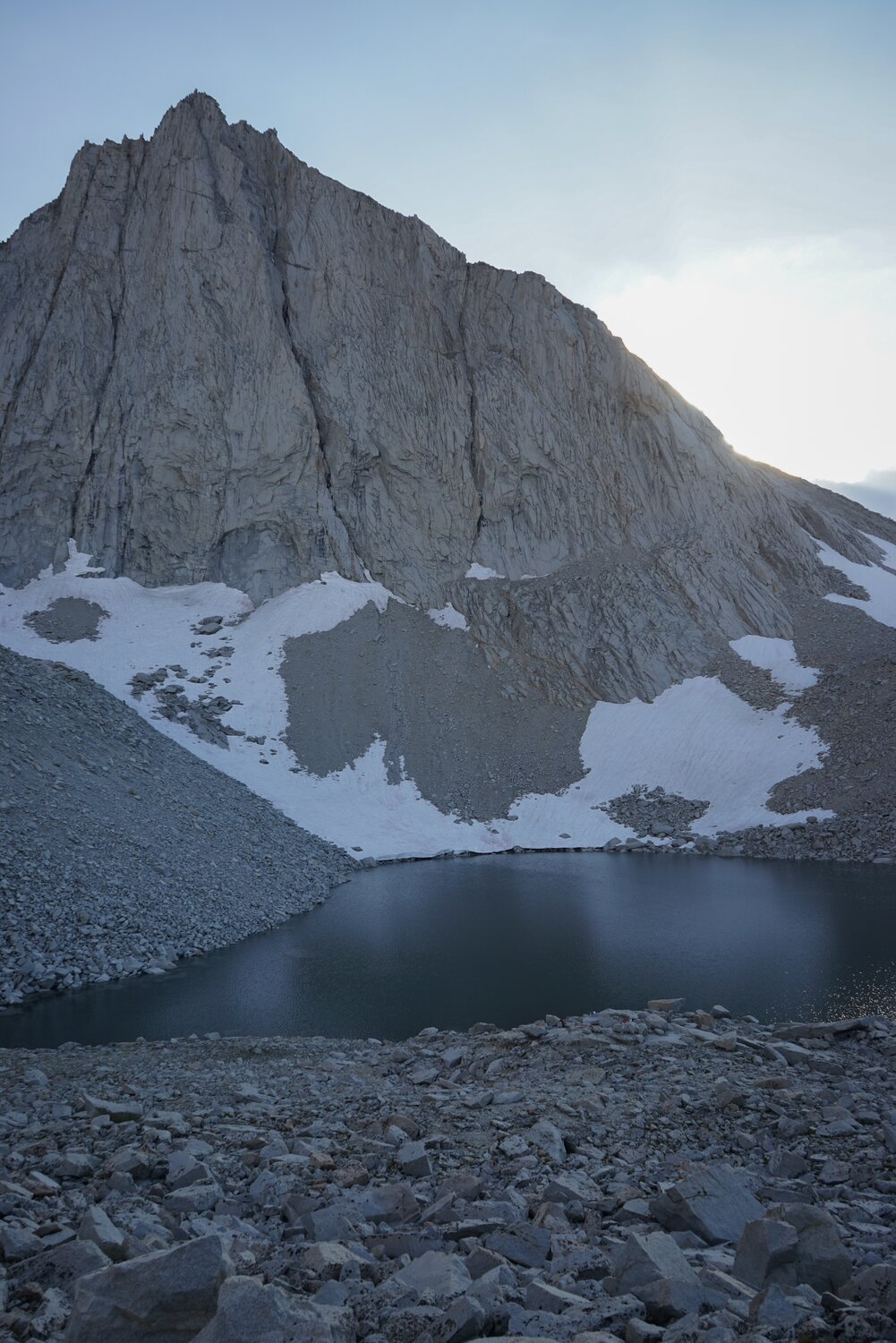As soon as we crossed the divide into the Williamson Bowl, we encountered the notorious talus. The descent to lake 3713 was slow going, but we made it and found a good place to camp at the southeast corner of the lake.