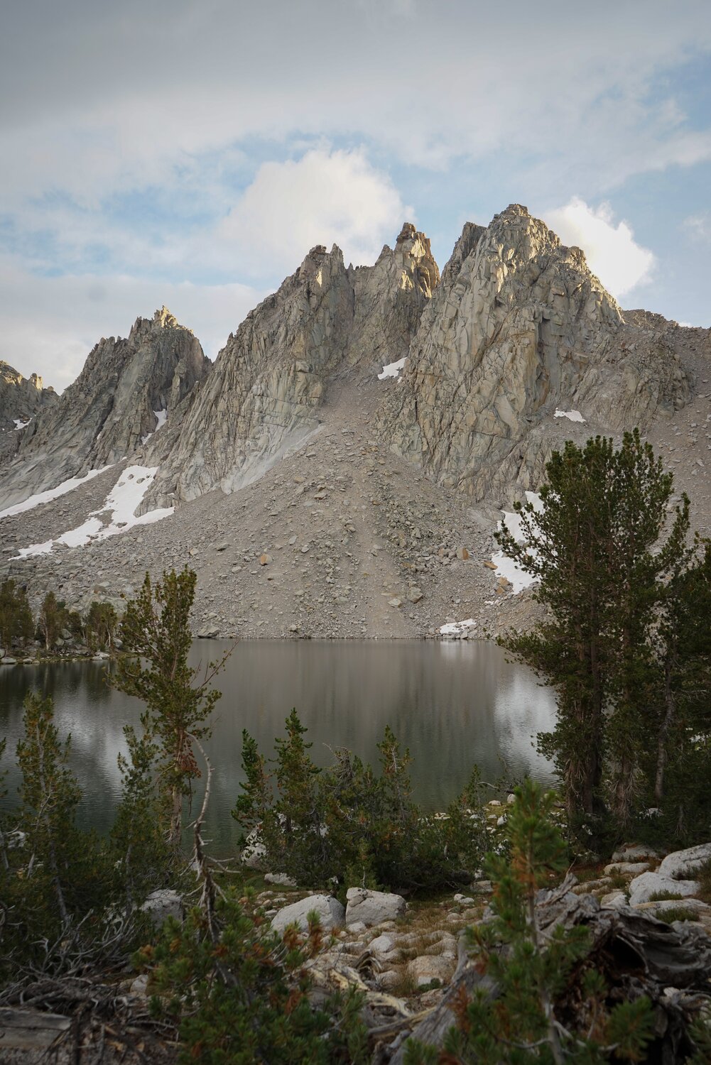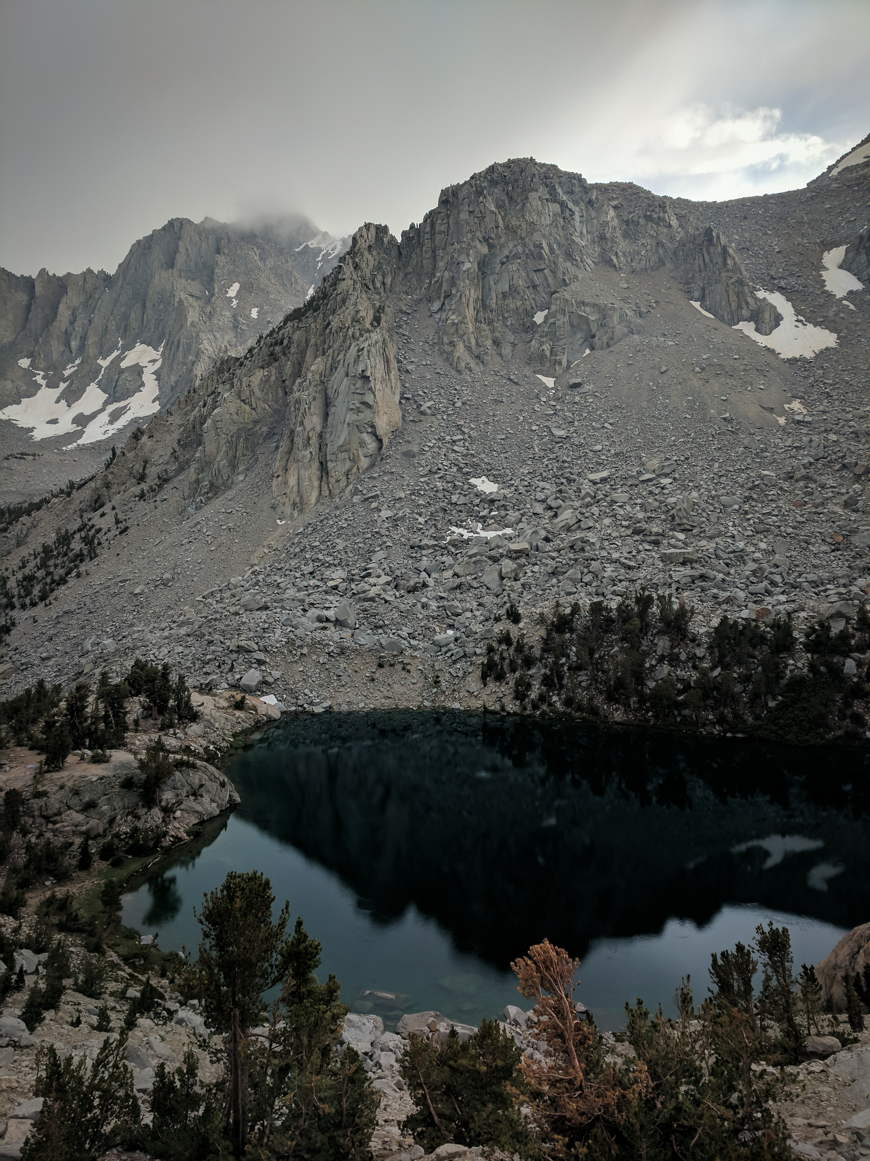 The storm looked a little bit more active to the west. We made our way down from the pass and found a campsite in the trees near one of the Kearsarge Lakes.