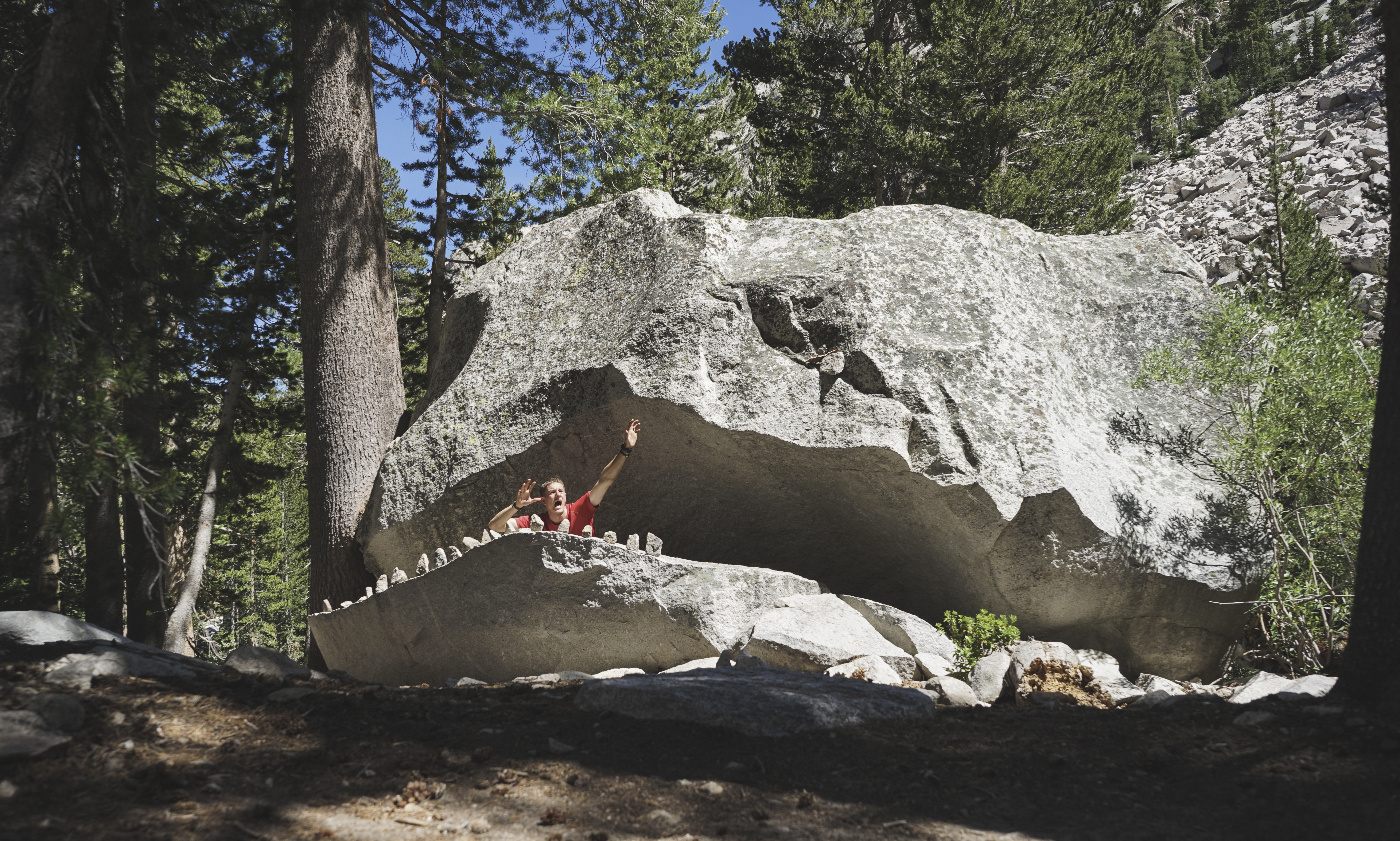 Descending Muir Pass, I starting thinking I was getting close to the famous dinosaur rock, just based on having read too many trip reports. Sure enough, I stumbled upon it about 20 miles into the day.