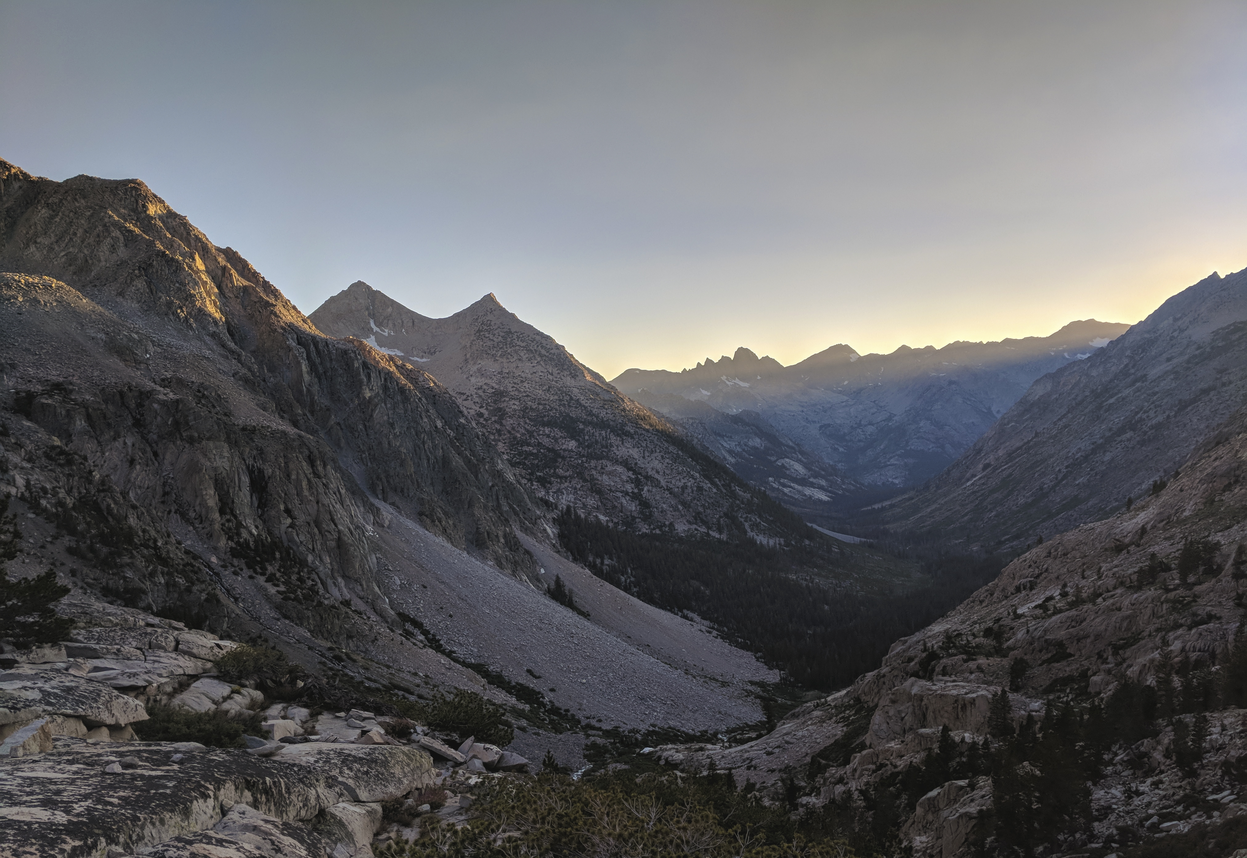 The Golden Staircase is a somewhat infamous section of the trail just below Palisade Lakes where the trail climbs over 1,500’ in a bit under 3 miles. The trail is mostly stone stairs here, and passes through a few narrow gaps in the rock with very tight switchbacks. Many find this to be one of the tougher sections of trail. After hiking over 32 miles, it was pretty brutal. But there aren’t any places to camp along this section, so my options were to descend back to the river valley and deal with the mosquitoes and climb this section tomorrow, or to push on to Palisade Lakes. I opted for the latter, making it to the lakes just before sunset. Here’s a view looking back down the Palisade Creek Canyon during the peak of the golden hour.