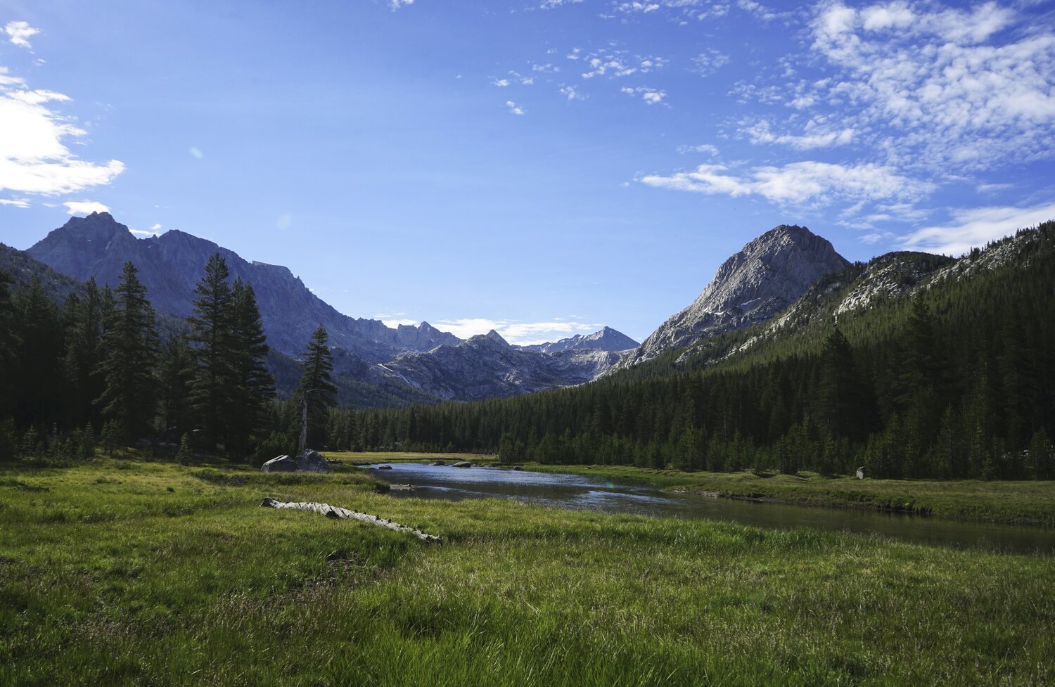 The view just out the front door of the McClure Meadow Ranger Station. Here, the Evolution River winds lazily through a meadow in a valley of high peaks, with The Hermit and the path up to Muir Pass at the head of the valley.