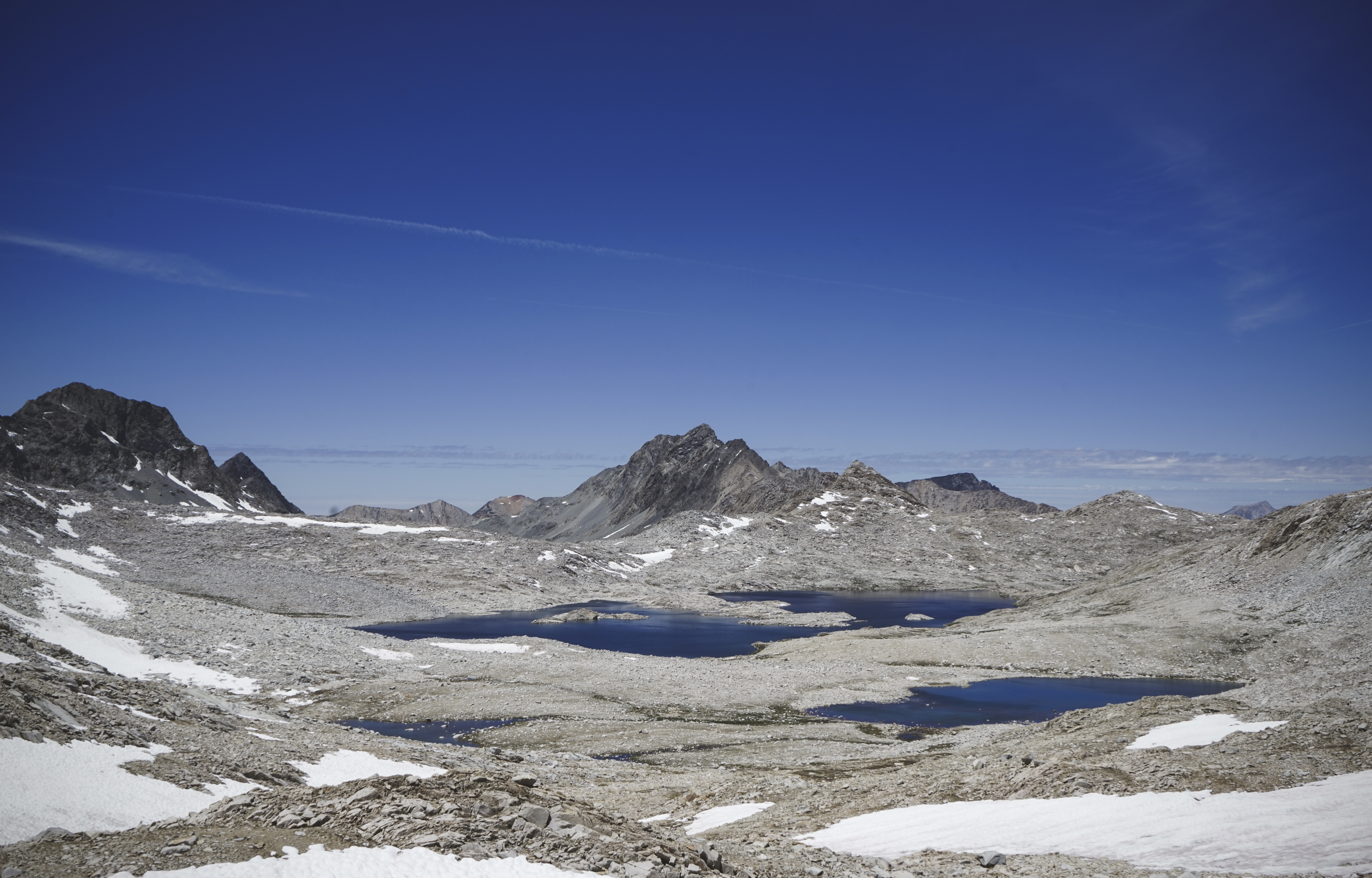 The view north from Muir Pass. The larger lake is Wanda Lake. For some reason, the peaks to the west of this area (the Mount Goddard area) were composed of much darker rock than the granite peaks all around, which provides a nice contrast.