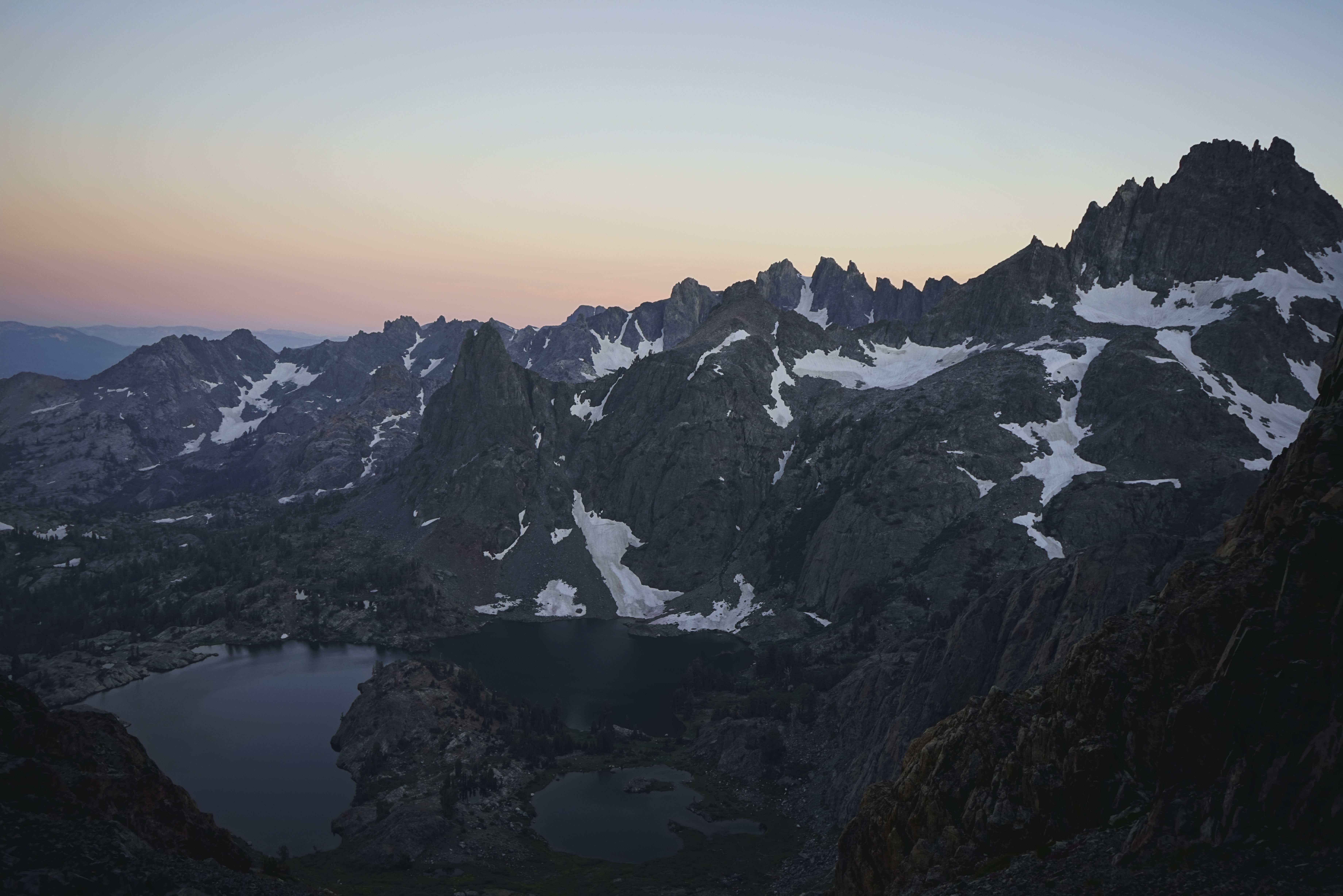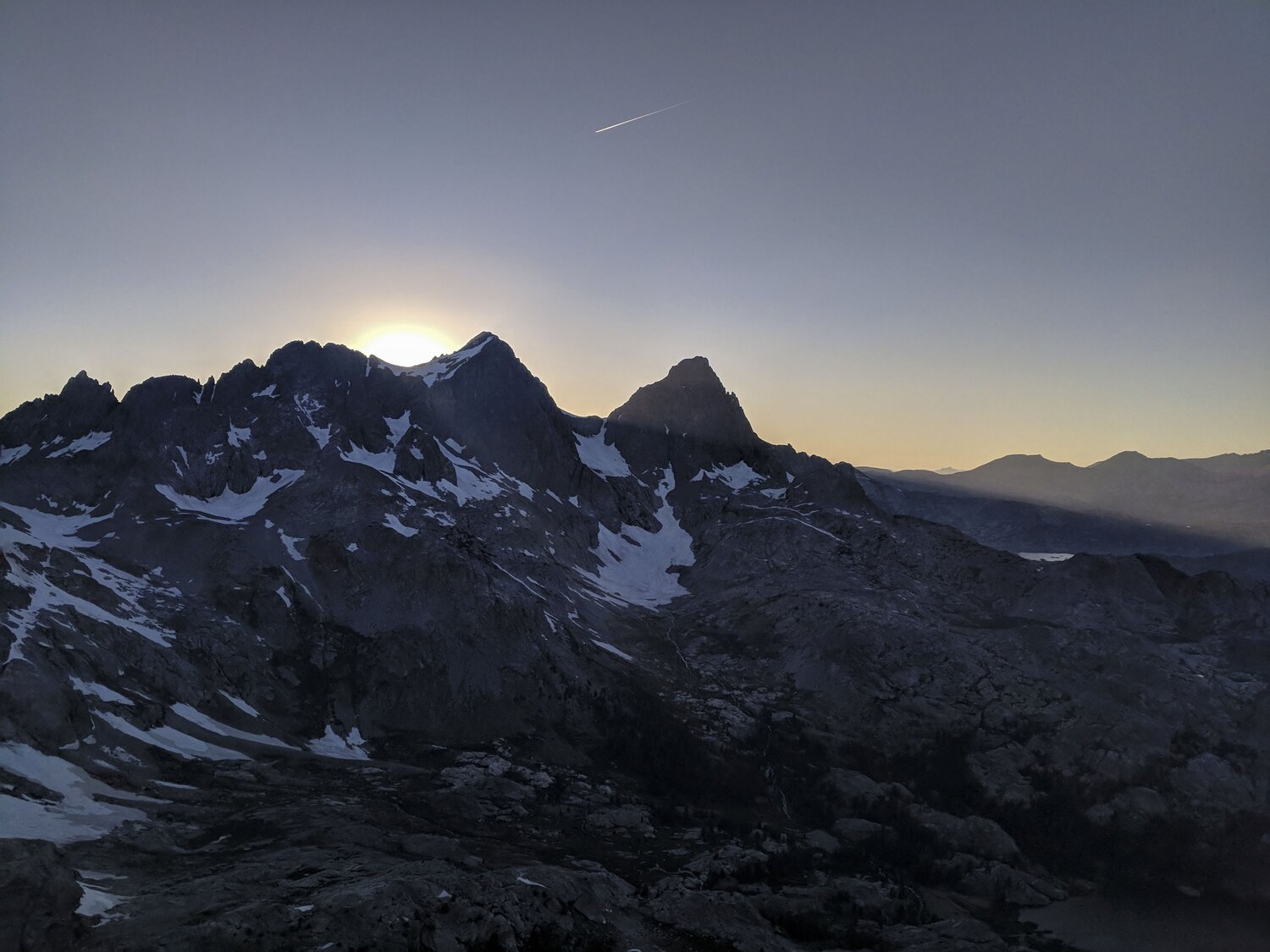 Just after the sun dropped below Mount Ritter (the high point just left of center) and Banner Peak (center). You can just see the west tip of Thousand Island Lake peaking out to the right.