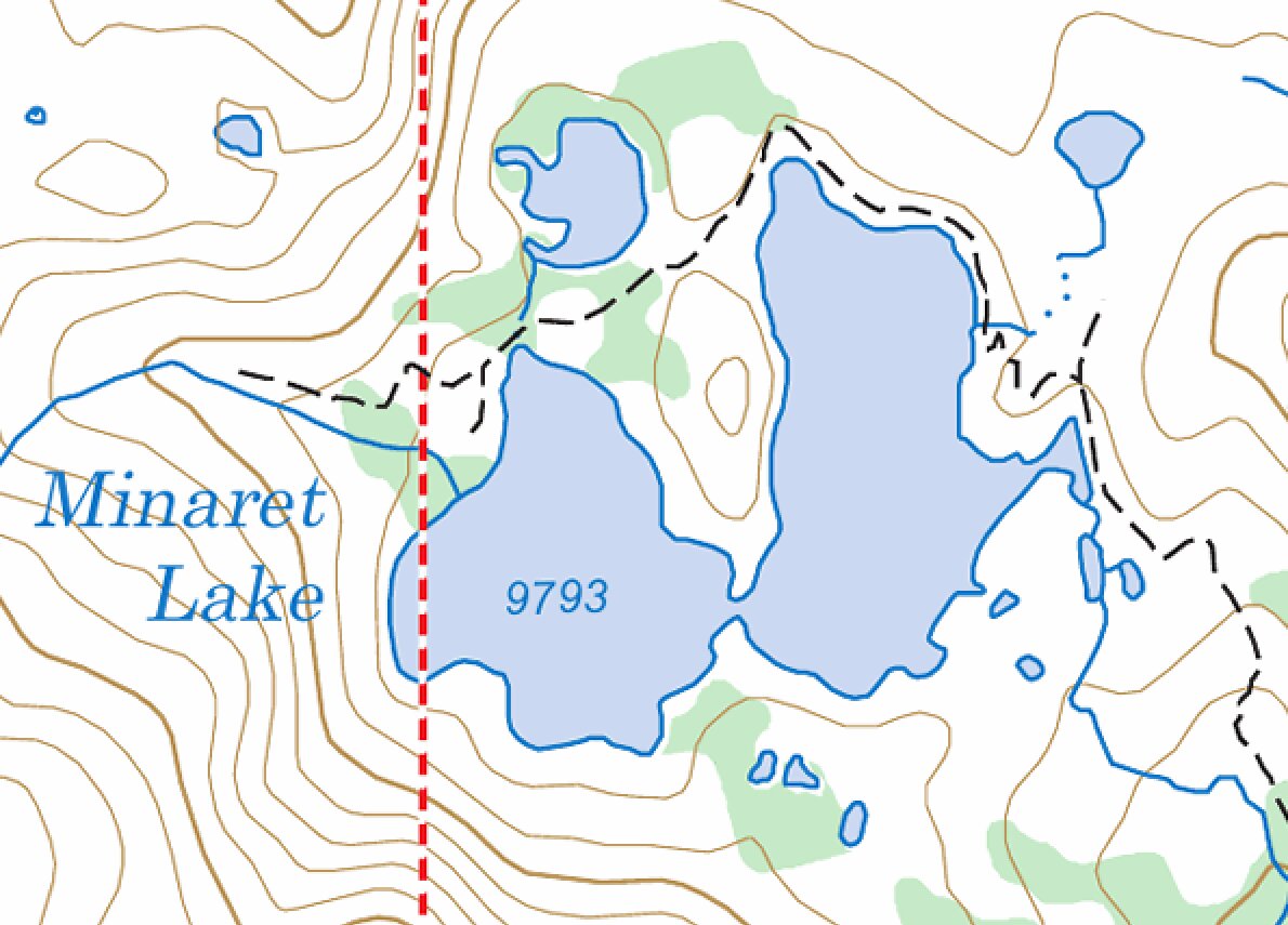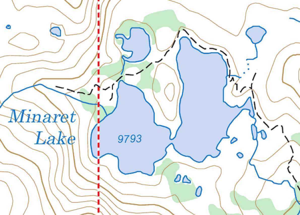 We made it to Minaret Lake around 3:30 and checked out the north side of the peninsula that nearly divides the lake in half. I was hoping there would be a nice campsite somewhere on this peninsula, but it was a bit too steep and rocky. Instead we camped in between the lake and the little pond to the north.