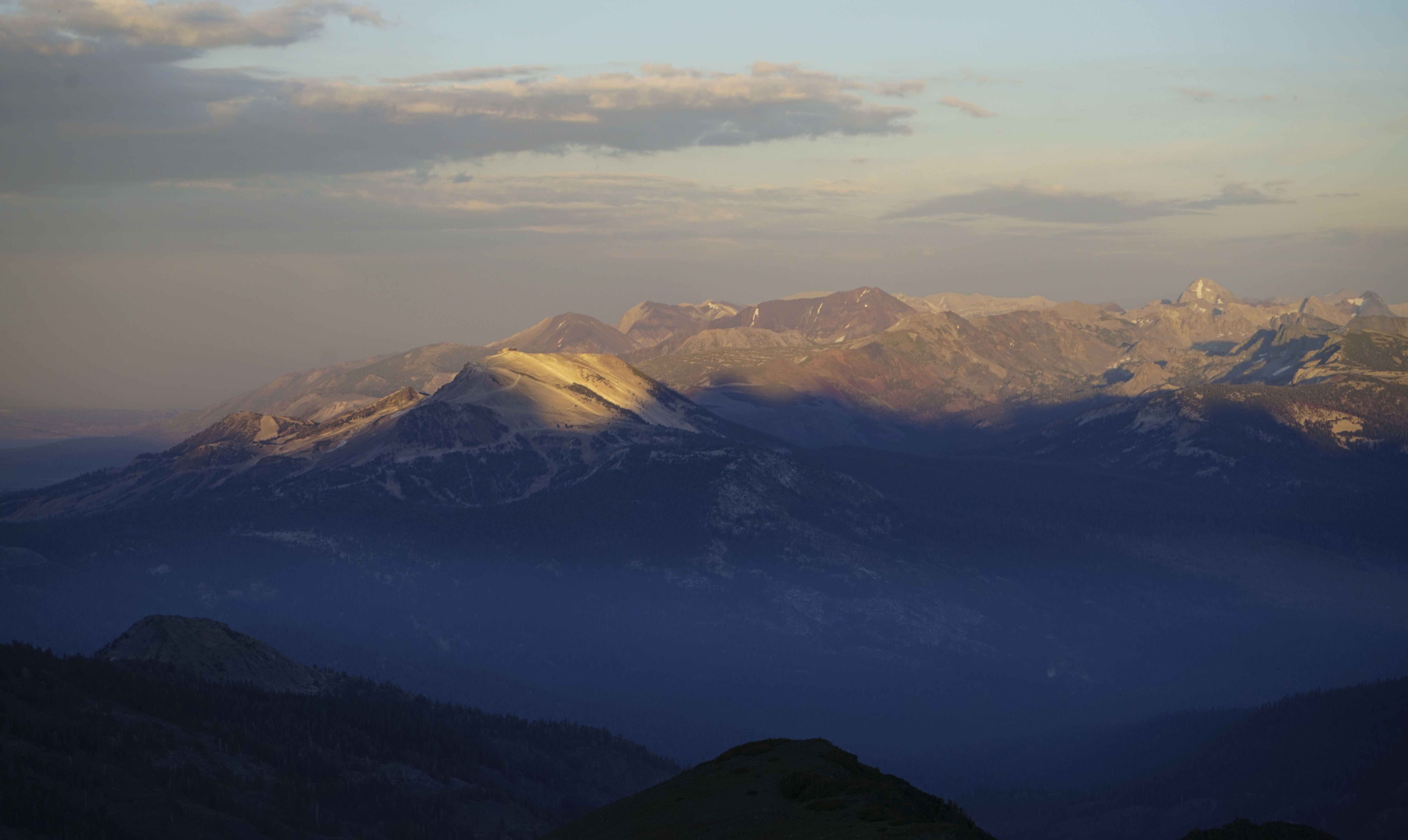 Sunset looking back east over Mammoth Mountain. I believe the tall peak to the right is Mount Abbot, but I haven’t confirmed that.