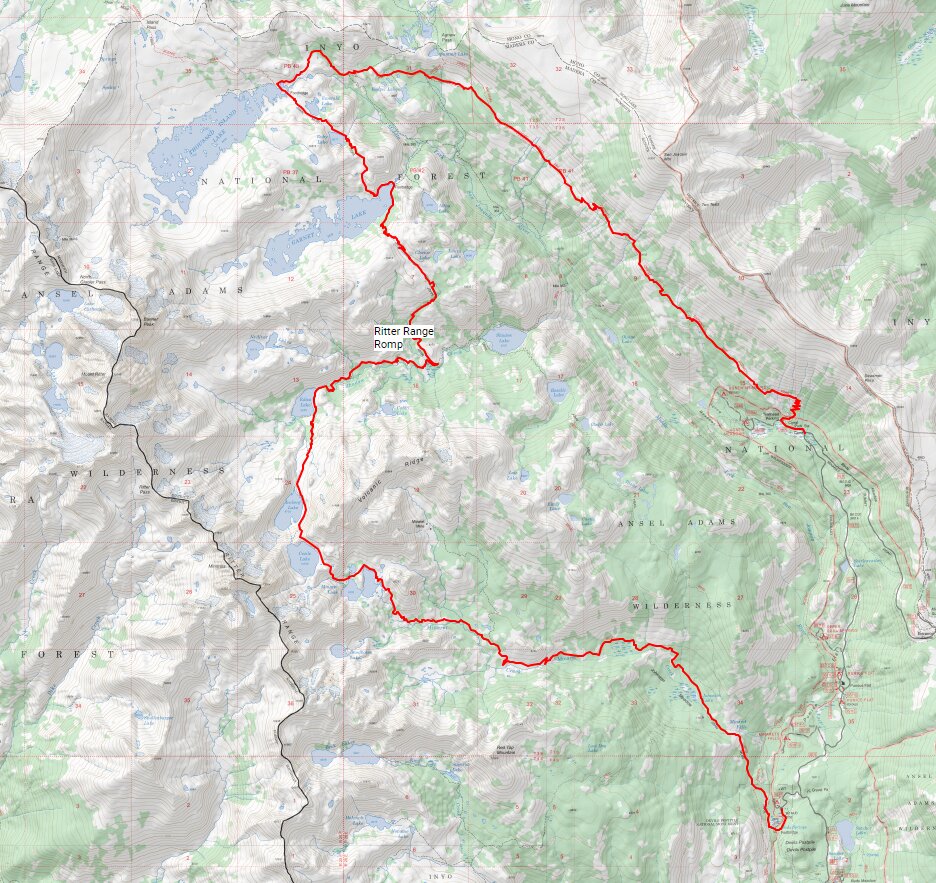 Our plan was to head from Devil’s Postpile up to Minaret Lake, camp there for a night, then continue over the saddle past Cecile Lake, down to Iceberg lake before rejoining the JMT and heading north to Thousand Island Lake. We would camp there for a couple of nights and head up to Lake Catherine to see about climbing Banner Peak or Mount Ritter on the third day. On the last day, we would hike back along the PCT to Agnew Meadows. Twenty-five-ish miles and 5,500’, which should leave plenty of time for side trips. Here’s the Caltopo map.
