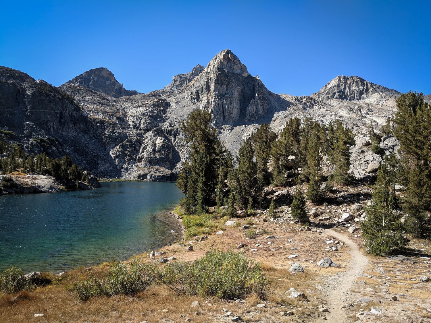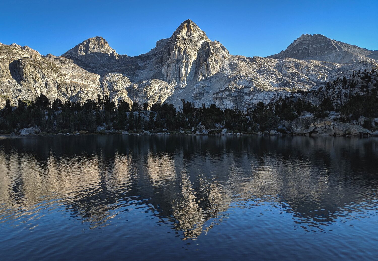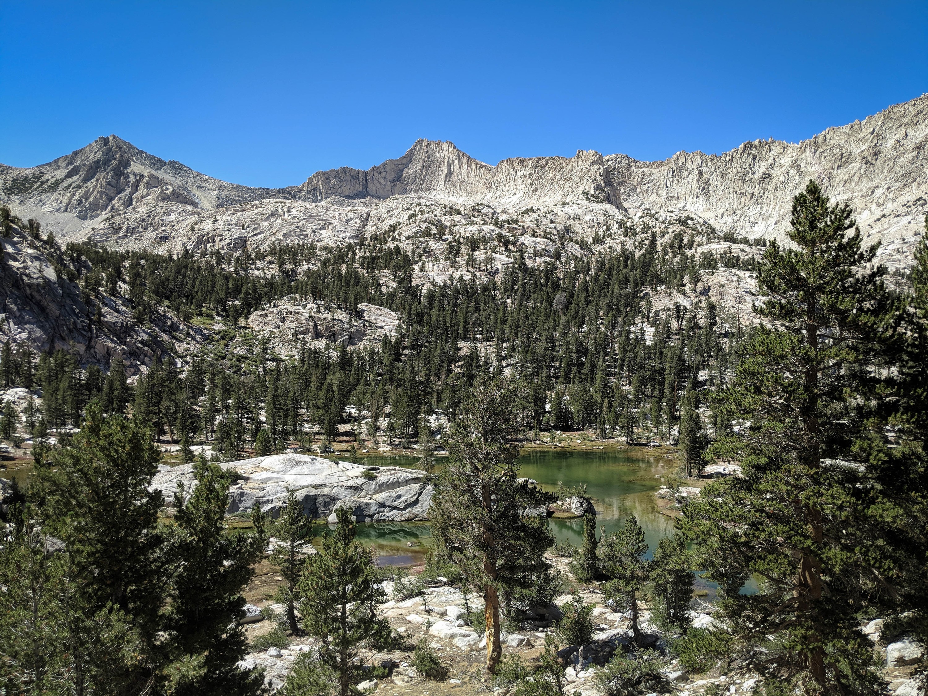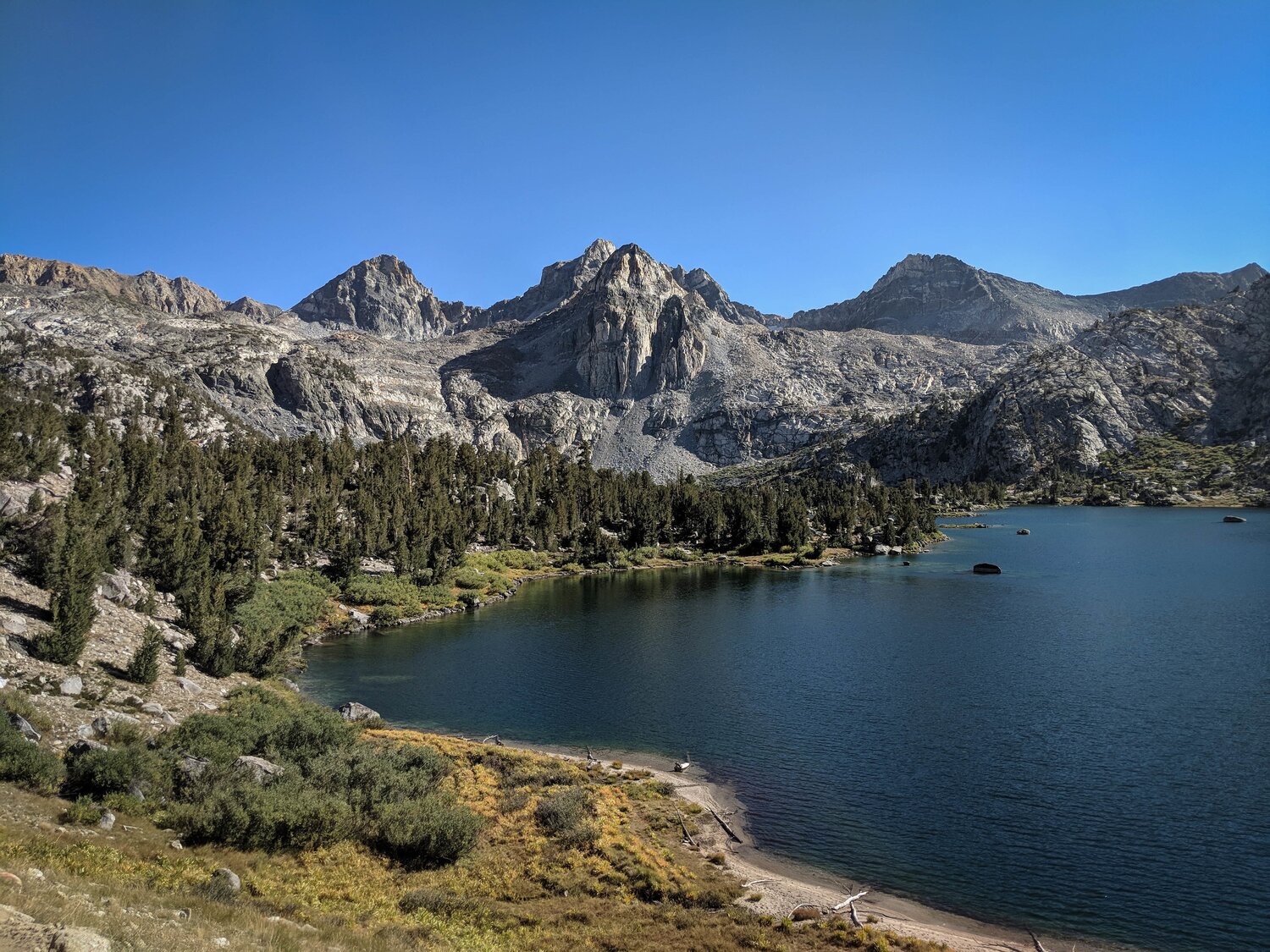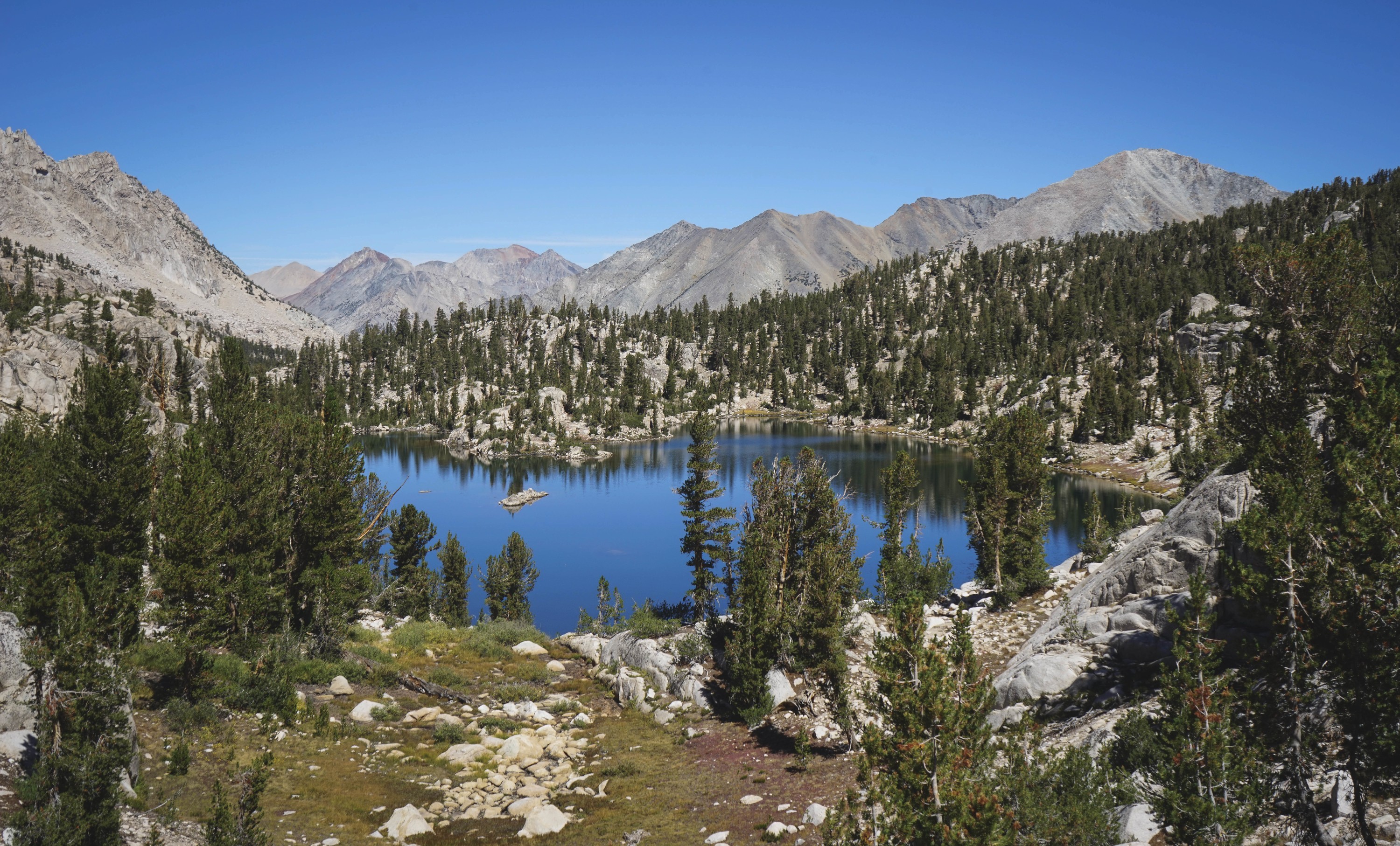 Eventually we found our way back to Rae Lakes, enjoyed a dip, and moved on to get a picture from the high peninsula near the ranger station.