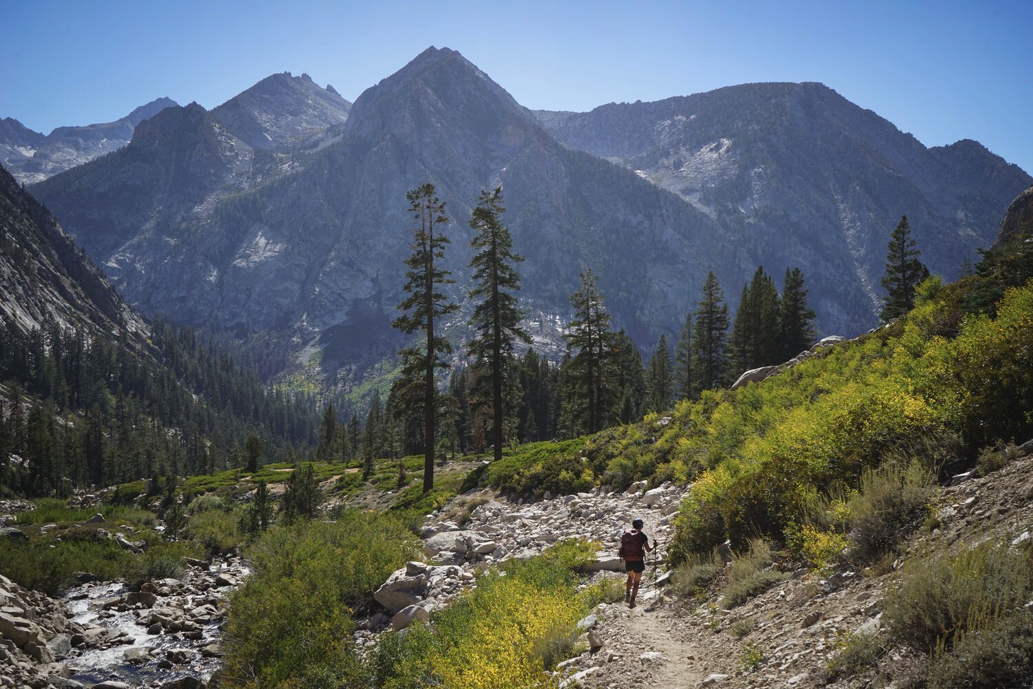 Descending the Bubbs Creek trail towards East Creek, which joins in the valley at the left of this picture. The willows and aspens were just beginning to change color, hinting that despite the warm days, fall was just around the corner.