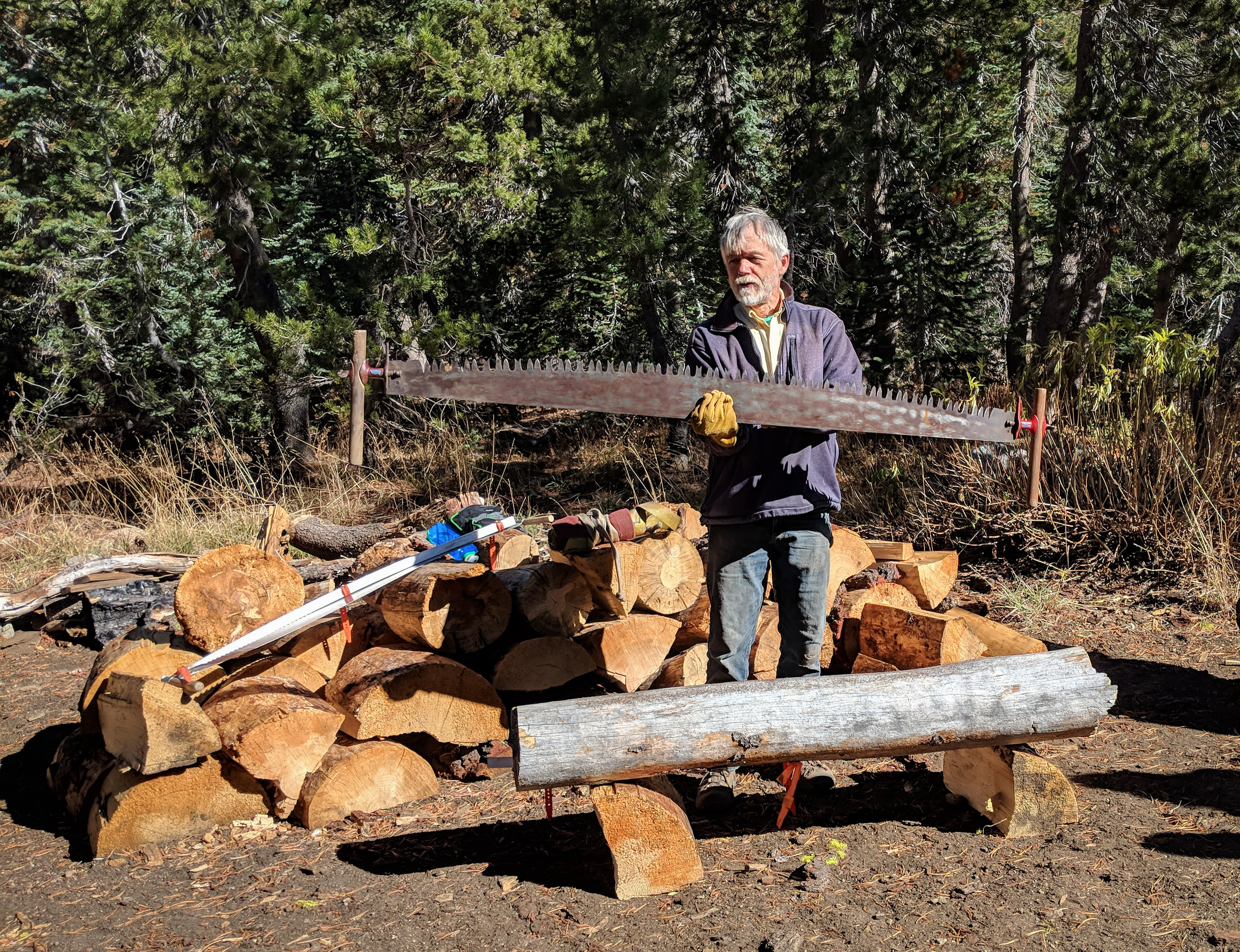 The mile and a half to the hut took us about 40 minutes after which we had more lessons about how to safely cut and haul logs. Here’s hut coordinator Dick Simpson explaining how to use a crosscut saw.