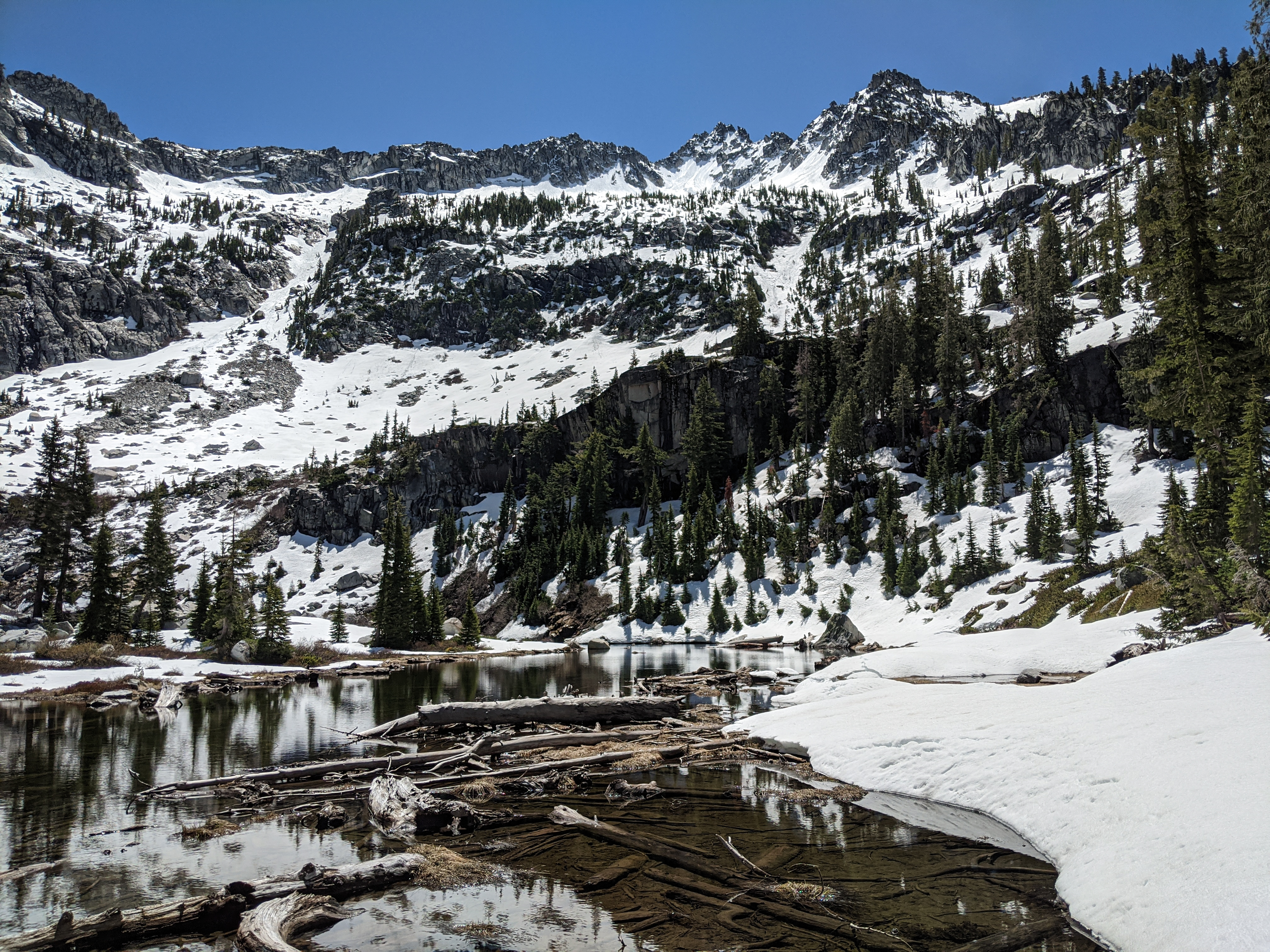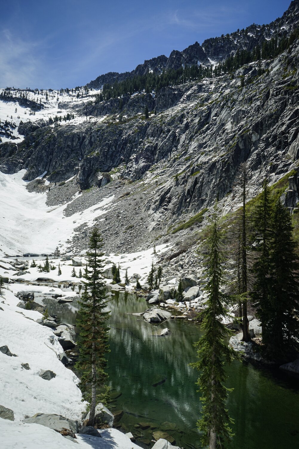 I found a nice spot to set up camp and hiked up to Forbidden Lake to get a look. It was quite snowy once I got into the little cirque that the lake sits in.