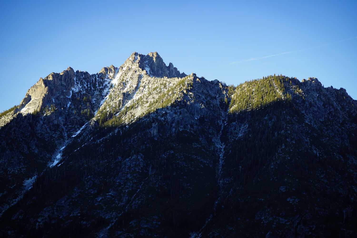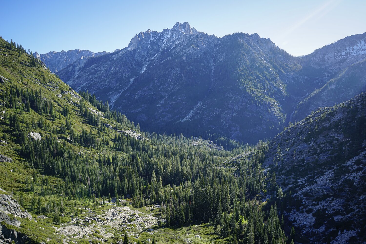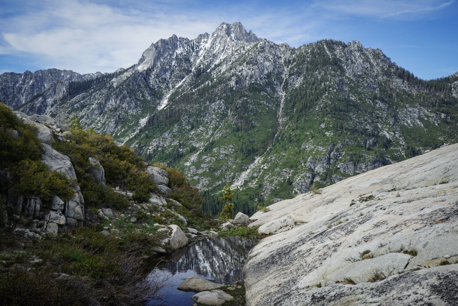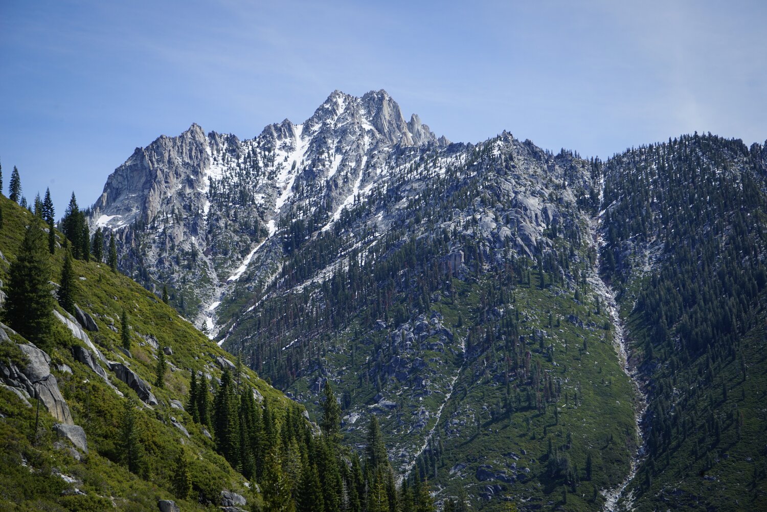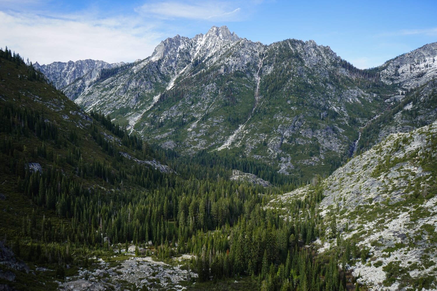 After a lovely walk through Upper Canyon Creek Meadow and then up a steeper section, snowy Wedding Cake and Thompson Peak appeared on the ridge high above.
