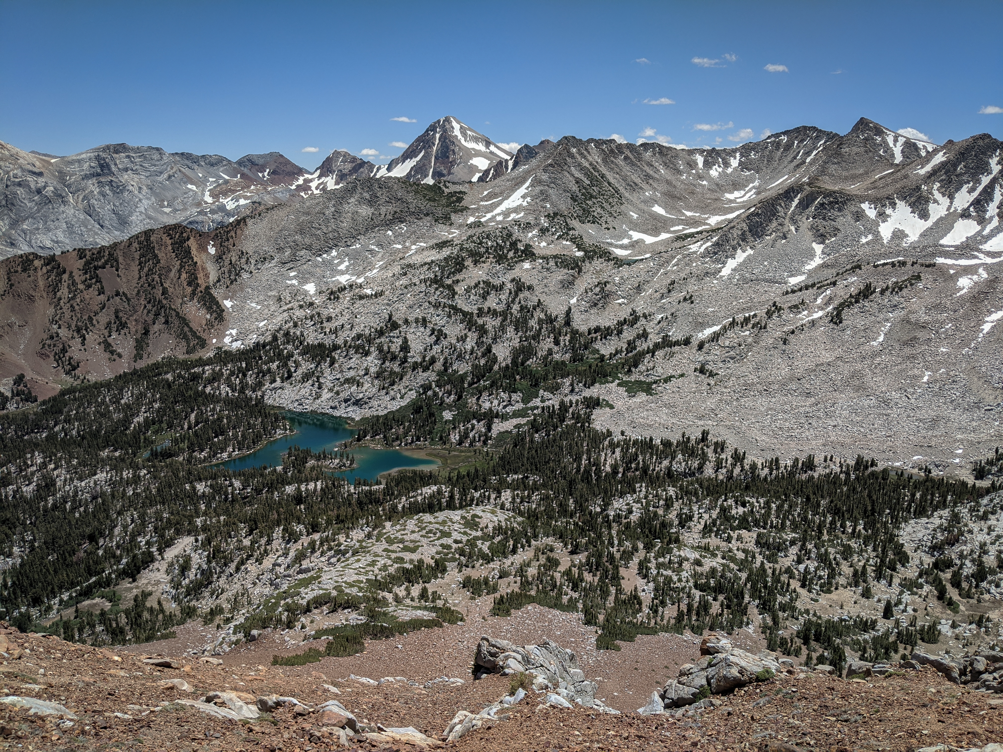 My GPS indicated I had already over 12 miles by the time I reached the summit. I wasn’t too keen to follow the circuitous route back down the ridge and around to Lake Genevieve, plus I had a good view of the south slope on my way up, so I decided to try and descend that way directly to Cloverleaf Lake. I figured if it went it would save me an hour or so on the way back.