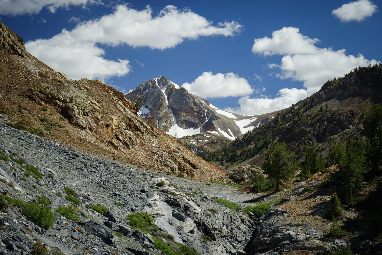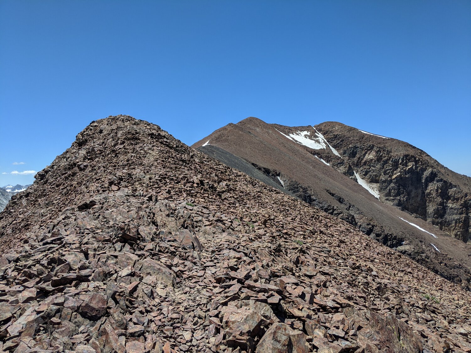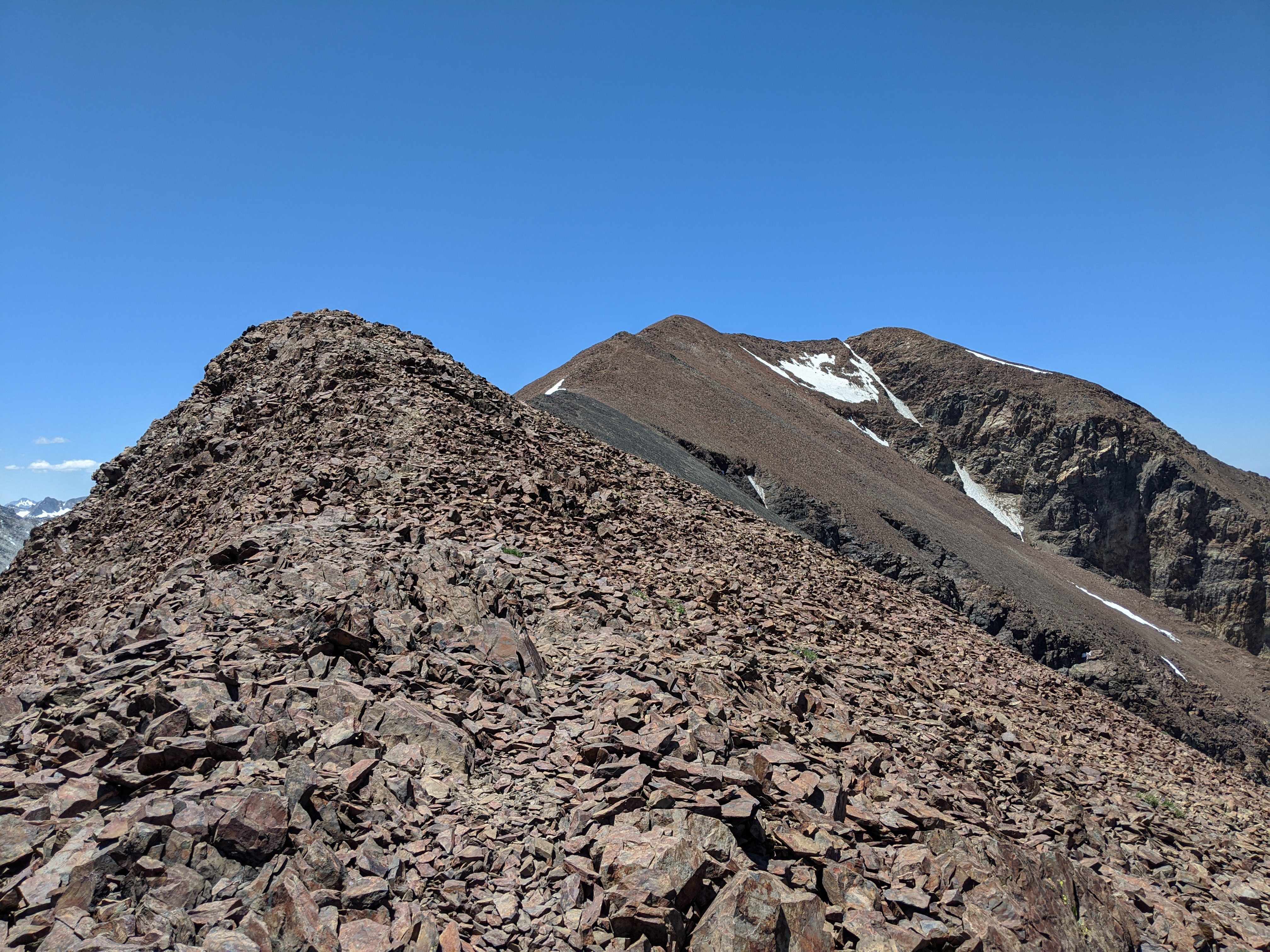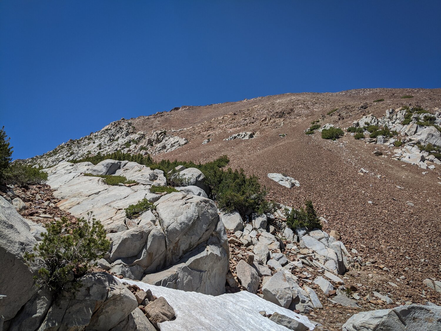 The view back up the South Slope that I descended. I came through the narrow gully in the white rock rather than following the red rocks to climbers right because I thought it’d be better to downclimb semi-solid rock than try to walk across loose rock on top of a cliff. I wouldn’t recommend this as an ascent route for this peak.