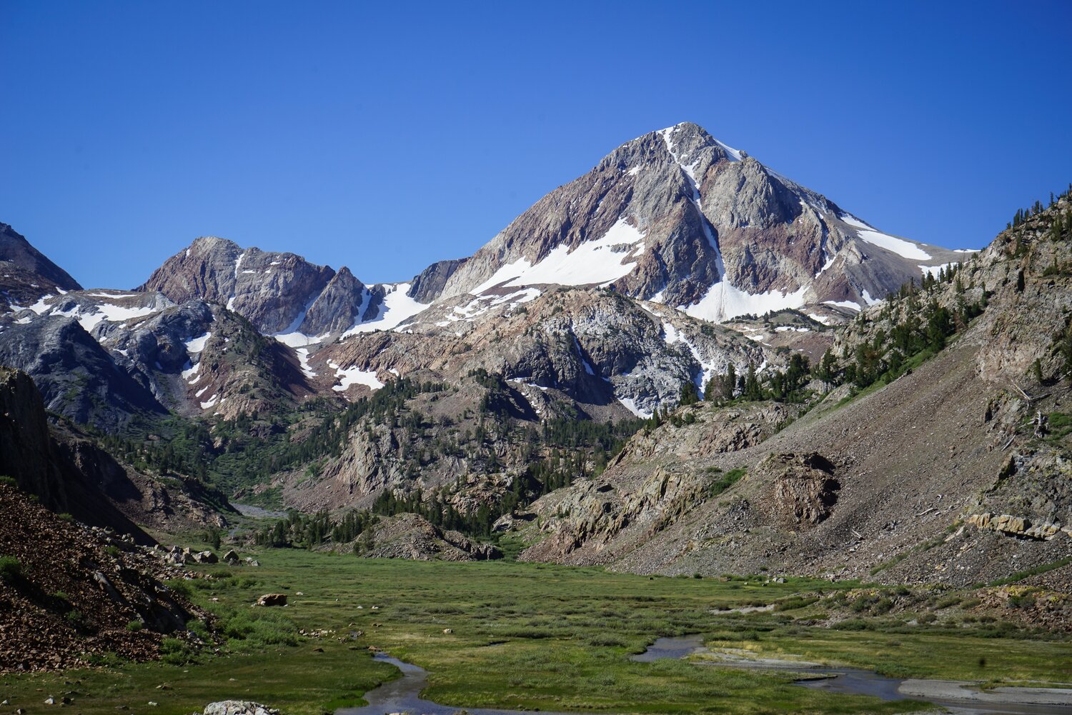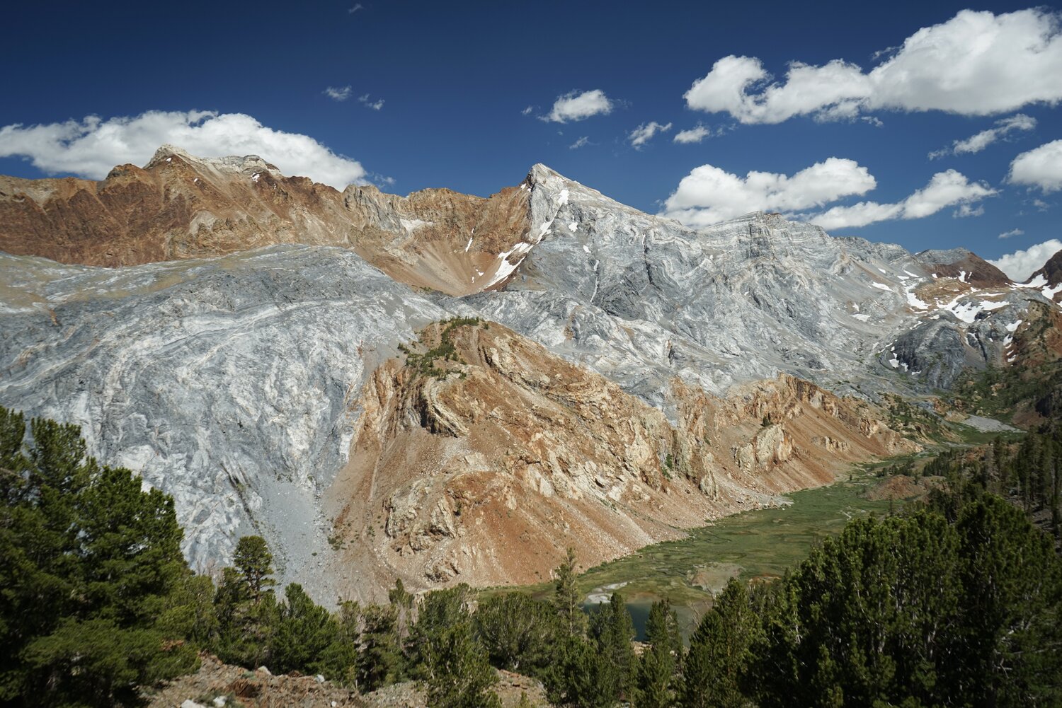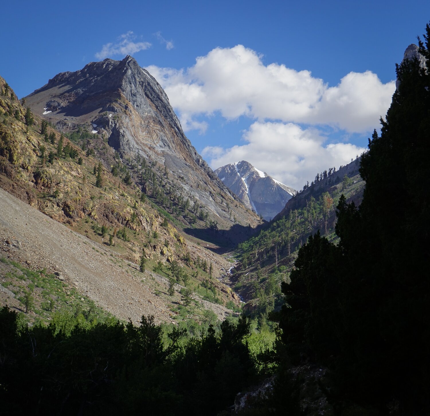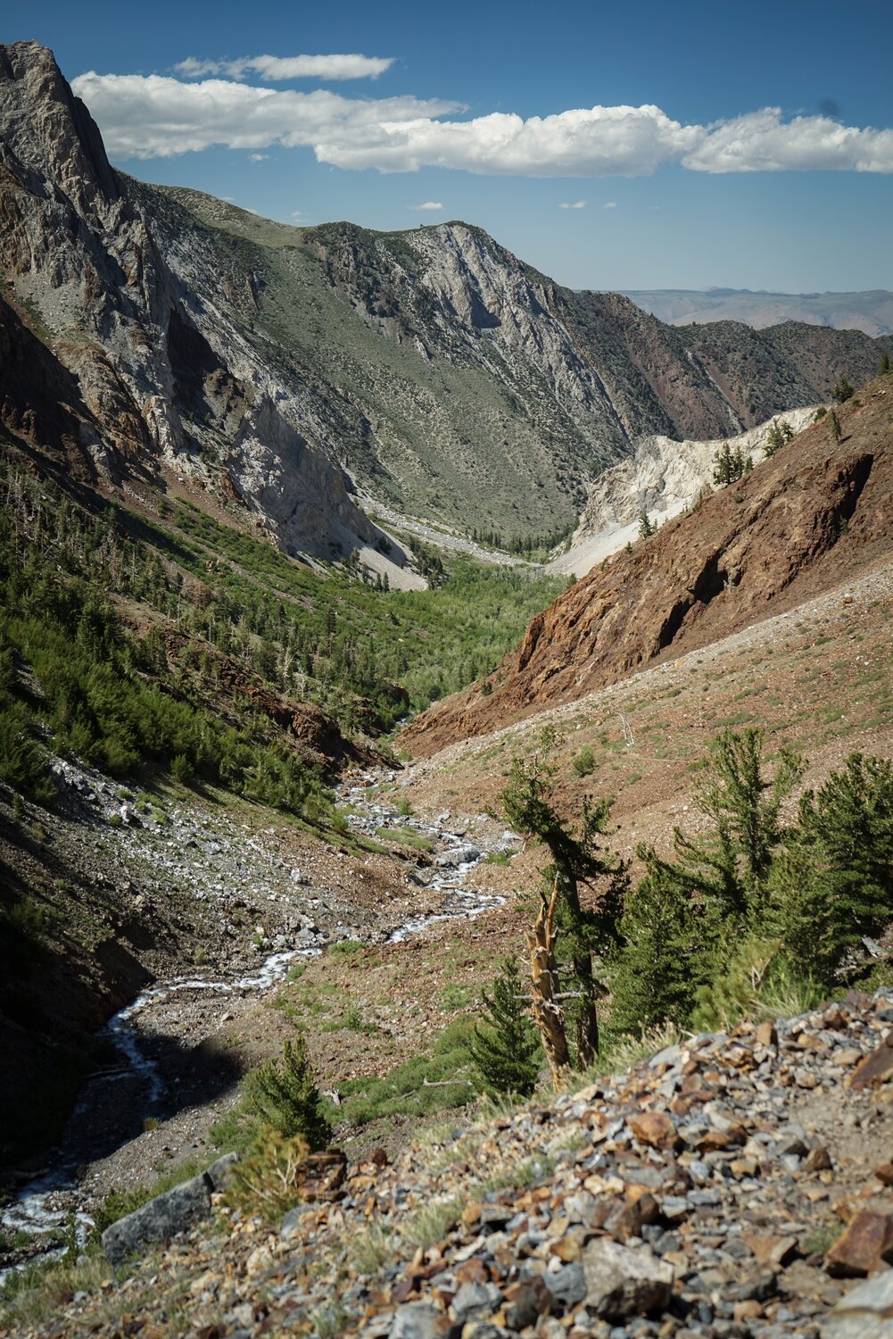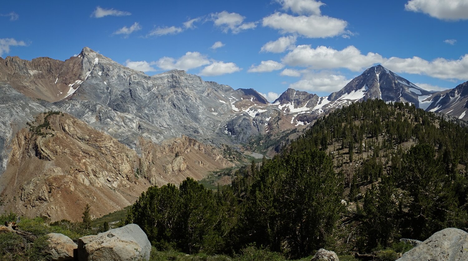 As I descended, some small clouds came in and made some nice light conditions. Here’s Mount Baldwin, Red Slate Peak, and the valley through which Convict Creek runs from above.