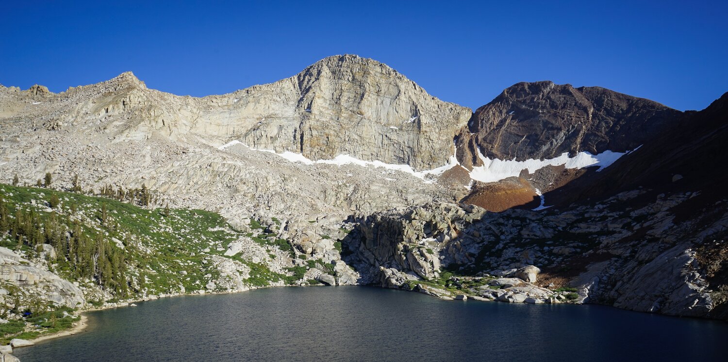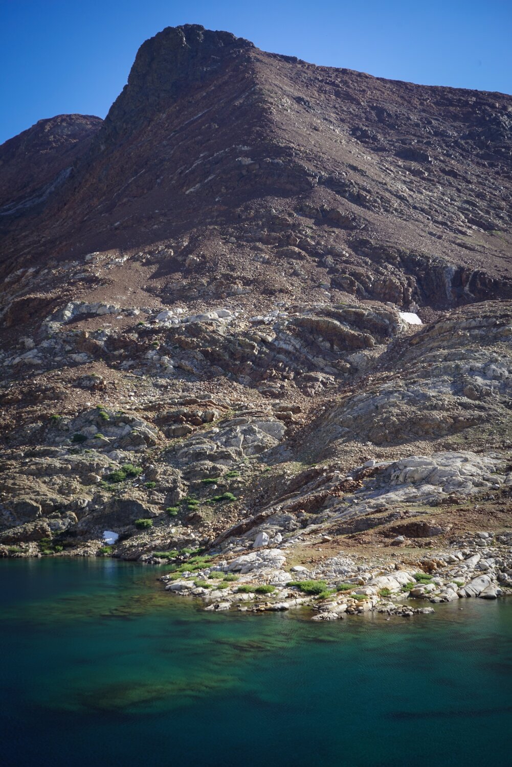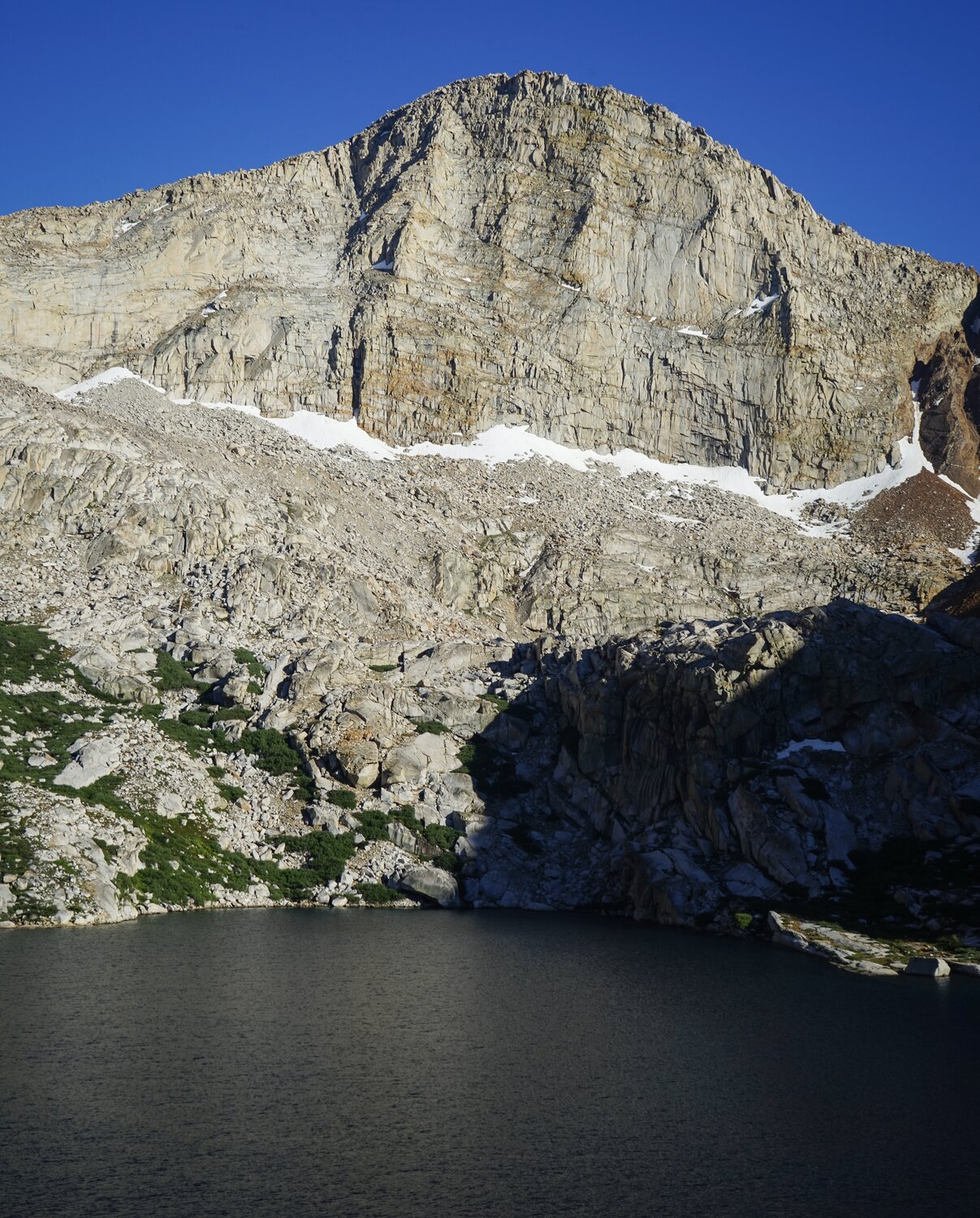 At about four o’clock we reached the lower Franklin Lake and started looking for a place to set up camp. We figured we wouldn’t have the time to get over Franklin Pass today. We found a good campsite not far off the trail on some benches high above the lake.