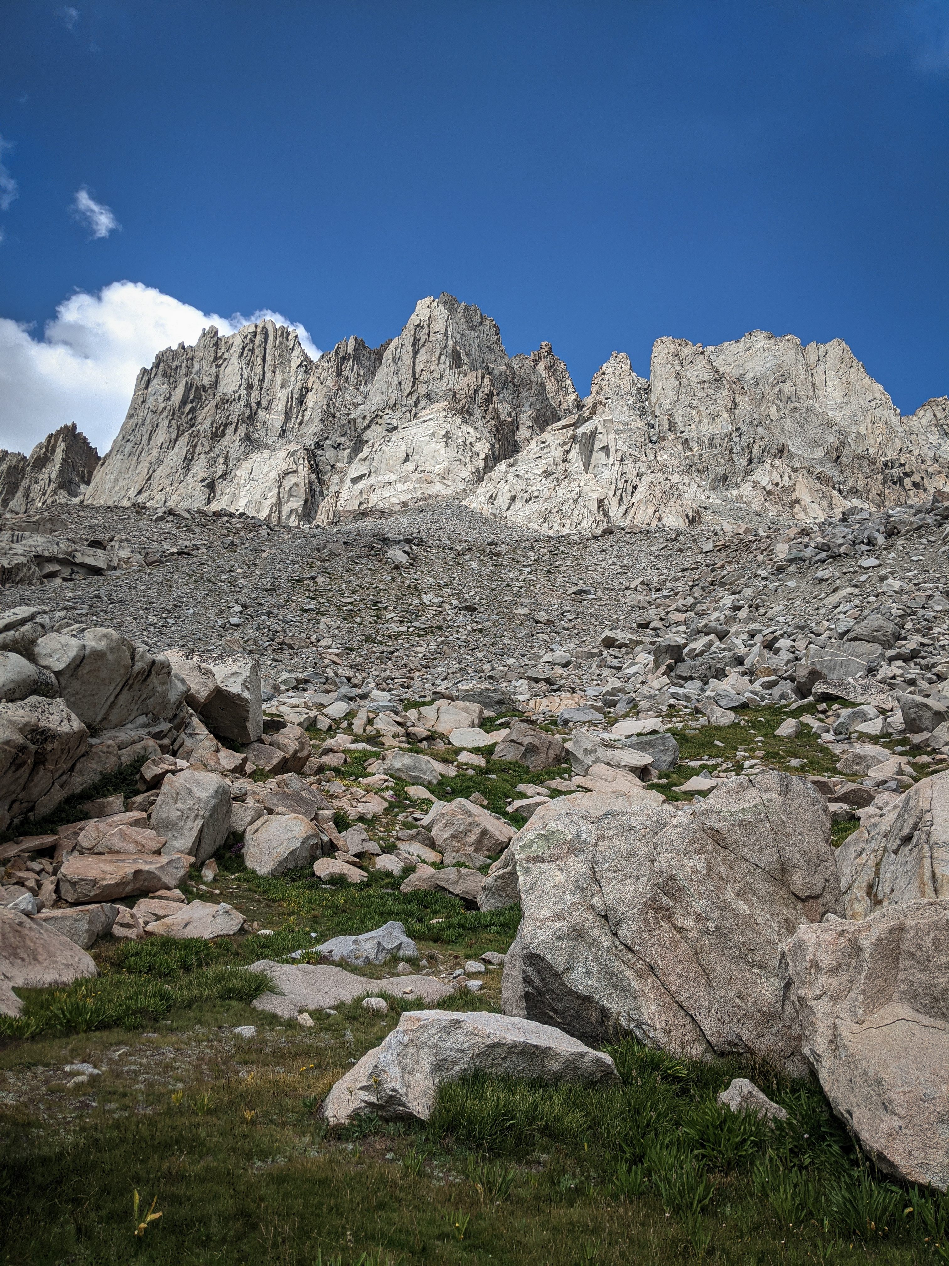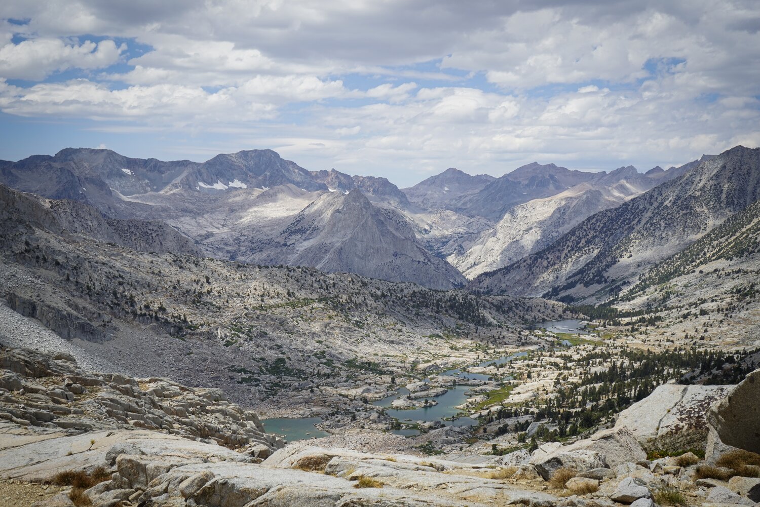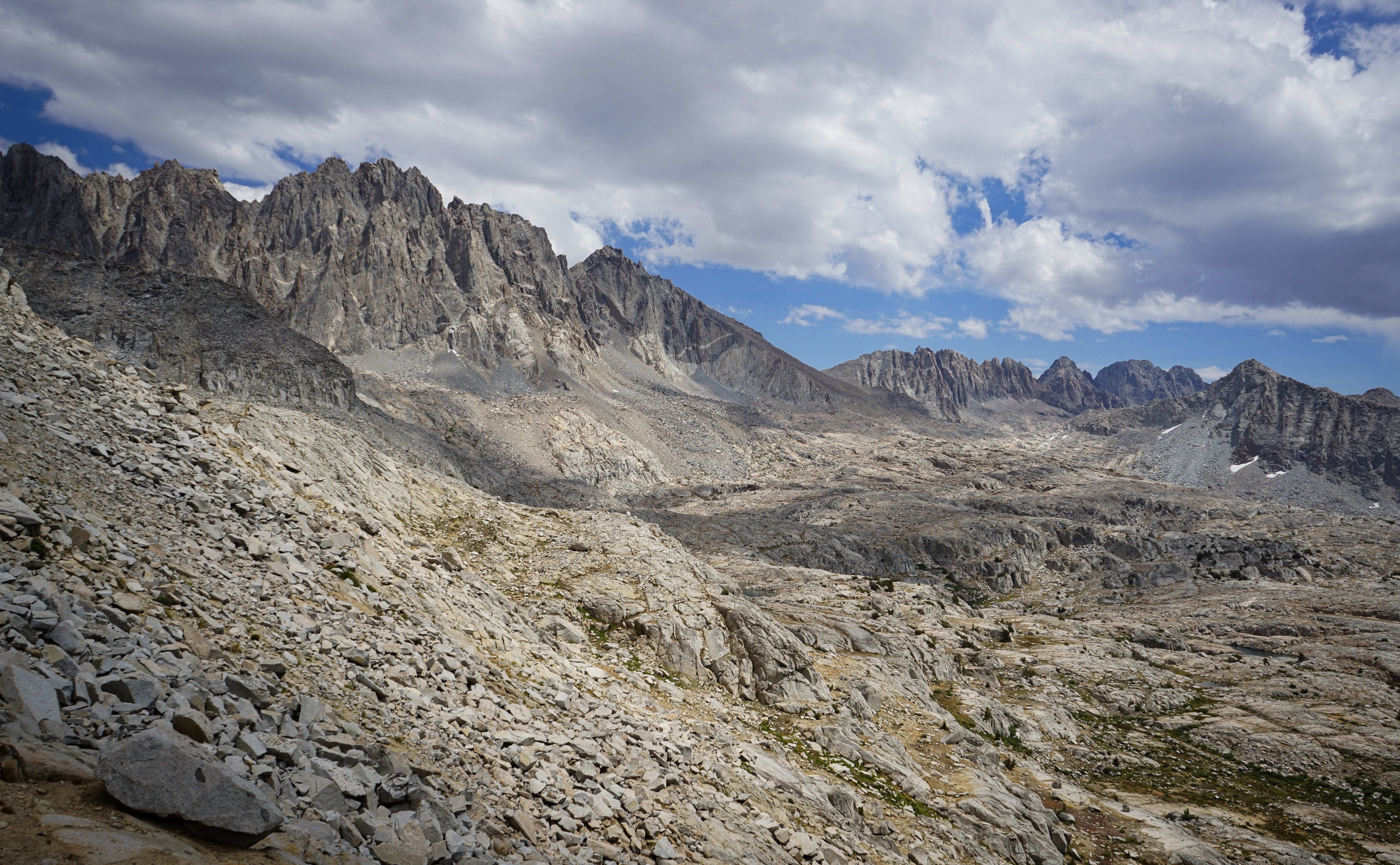 Bishop and Saddlerock Lakes, and even Mount Humphreys, from Bishop Pass. The hike to the pass went by without incident. We saw groups heading up and down. The afternoon thunderstorms the previous day gave some people a bit of excitement.