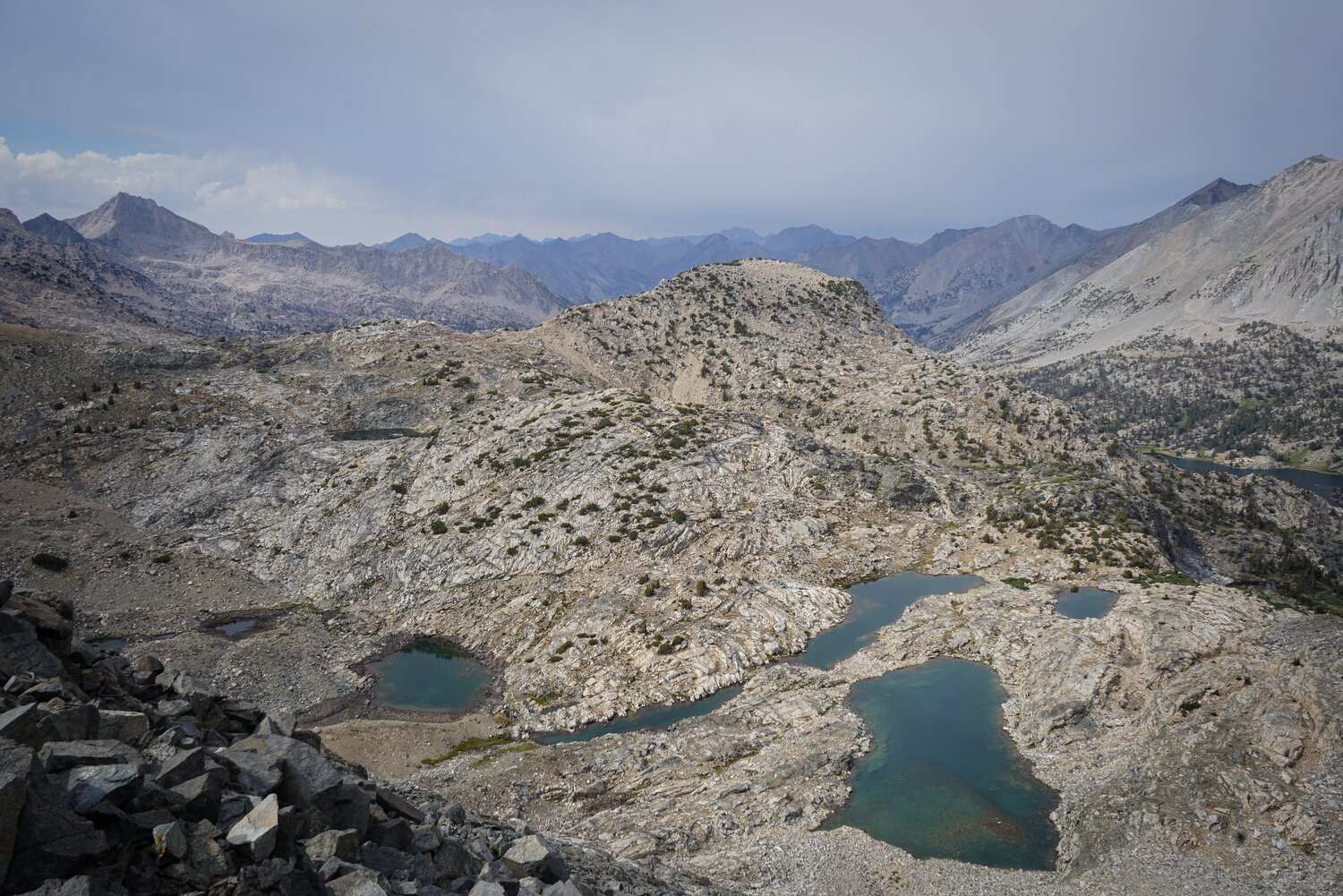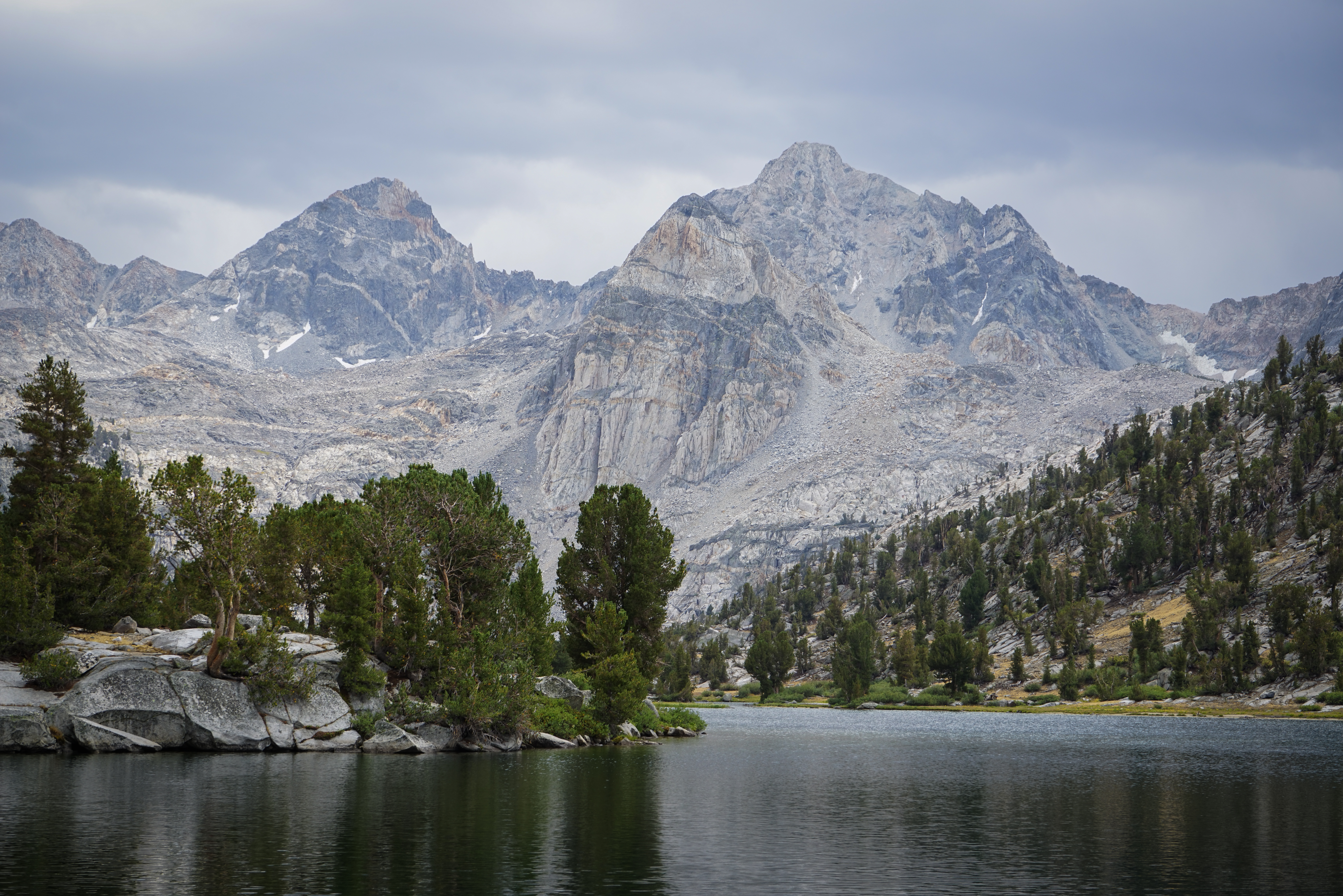 By mid day we reached the Rae Lakes area. Here’s the classic shot of Fin Dome rising above the outlet of Arrowhead Lake, with some of the higher peaks just barely visible in the background.