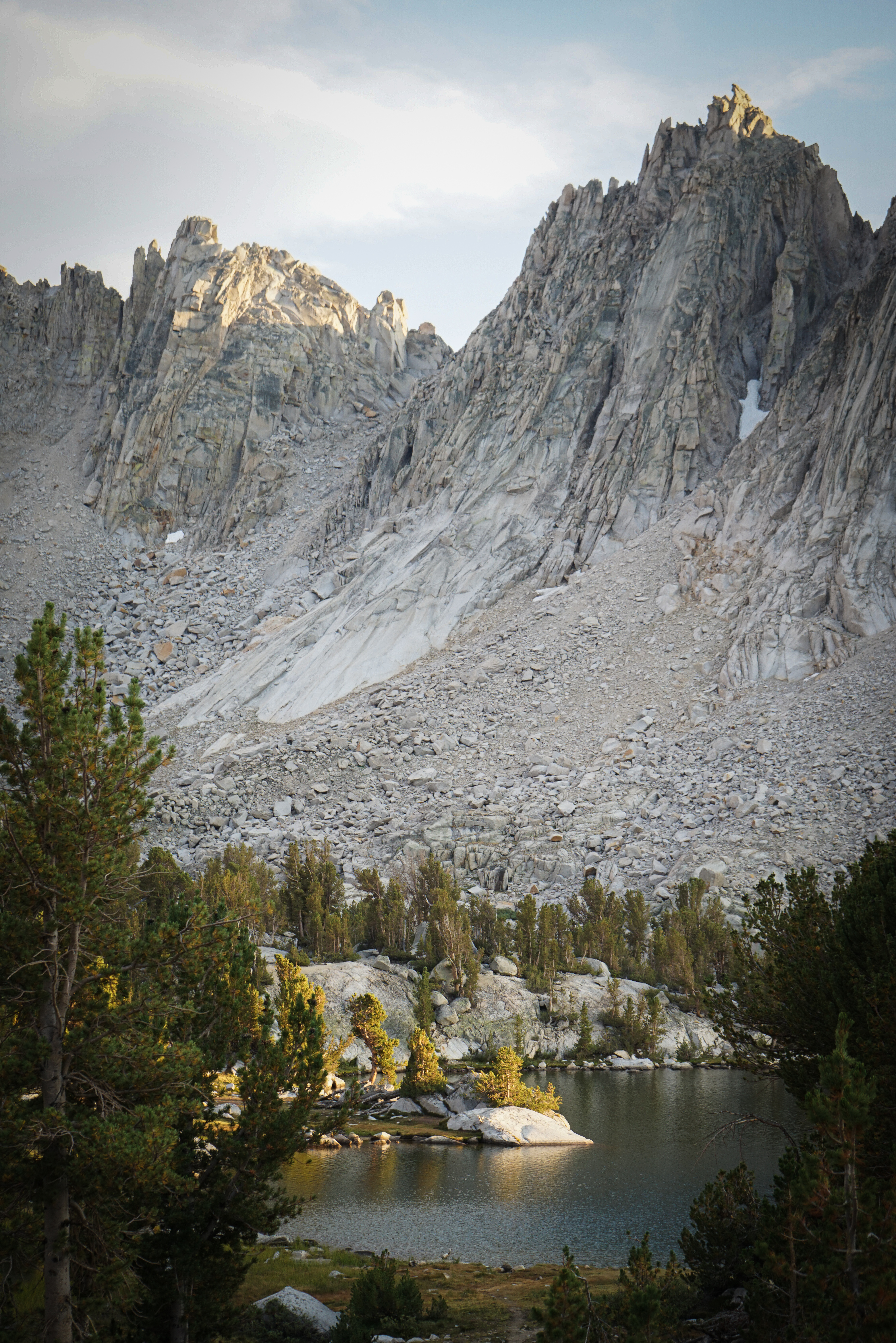 Eventually, we reached Kearsarge Lakes and made camp at one of the obvious campsites near the second highest lake. It was pretty busy. One group in particular was making quite a bit of noise, but they quieted down not long after sunset. The setting sun made for lovely views of the pinnacles.