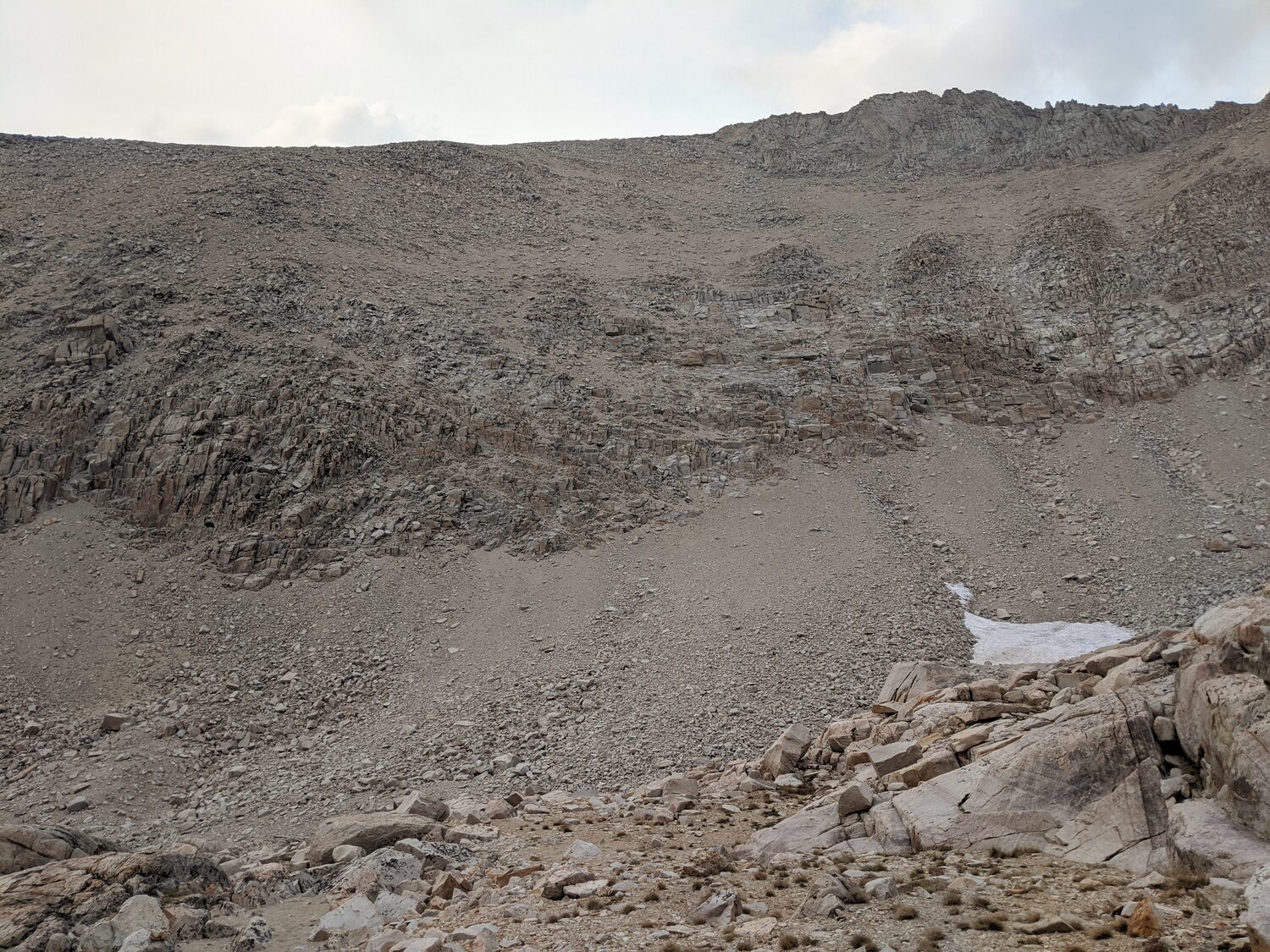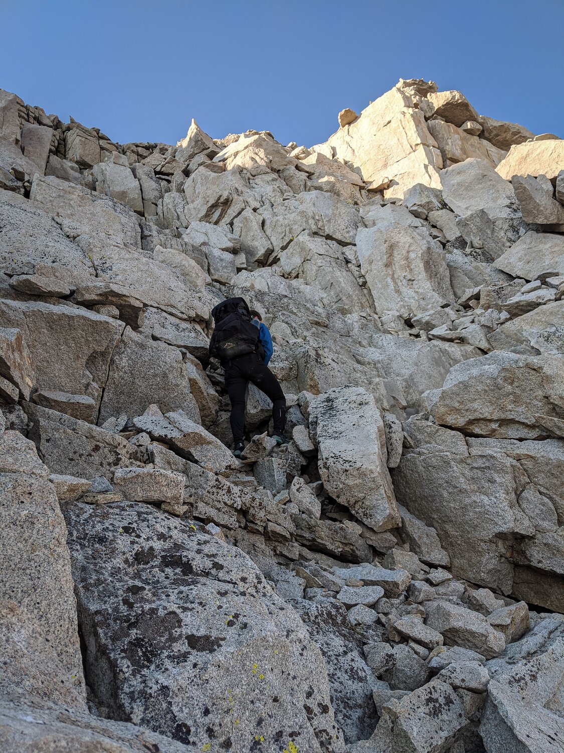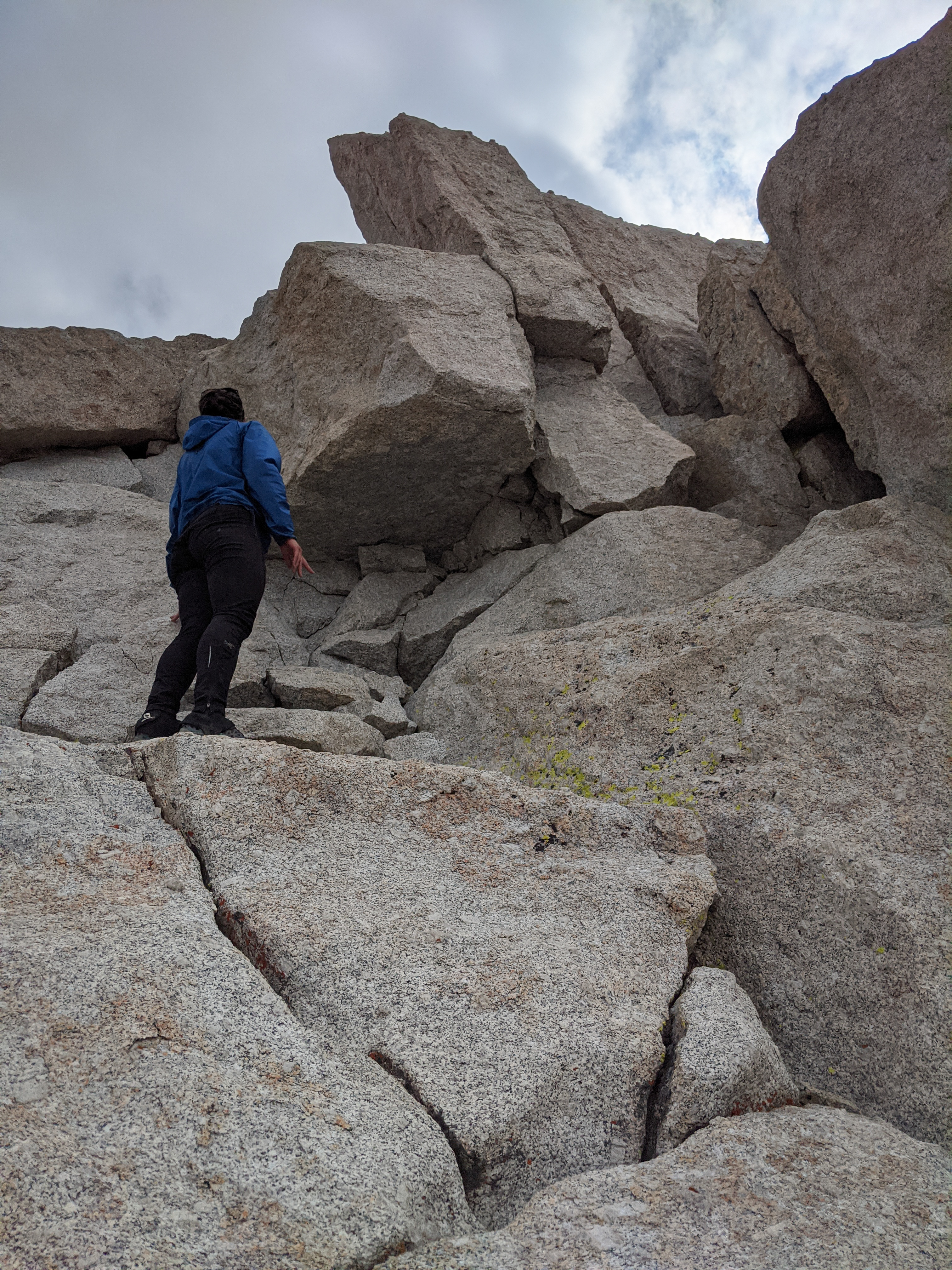Shannon downclimbing from Mount Whitney. It was almost noon and clouds were building again.