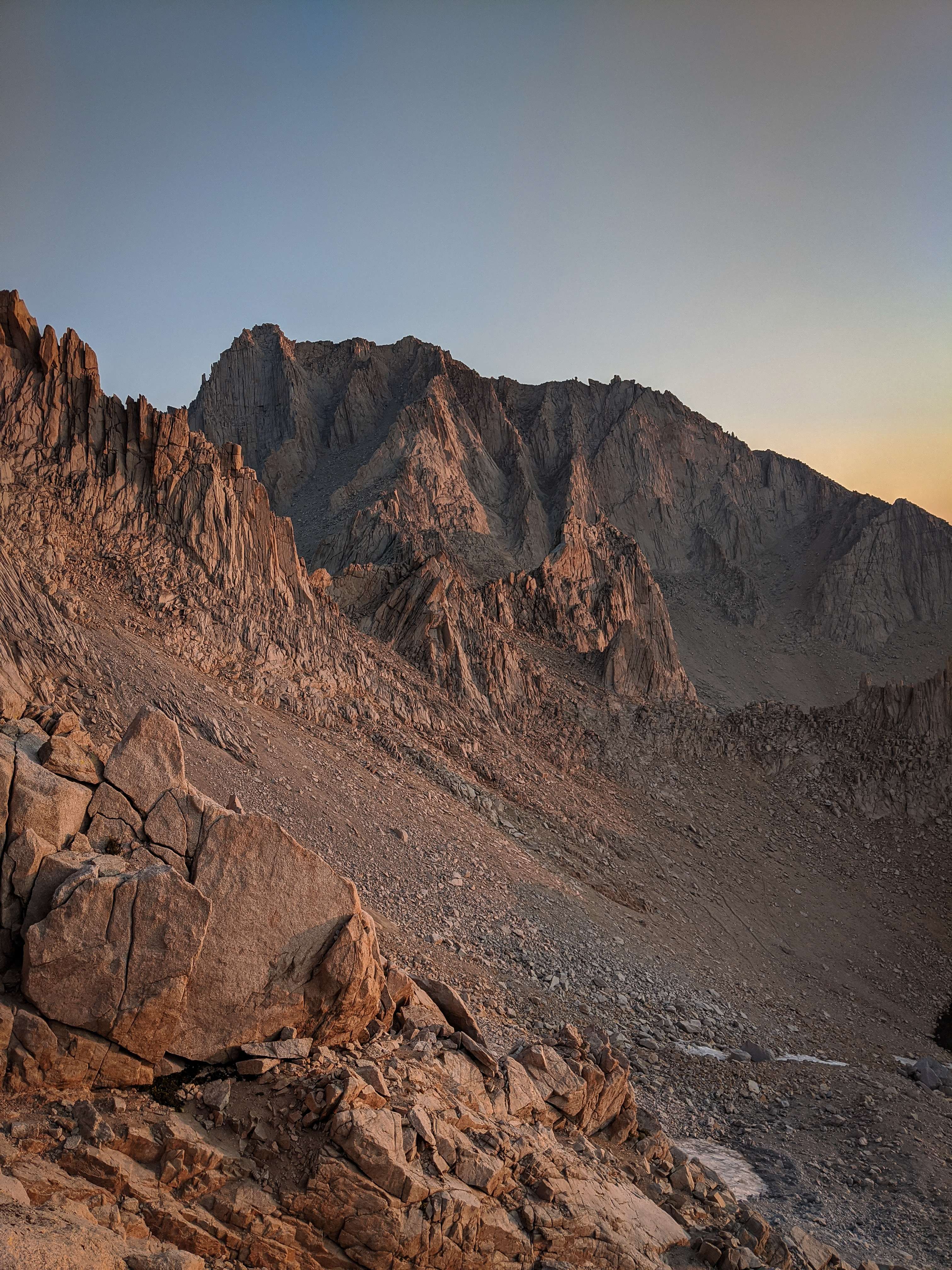 Ready to climb Mount Whitney! We were up at 5-something and headed out just before the sun rose over the White Mountains. We succeeded in beating all but one party out of camp, and they were roping up for the East Buttress, so there was no one above us as we climbed.