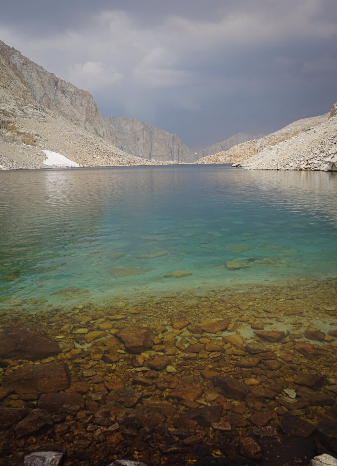 At Upper Crabtree Lake, we stopped for lunch. The dark clouds overhead prompted us to set up the tent in case it decided to rain. While we were setting up, another hiker descended to the lake from Crabtree Pass, and we talked to him for a few minutes. He was out for a day hike from his camp at Sky Blue Lake, which he said wasn’t too far away.