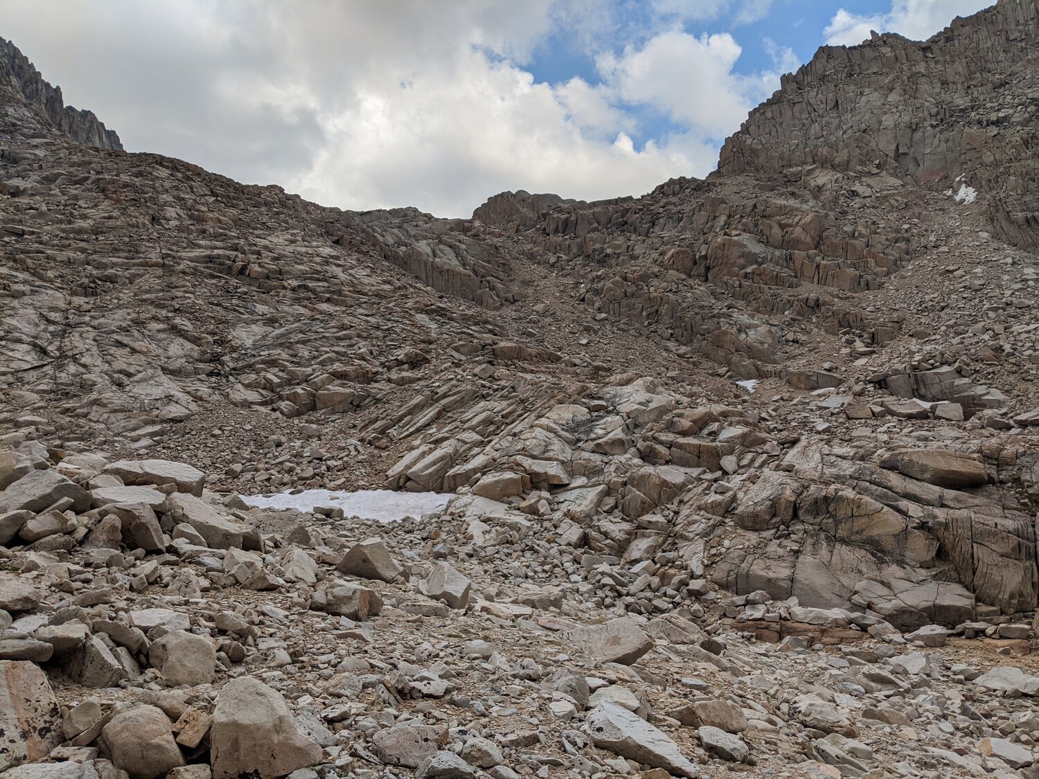 Dixon describes the travel through the Miter Basin as “complicated” and mentions that it will “force you to make many small detours.” This is an accurate description. We spent a lot of time wandering through the rocky chutes, dead-ends, and cliff bands of this area. It was quite mentally tiring to make so many micro-navigation decisions while travelling so slowly.