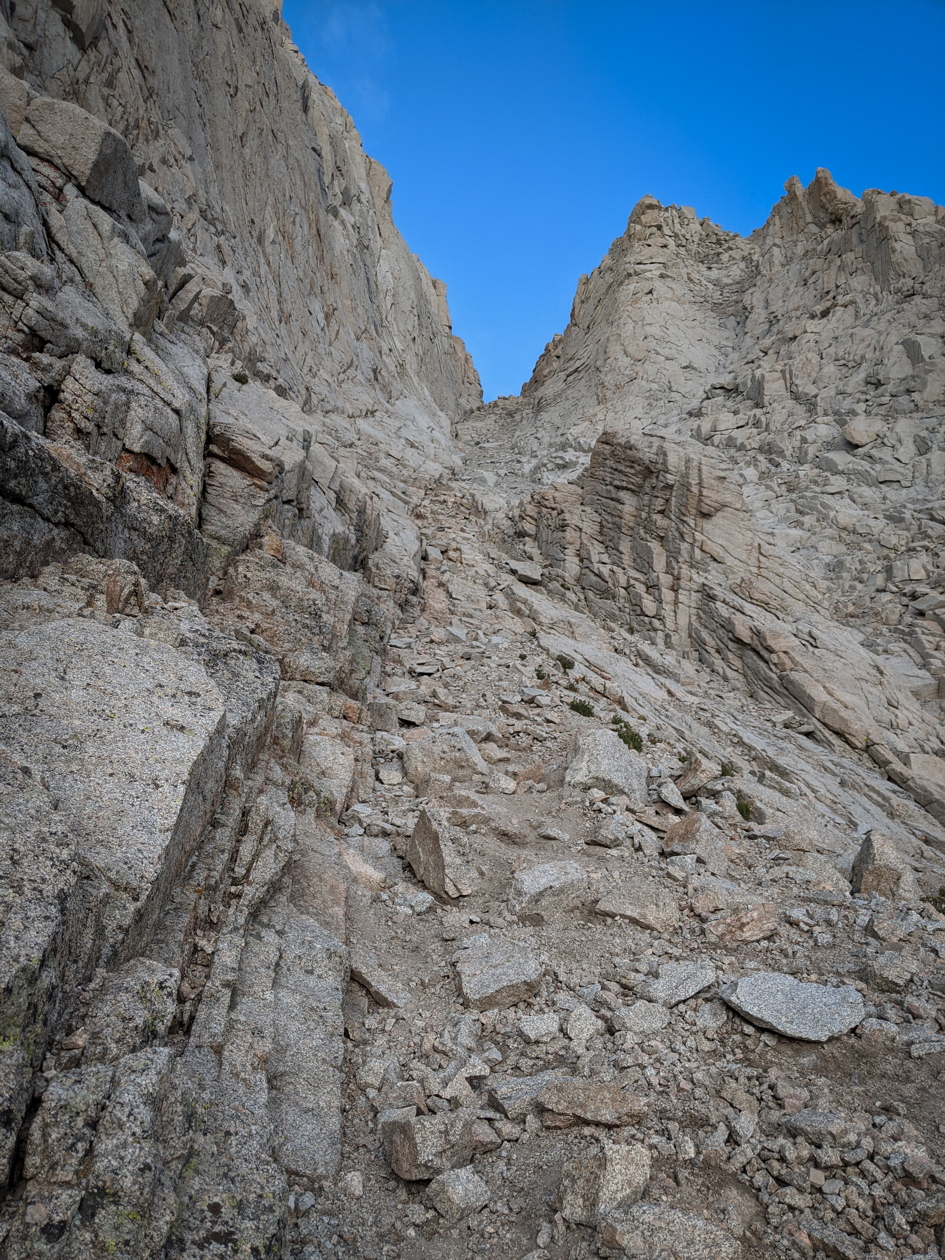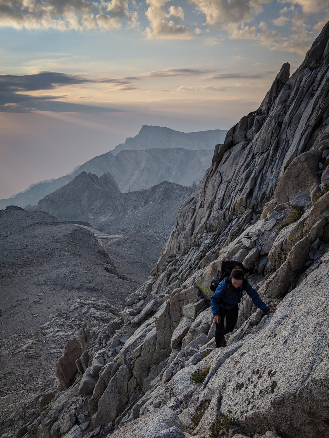 The class 3 section on Mount Muir is not long, but it’s quite tricky with a delicate slab move near the top. Choose the wrong route and you’ll find yourself with 2,000’ of air beneath your feet. There are plenty of useful annotated pictures on the internet.