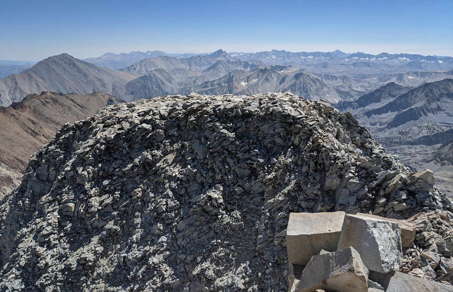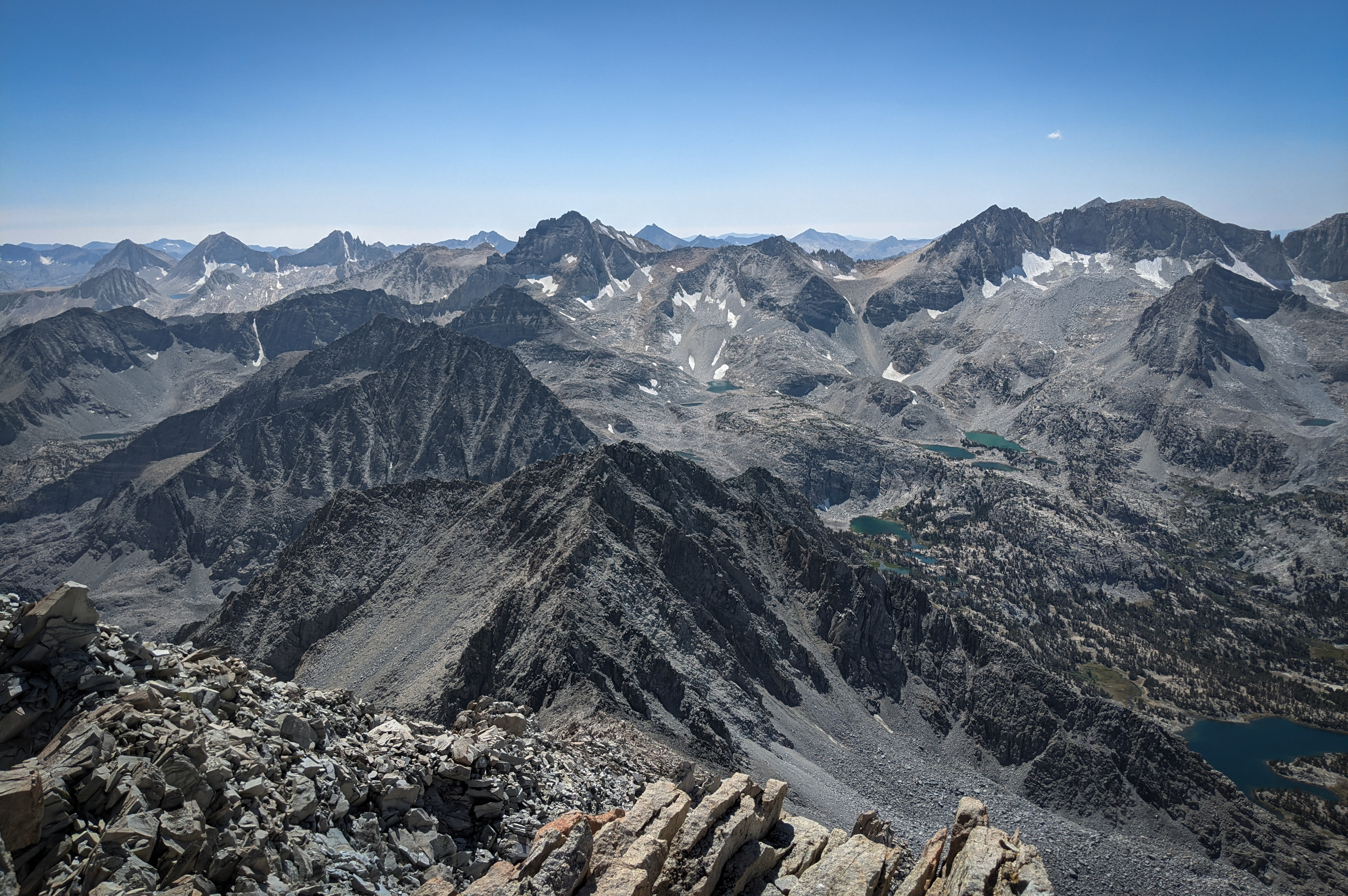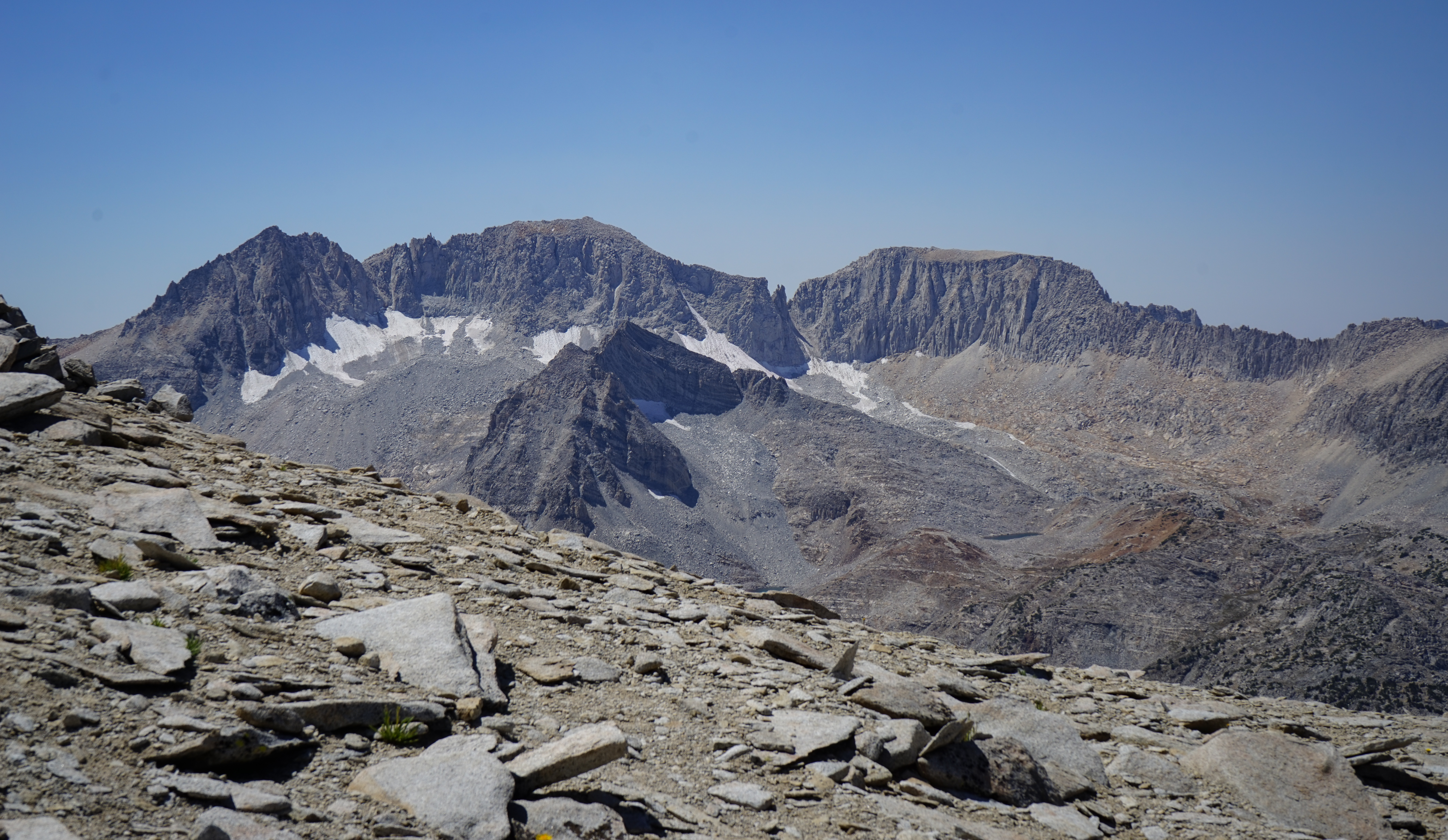 To the south there was a detached, flat-topped pinnacle and an expansive view of the central and southern Sierra, including the Palisades, Mount Humphreys, Mount Darwin and the Glacier Divide, and Mount Goddard.