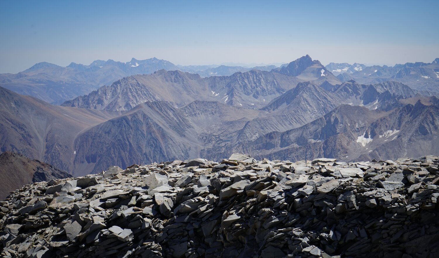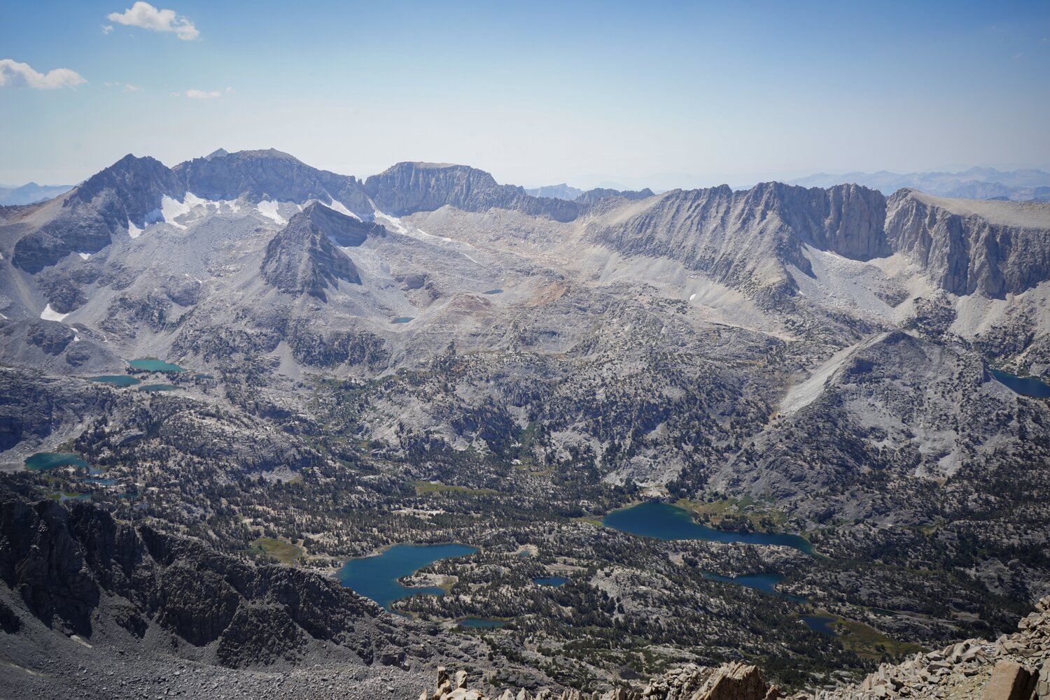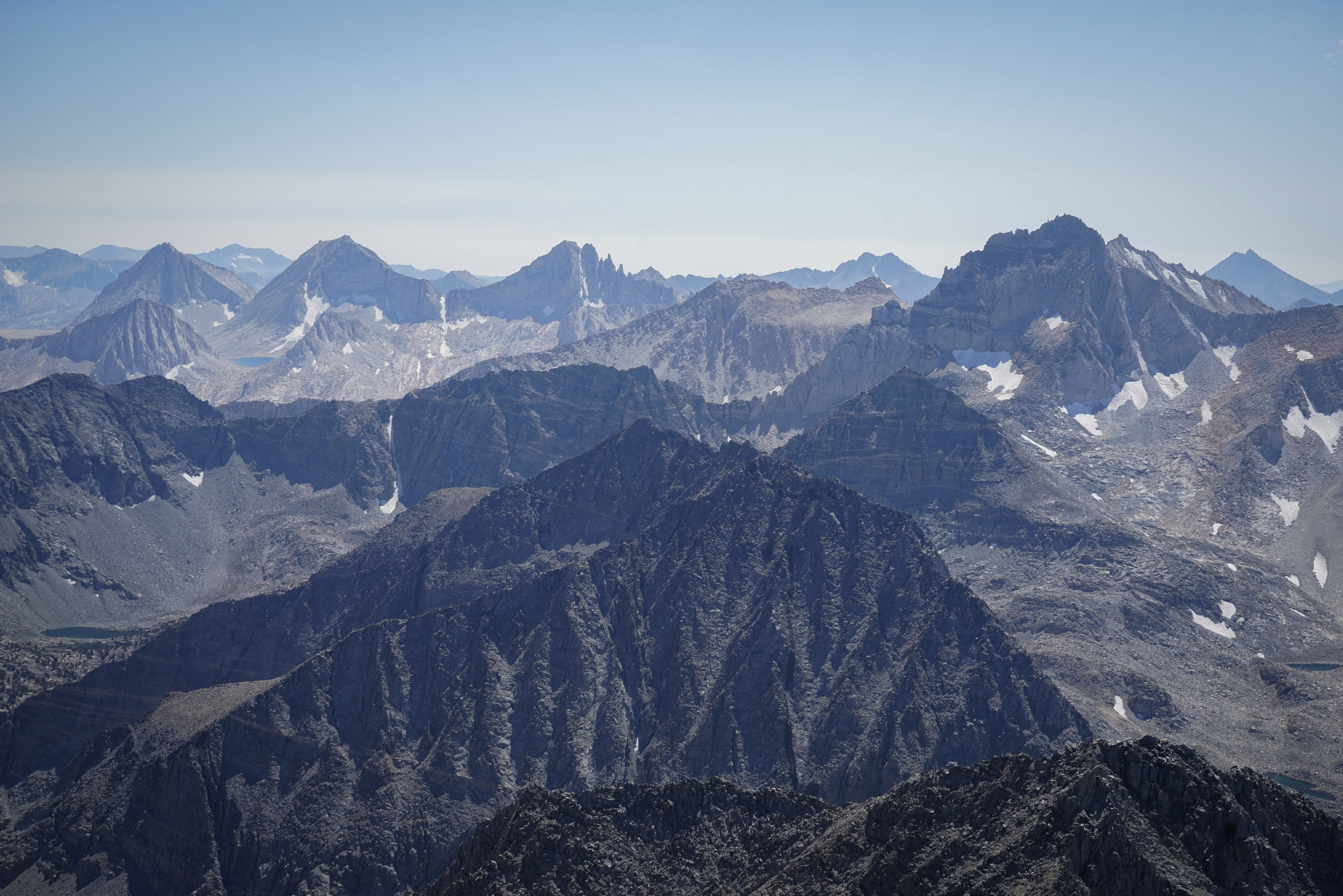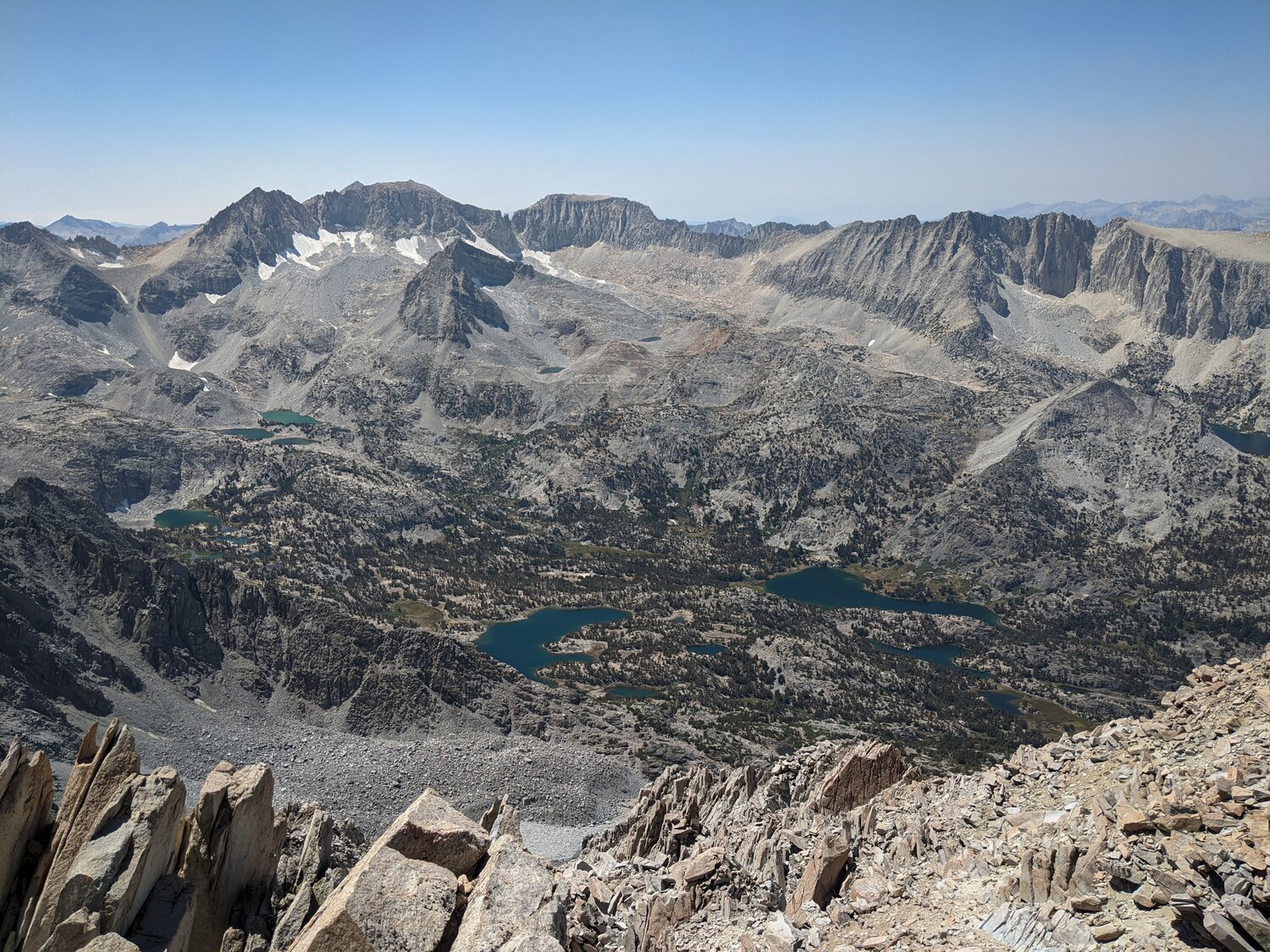 To the south there was a detached, flat-topped pinnacle and an expansive view of the central and southern Sierra, including the Palisades, Mount Humphreys, Mount Darwin and the Glacier Divide, and Mount Goddard.
