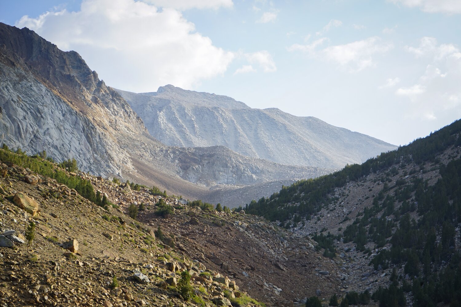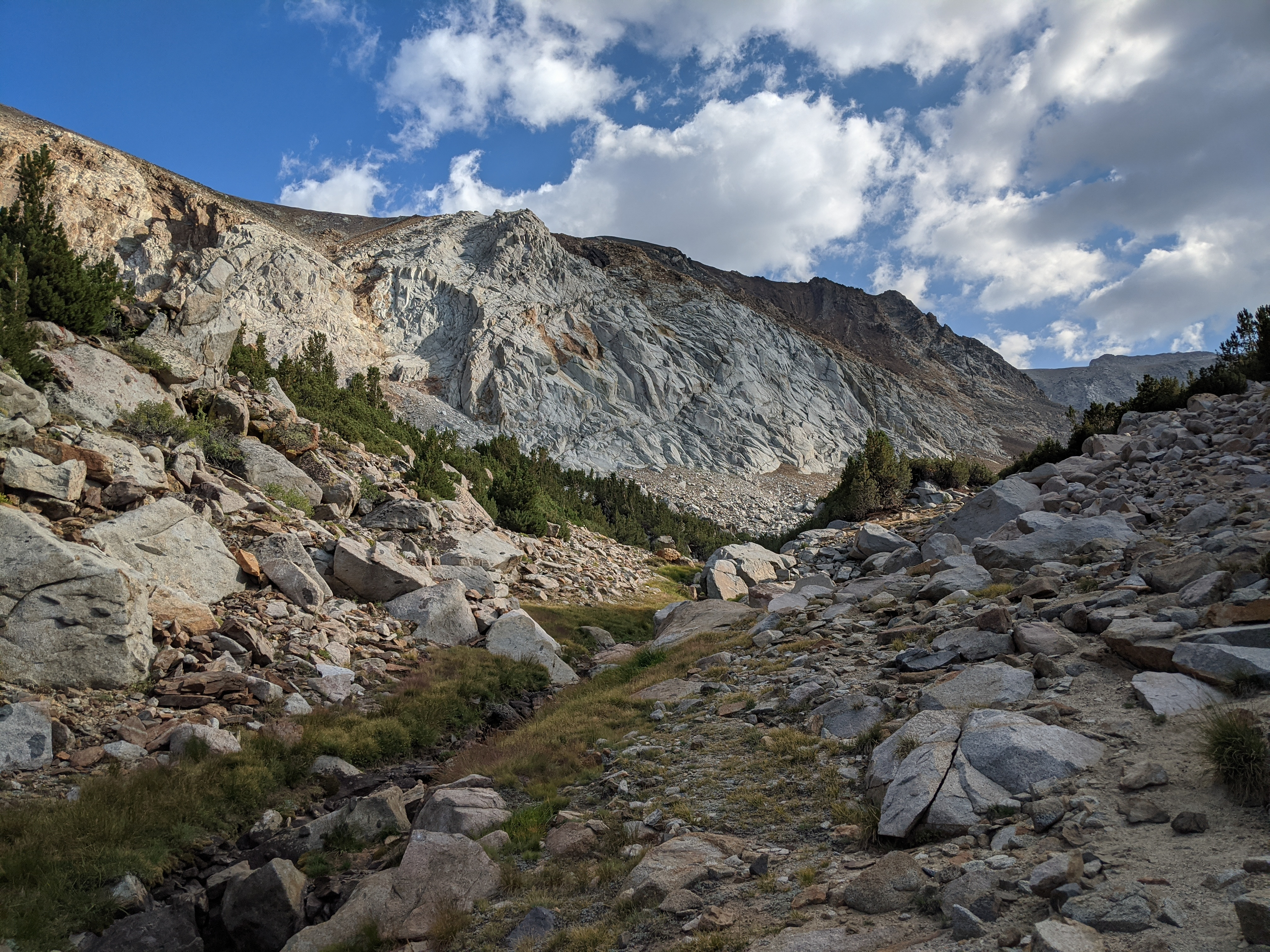 We hiked up and past Francis Lake before climbing onto the huge talus field that continued 2,500 vertical feet to the summit. We tried to choose a reasonable line from below, but stuck too far climbers-left and emerged on the wrong side of the undulating moraine that’s visible on the USGS quads between 11,600’ and 12,000’. So, we were forced to cross that mess to the bench just southeast of Point 12352. Above here, the climbing was more obvious from below. There are many broad chutes that gain the summit slope, the climbers-rightmost one is the most inviting and recommended by Secor. There was a bit of wobbly rock in here, but nothing too bad.