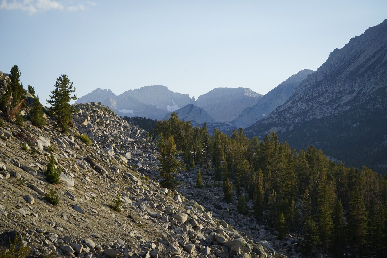 Atop the chute, we gained the north ridge of the mountain and had a nice view across the Little Lakes Valley of Mount Mills, Mount Abbot, and Mount Dade.