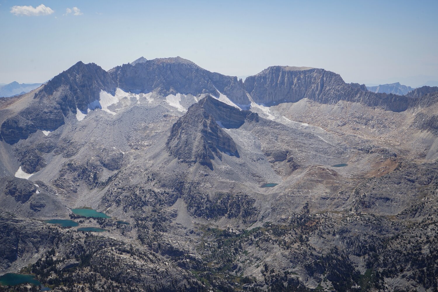 Bear Creek Spire with Feather Peak, Royce Peak, and Merriam Peak behind. Even one of the Royce Lakes is visible in the gap of Croft Col.