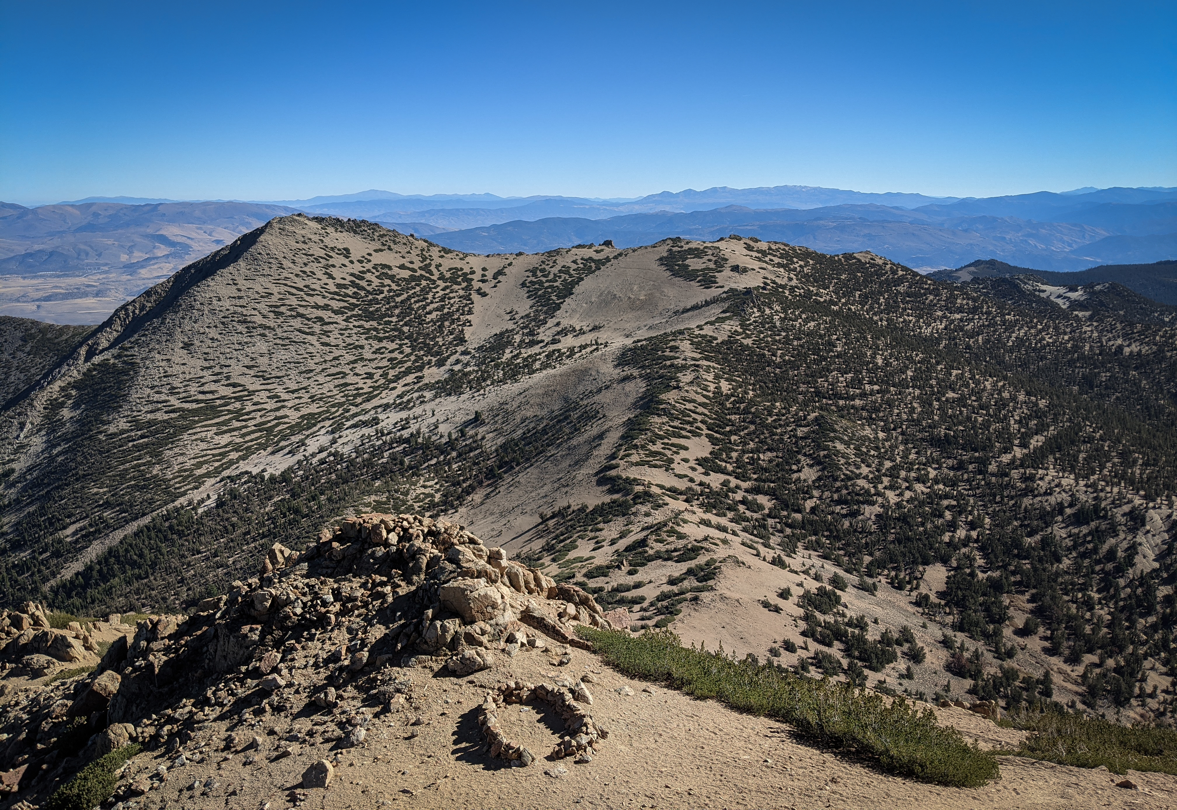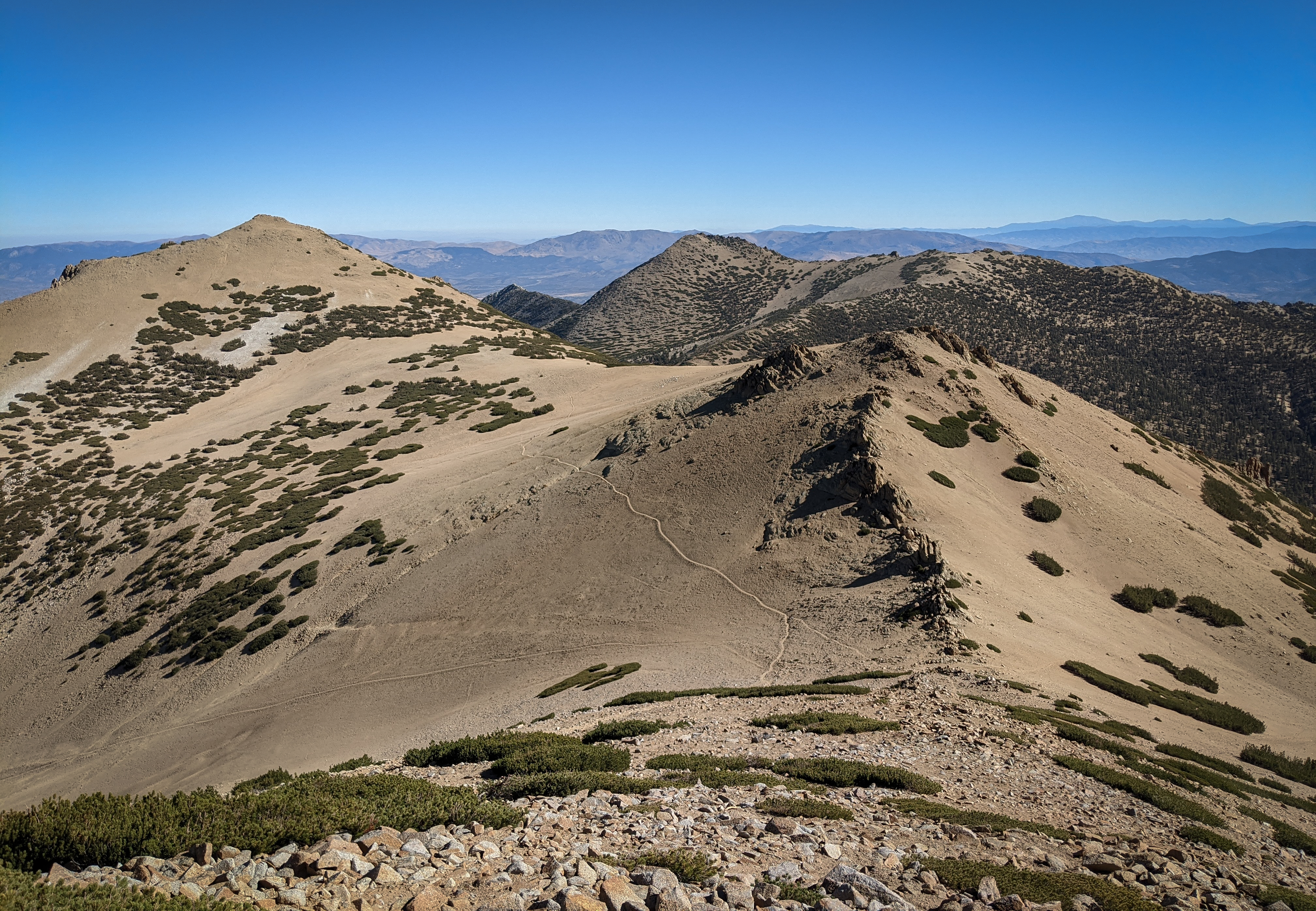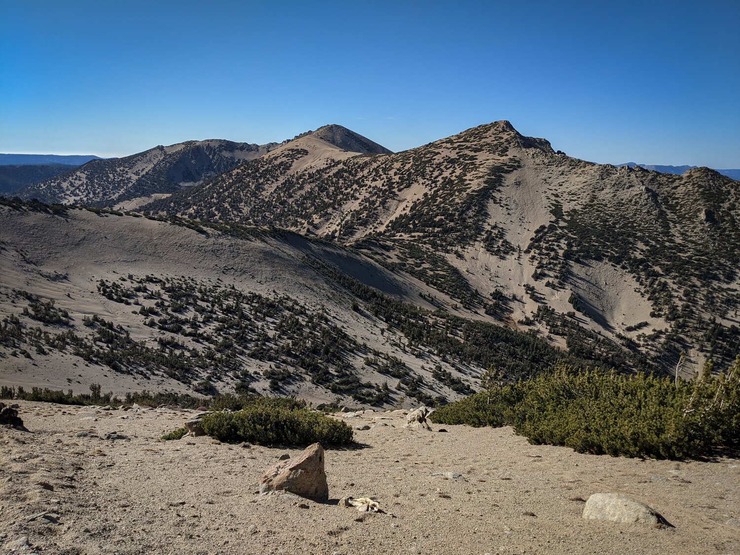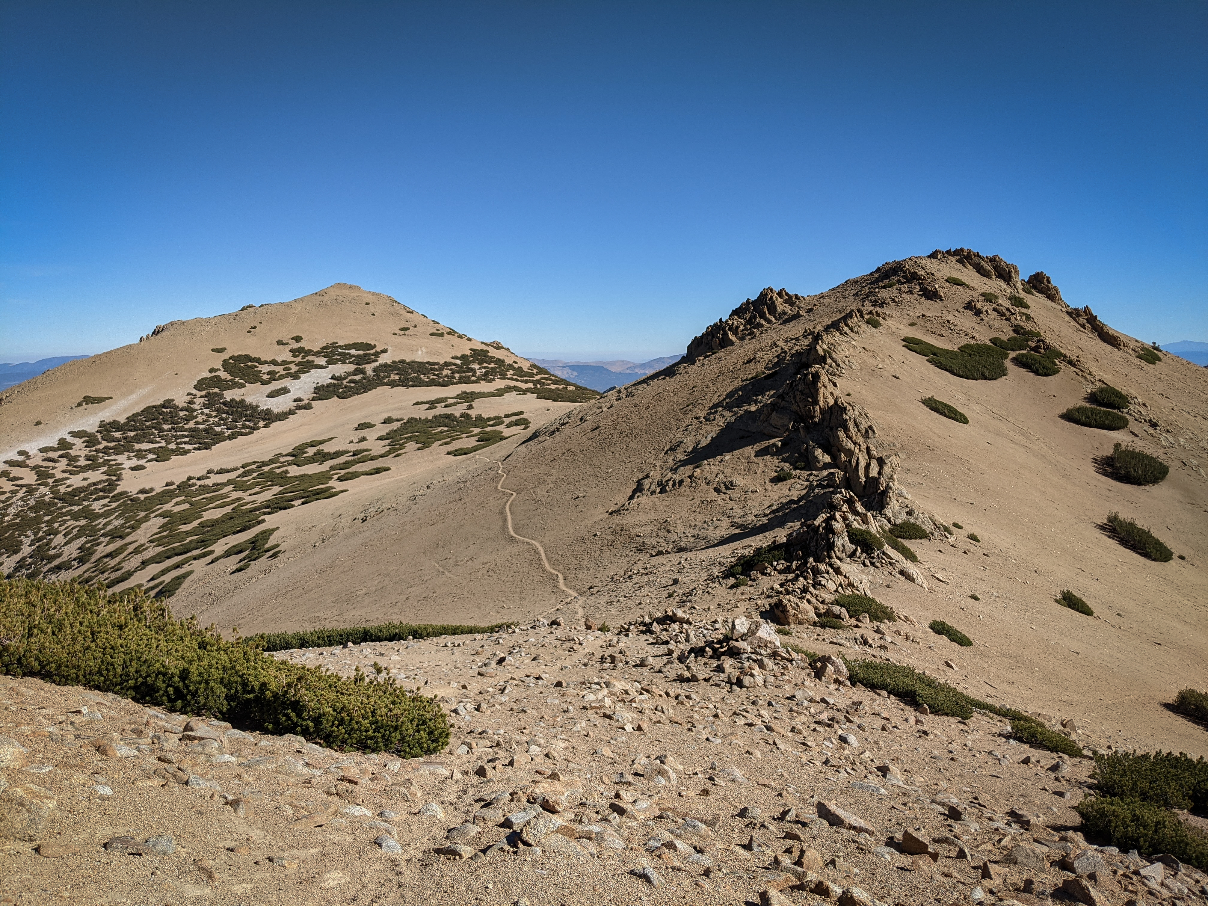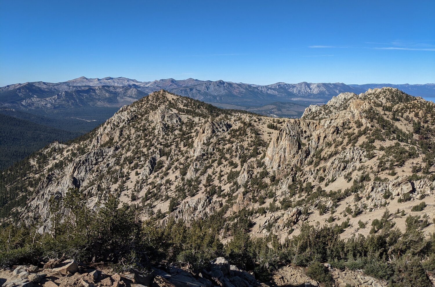 The view of Freel Peak and Jobs Sister from Jobs Peak. There was a bunch of remote weather sensing stuff on Jobs Peak, but the rocky summit was free of garbage and was a nice place to enjoy a snack.