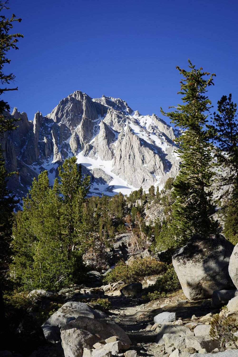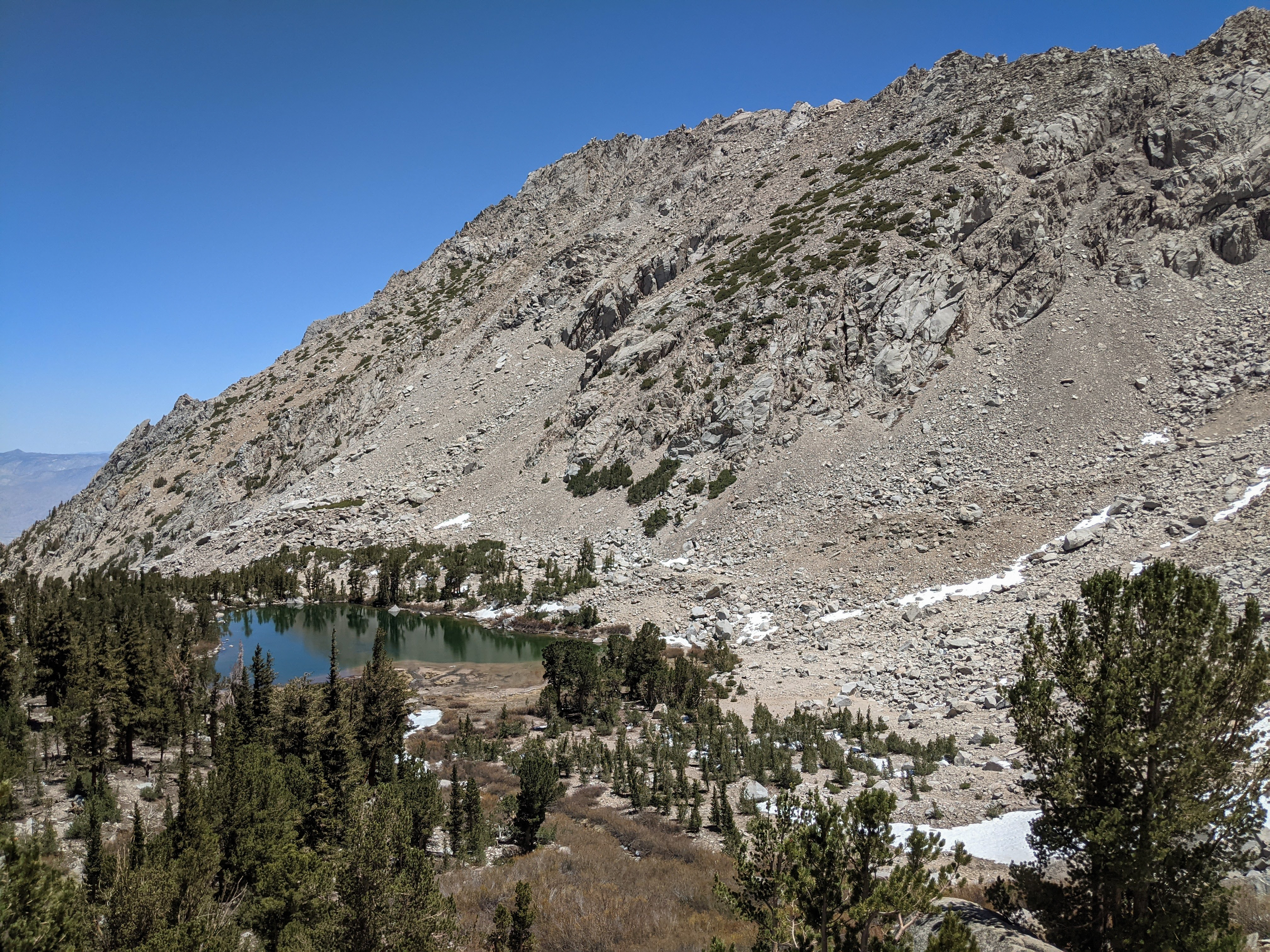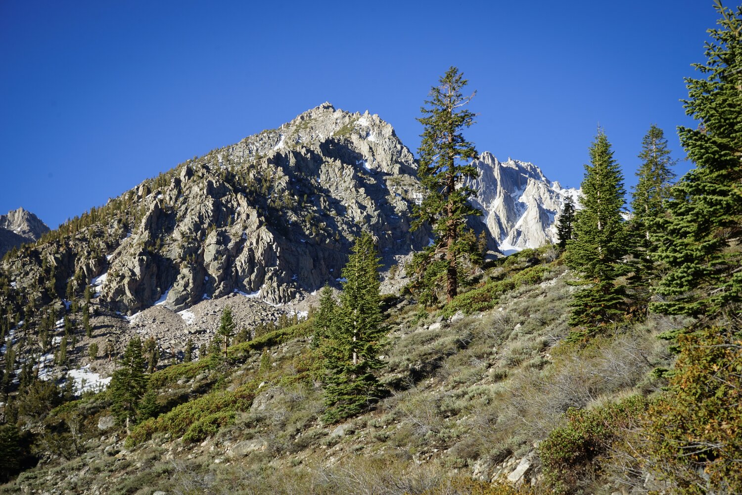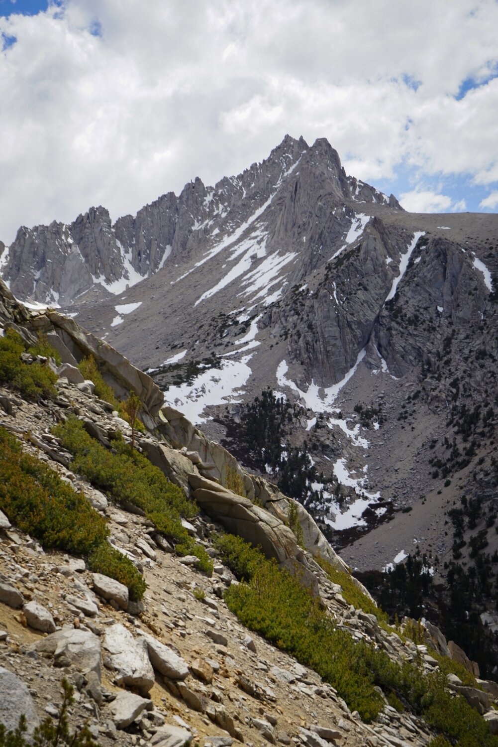 University Peak from the West Face. It was straightforward to get back down to the trail, where I rested again. The trail to Robinson Lake climbs much more steeply than the one to Kearsarge Pass, which wasn’t too welcome on my tired legs, but at least it was a trail. It also never gets near enough to the creek for an inviting foot-soak rest, so I just made my way down, through the campground, and back to the car.