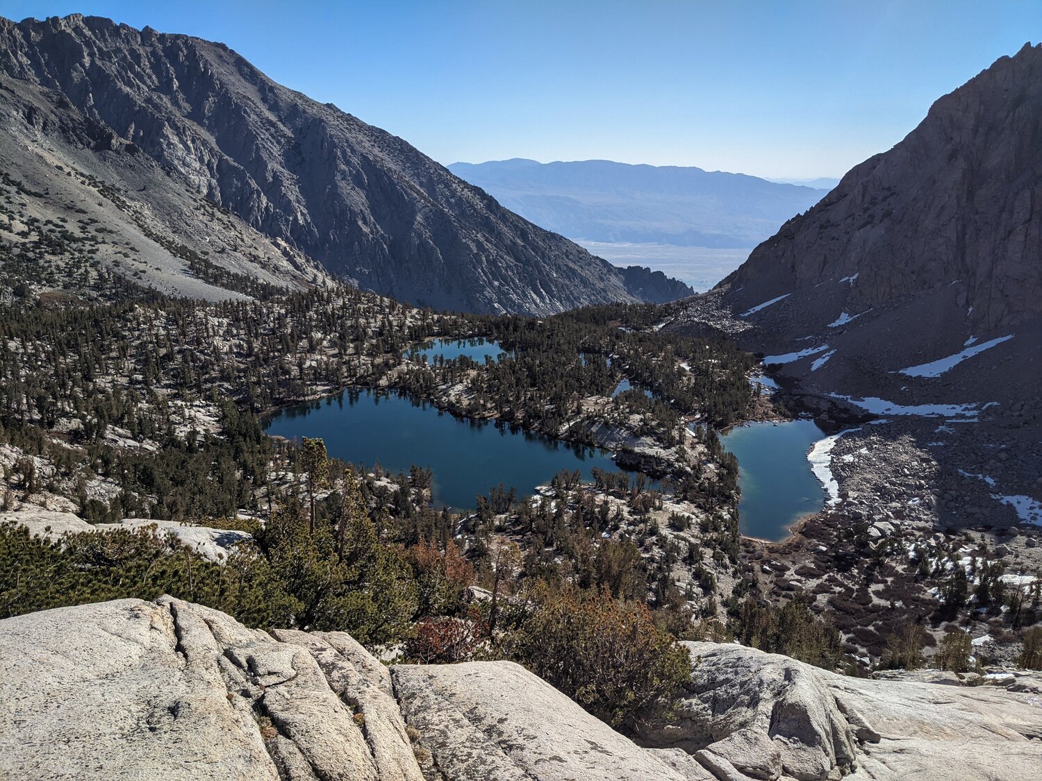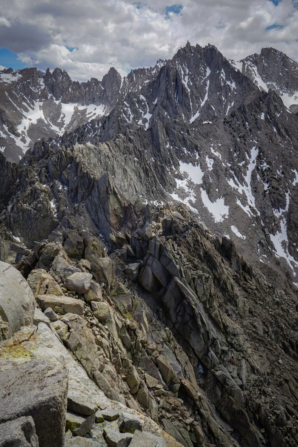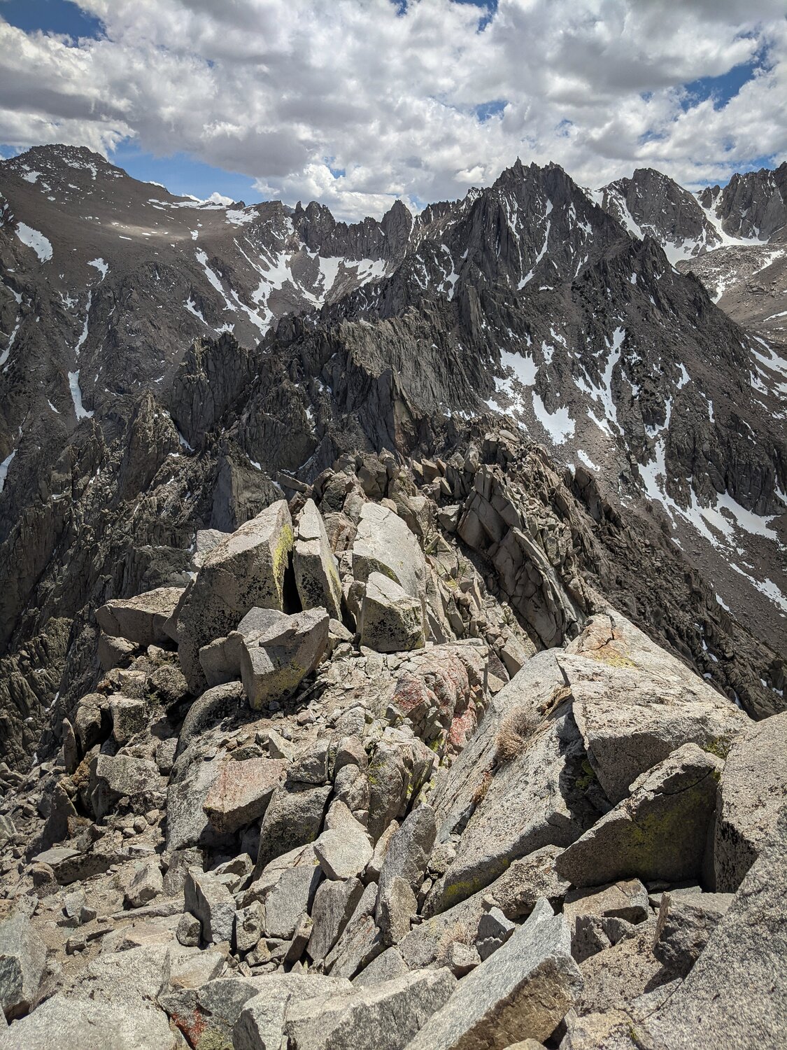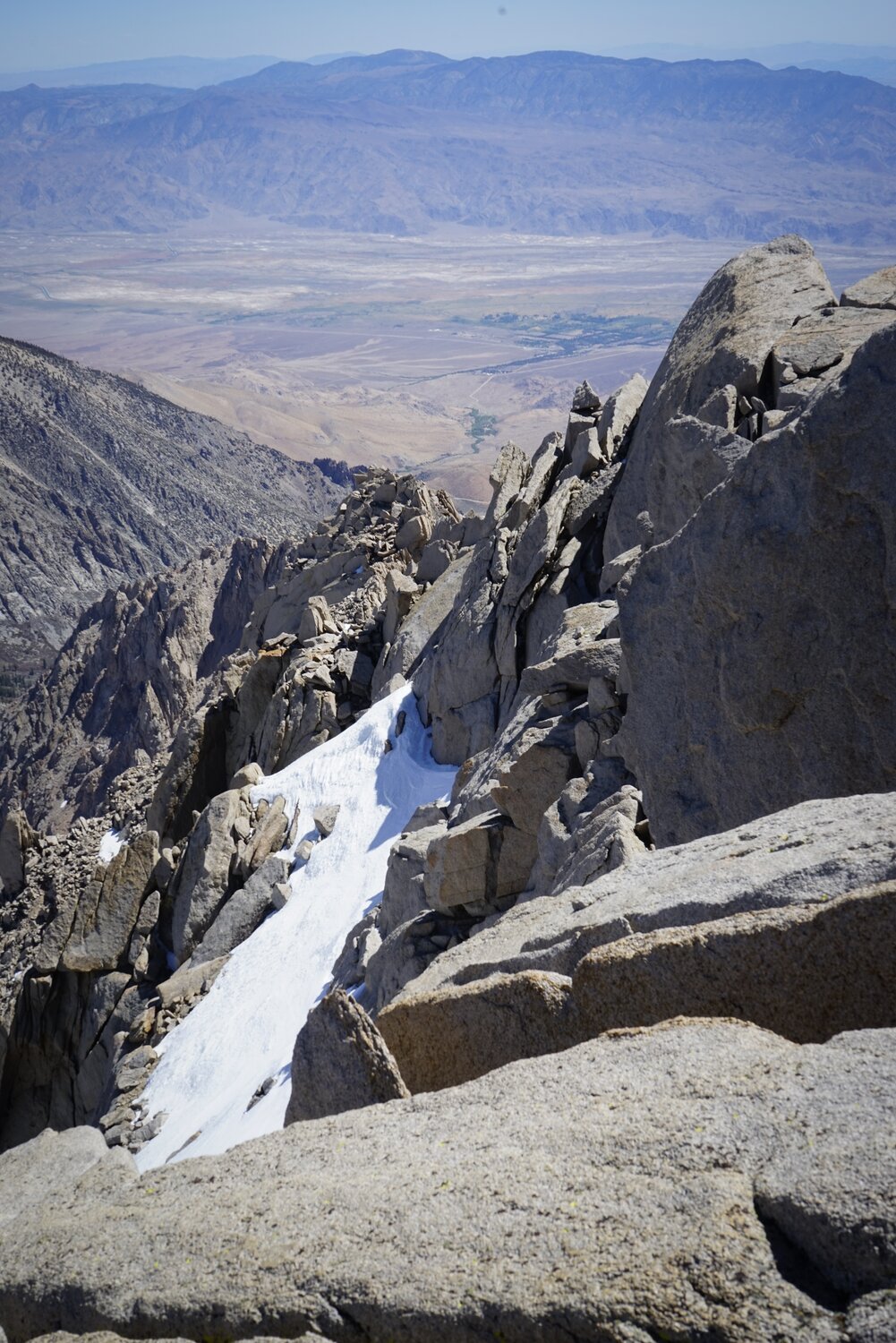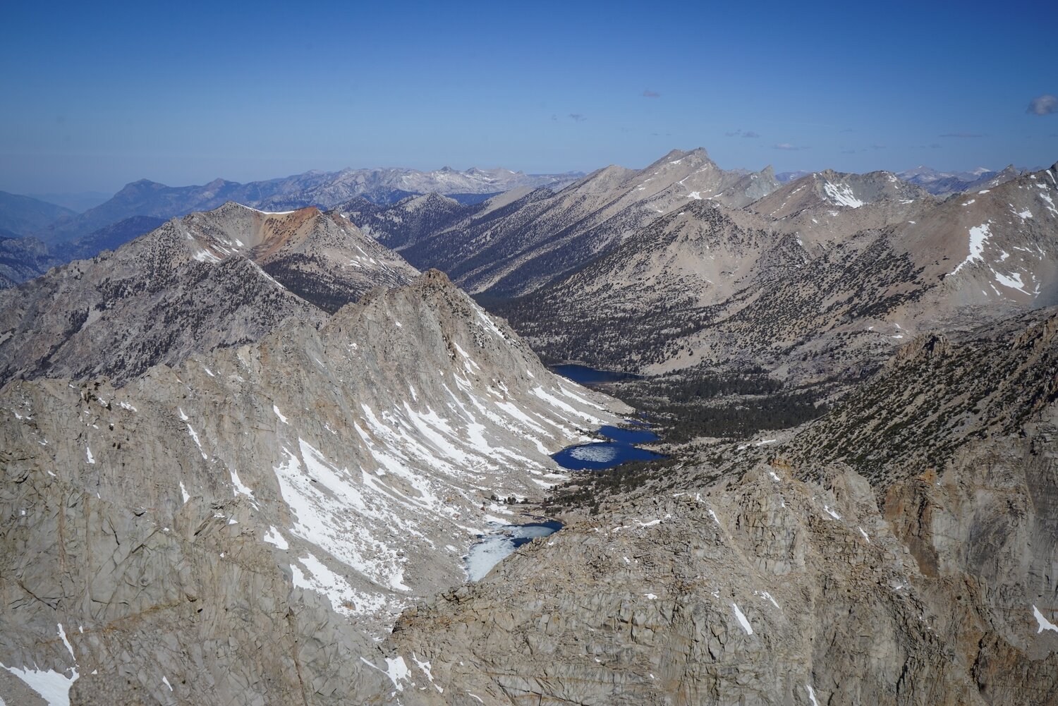 The view of Kearsarge Lakes from near the summit of University Peak. Once I gained the summit ridge, the climbing became much more complicated. There were four small, but invisible from below snowfields that I had to cross to reach the class 3 summit scramble. This was complicated by the fact that this little catwalk is at the top of cliffs that drop off the north face for a hundred or so feet.