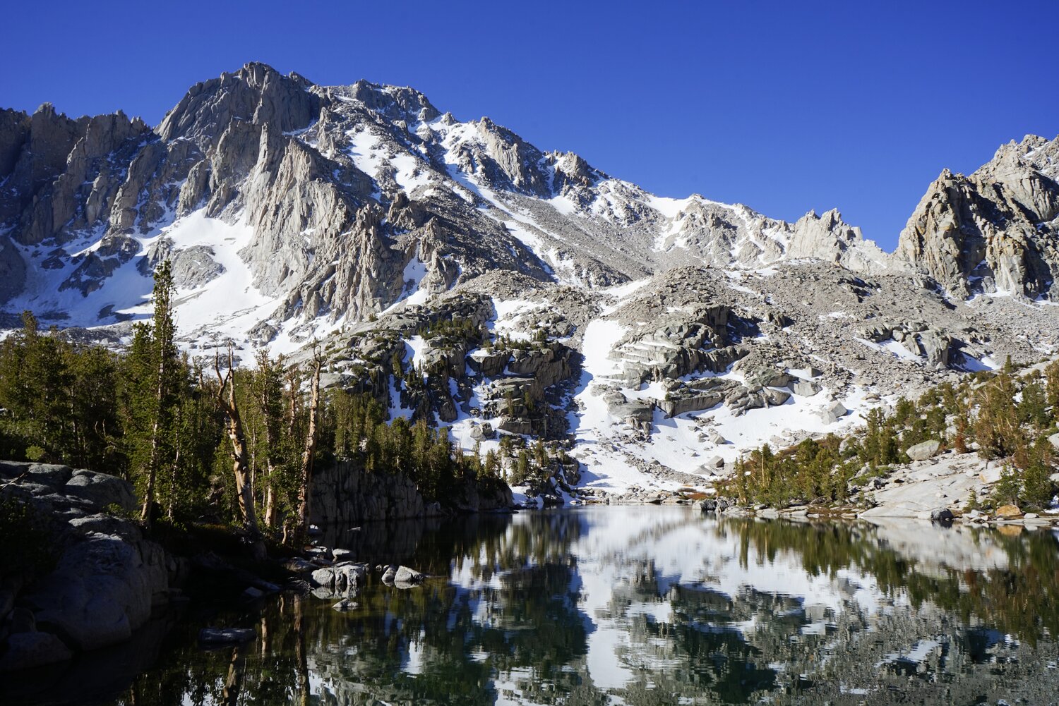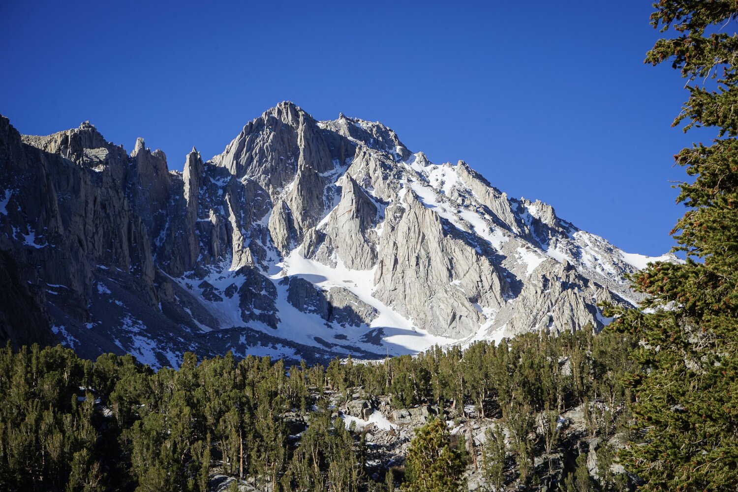 University Peak from Bench Lake. The rib of the North Face cuts diagonally towards the summit, with snowfields on the left side.