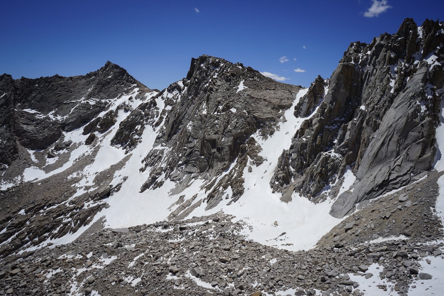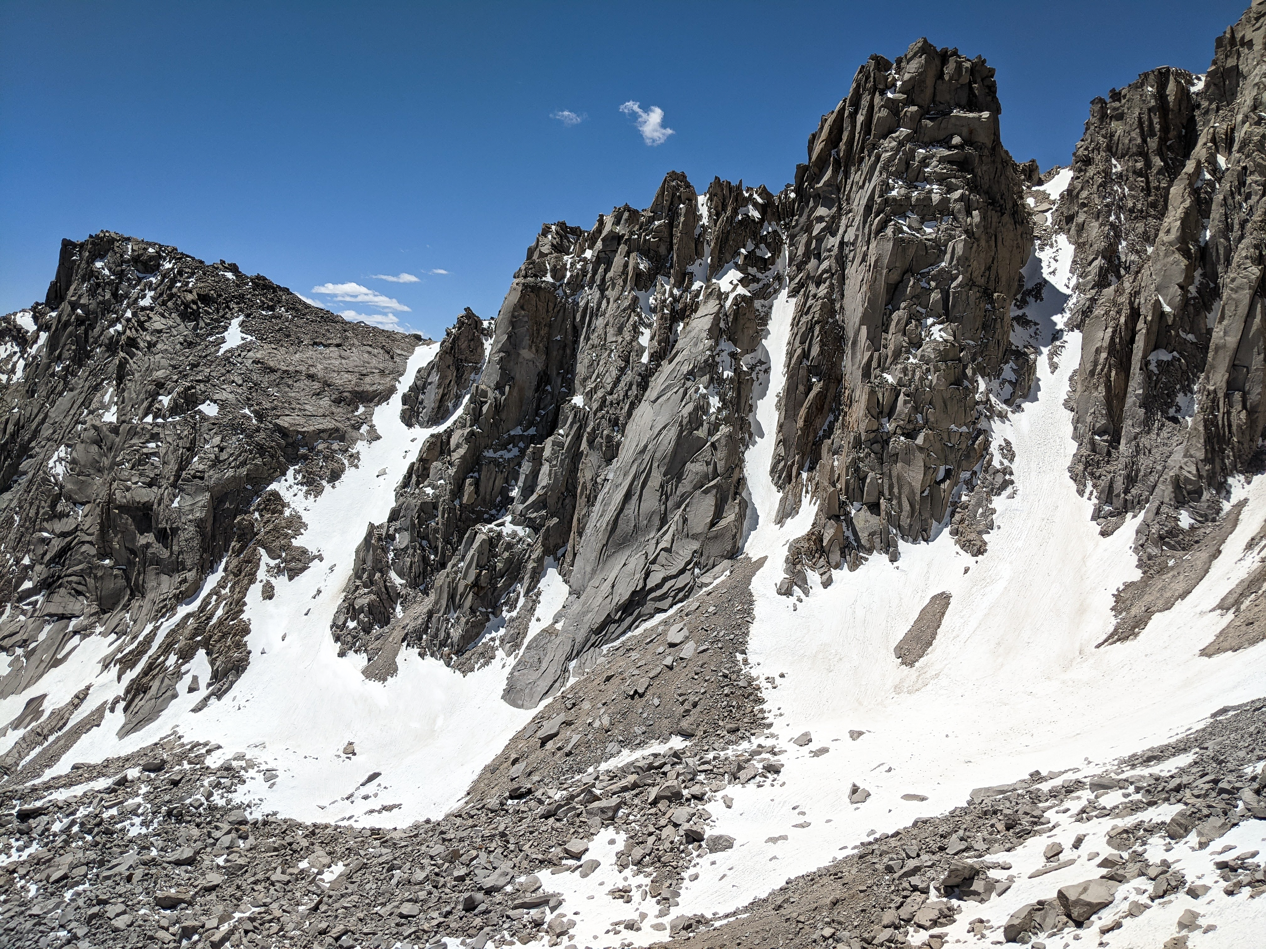 After renegotiating the snowfields, I made it back to the spot where I had crested the summit ridge via the North Face. There were no obvious cairns, but I was in a broad notch and proceeding farther east looked difficult, so I headed south, hoping that I had been in the correct broad notch.