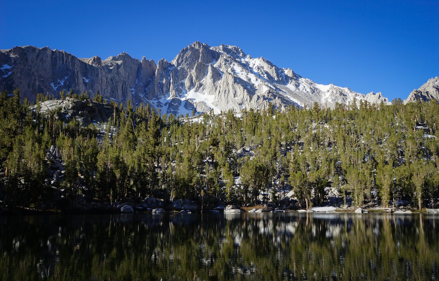 Poking more prominently above Gilbert Lake. I followed a good use trial from Flower Lake to beautiful Matlock Lake and then wandered through the forest up to Bench Lake (also beautiful). Despite this area’s popularity, few people leave the Kearsarge Pass Trail corridor, so these lakes are relatively quiet and peaceful.