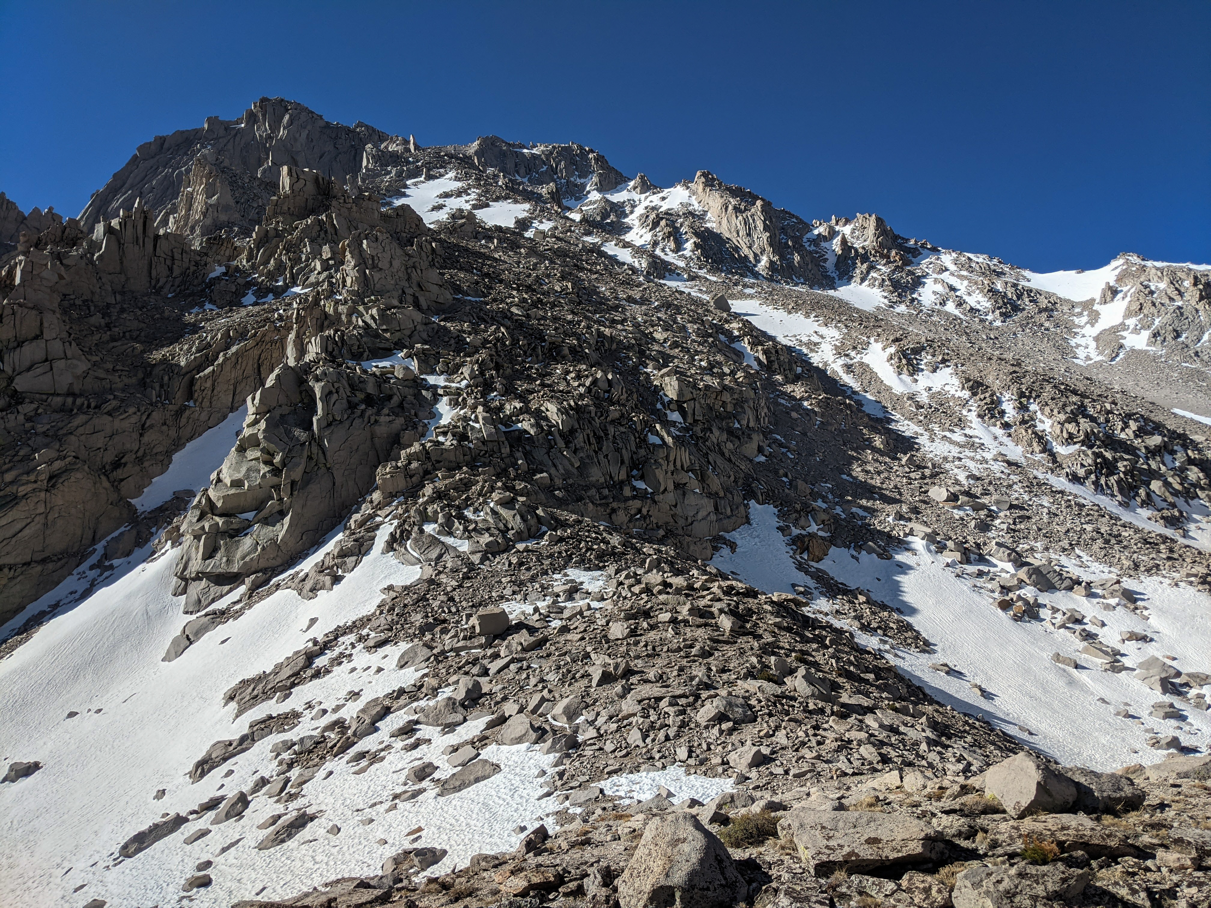 At Robinson Lake I passed through a lovely stand of large pines and an enormous campsite. I turned off the trail just after locating it and headed directly up alternating sand chutes and decent talus, aiming left of the big rocks I had identified below. The climbing was just a grind, nothing difficult.