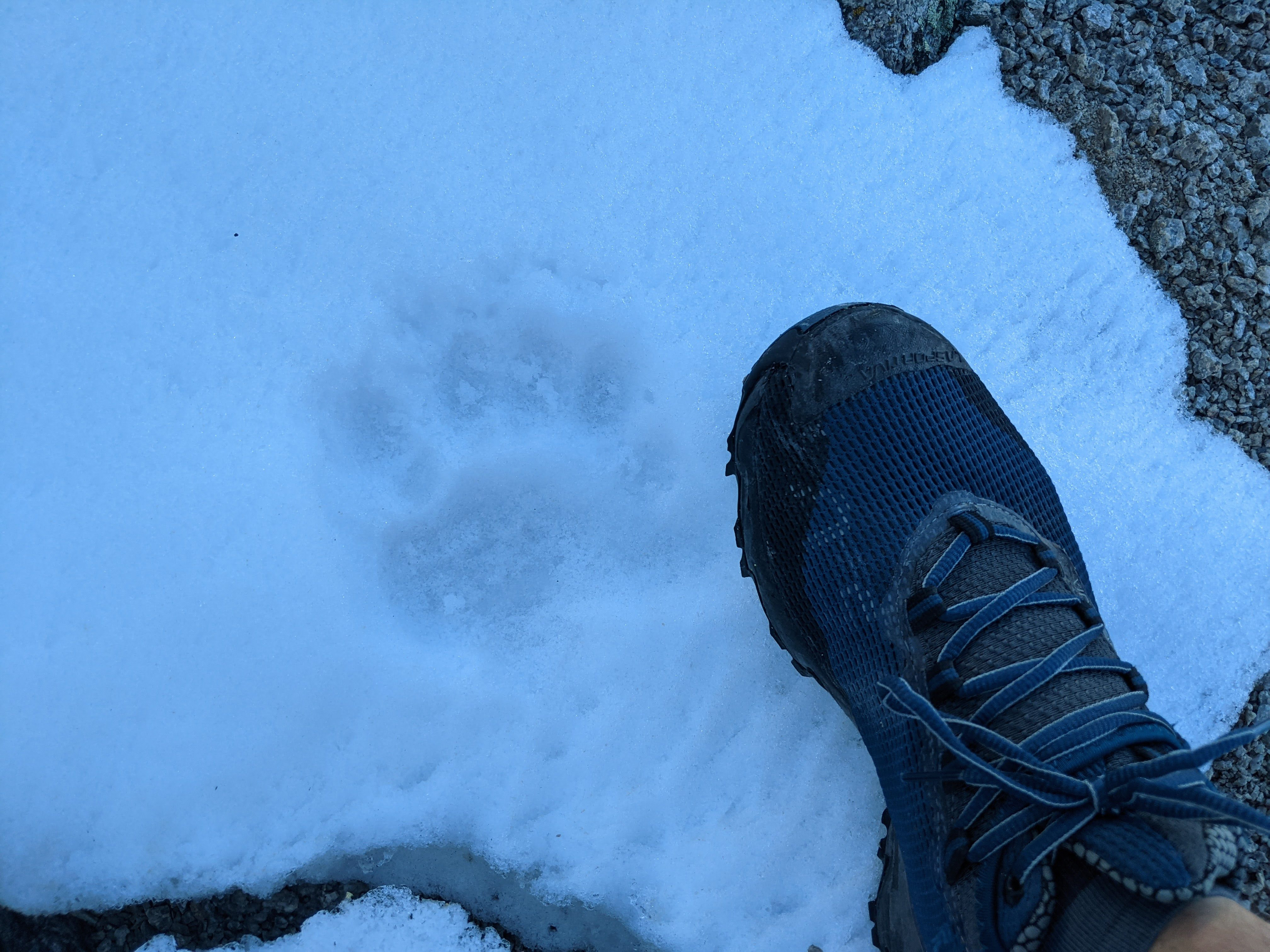 Near 11,500’ I crossed a narrow catwalk with an enormous boulder cave. It smelled absolutely terrible and I looked around for a dead animal inside, but couldn’t find one. Shortly above this cave, I found this bear track headed up a snowfield towards the summit. I could only guess that I had found a bear’s den and the bear had headed off towards the summit of University Peak recently. It had snowed 3 or 4 days prior, so the tracks were quite recent. There was another short stretch of tracks a few hundred feet higher headed in the same direction. Weird!