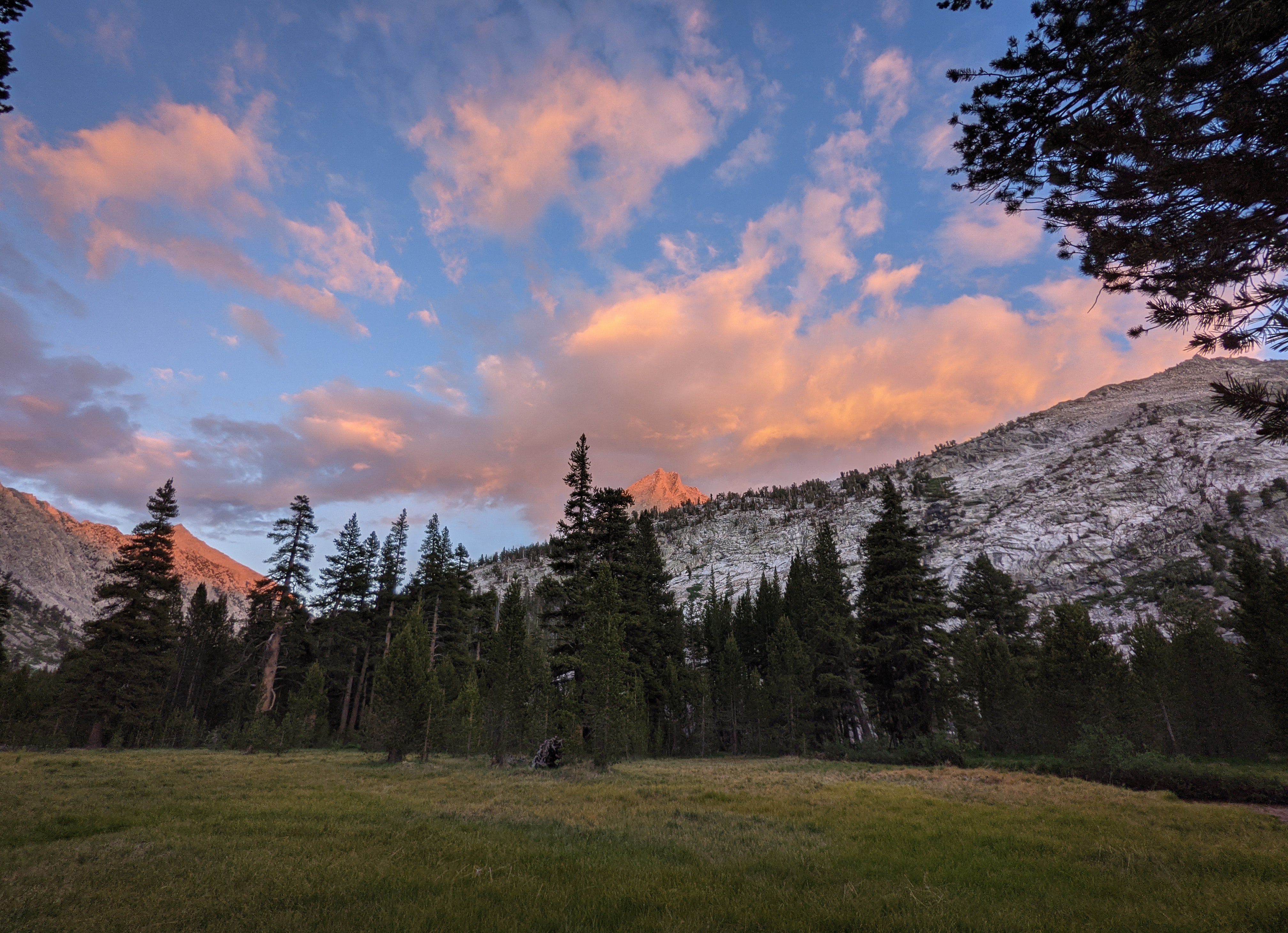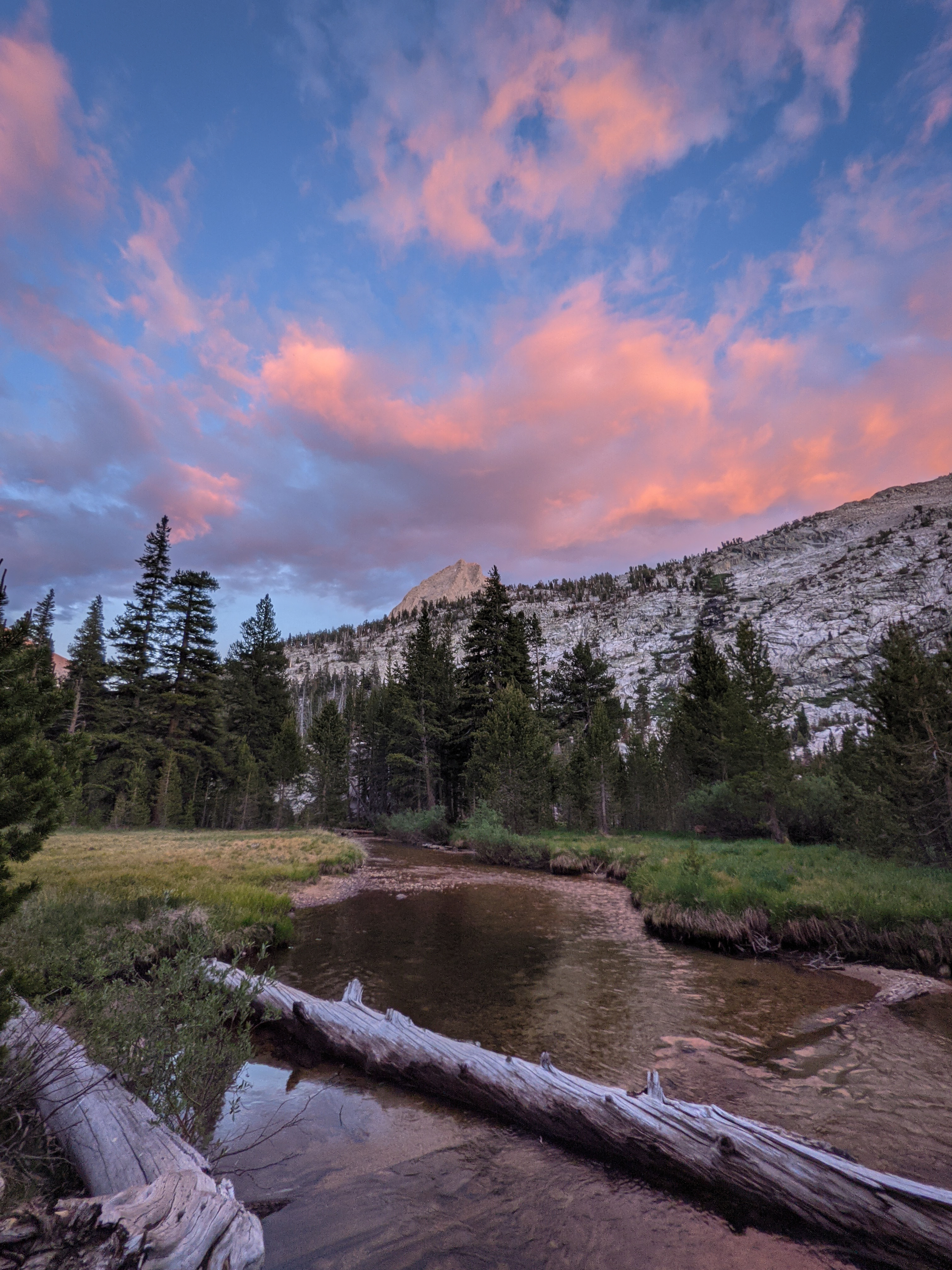 After about eight hours of hiking we reached Lower Vidette Meadow. We didn’t have energy for another 1,000 or so feet of climbing after climbing almost 5,000 feet today so we found a nice campsite between the trail and Bubbs Creek where we made camp for the night.