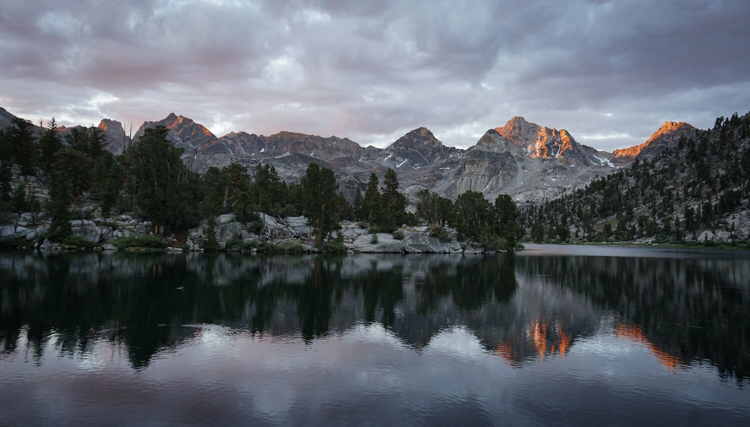 Before all of our debate about which mountain to climb or not climb, we enjoyed a lovely, cloudy sunrise. Usually not an omen of good weather, but we figured we could chance it. We set out at about 7:15, crossed the JMT, and started hiking up through the forest for the very long gully up the west face of Diamond Peak.