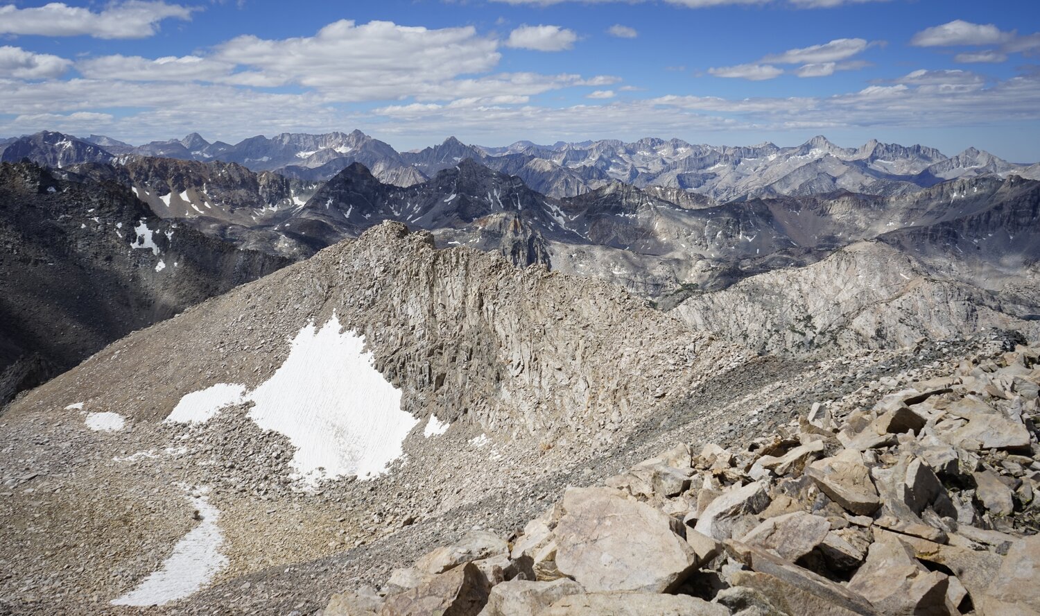 After much struggling, we reached the Sierra Crest by way of some class 3 blocks. Here there was a beautiful sidewalk of talus stretching about a quarter mile to the summit.