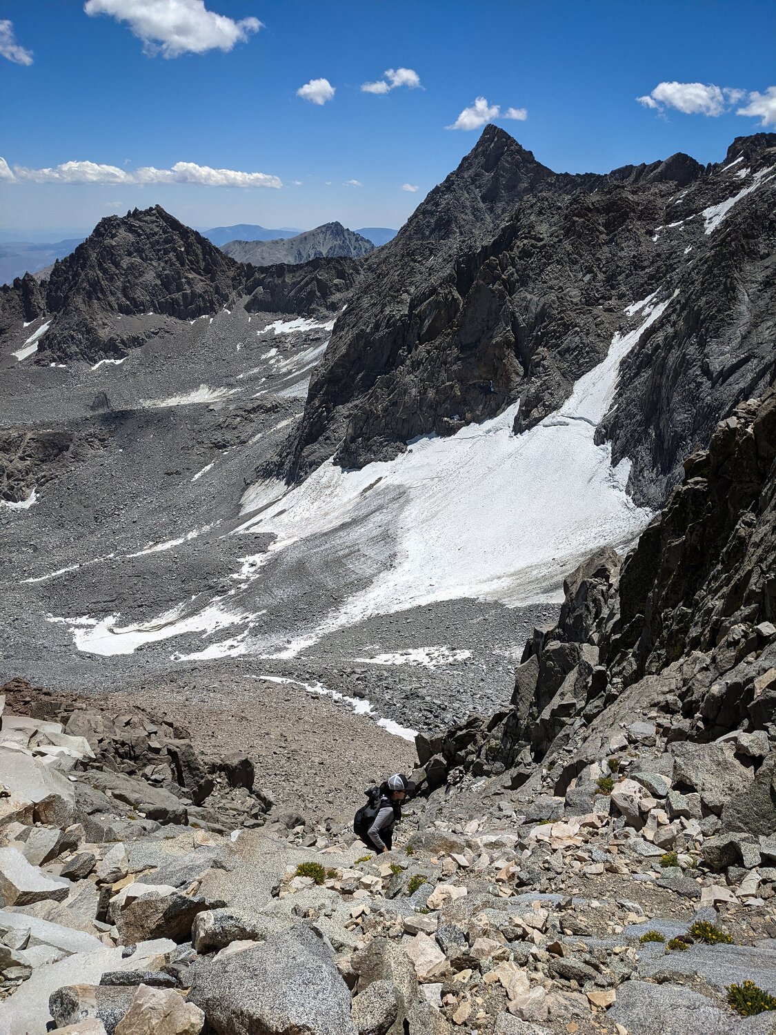 After a fun scramble down, we were back on the talus next to the moraine. Here’s another view of the route from below.