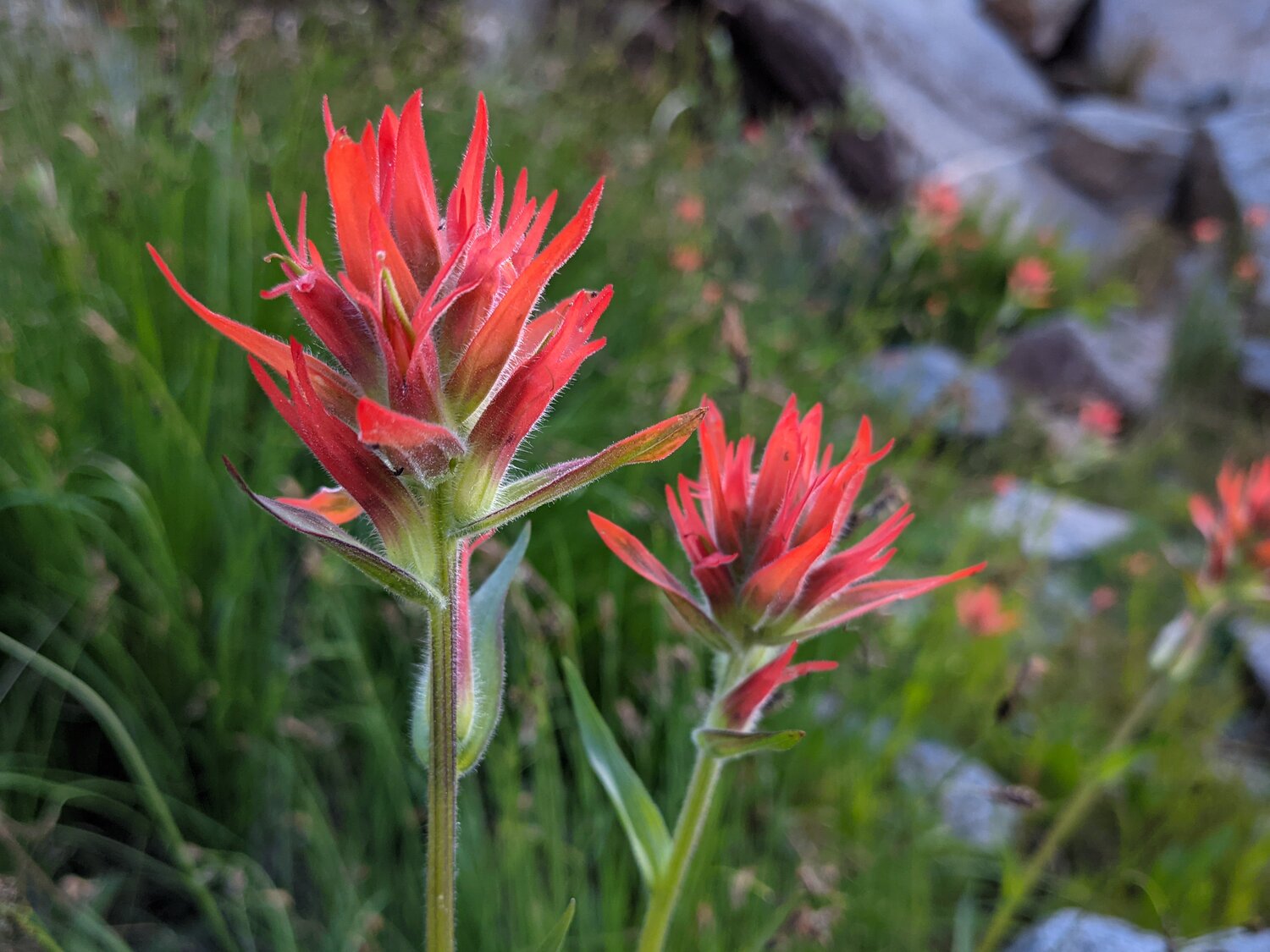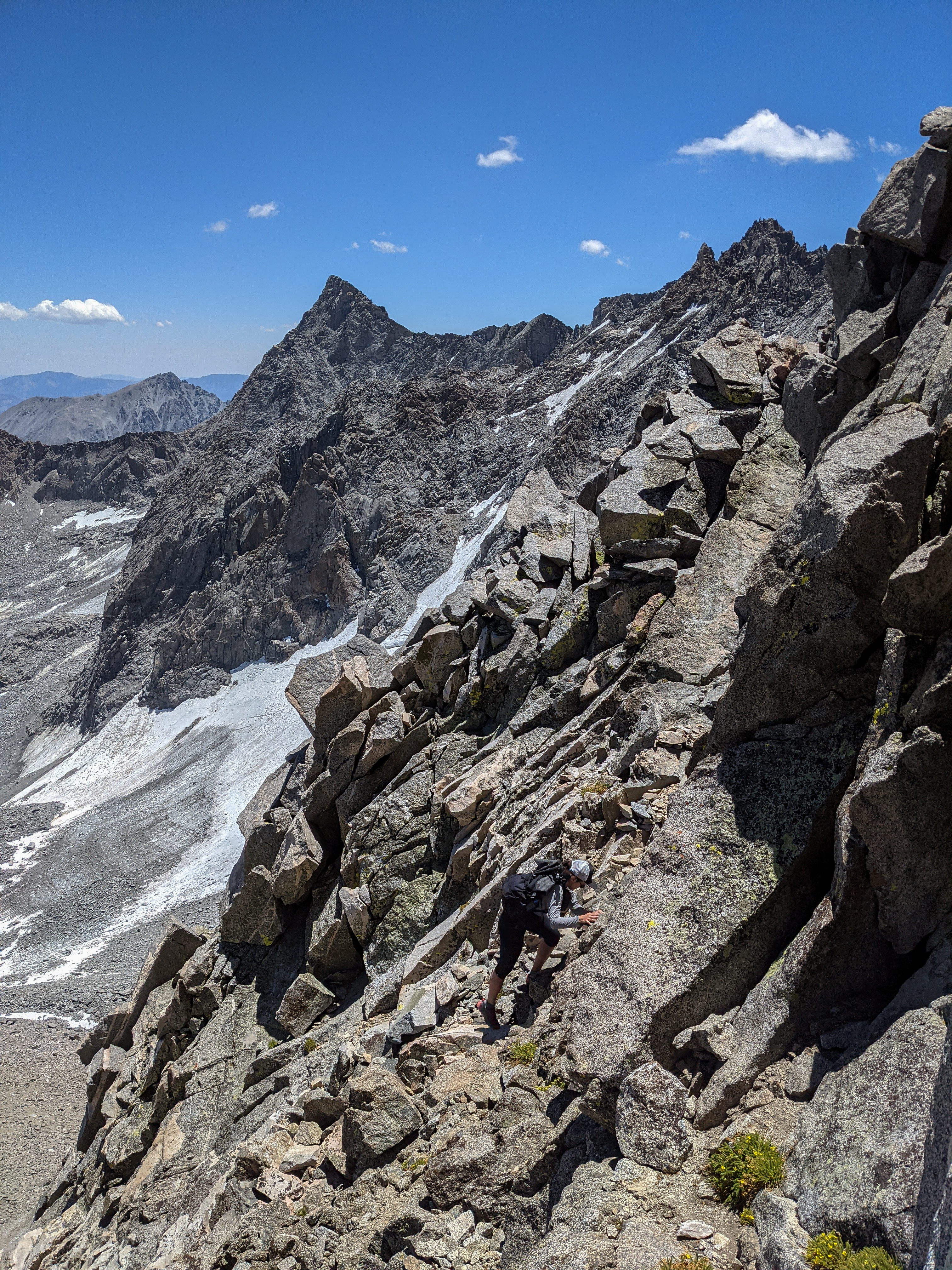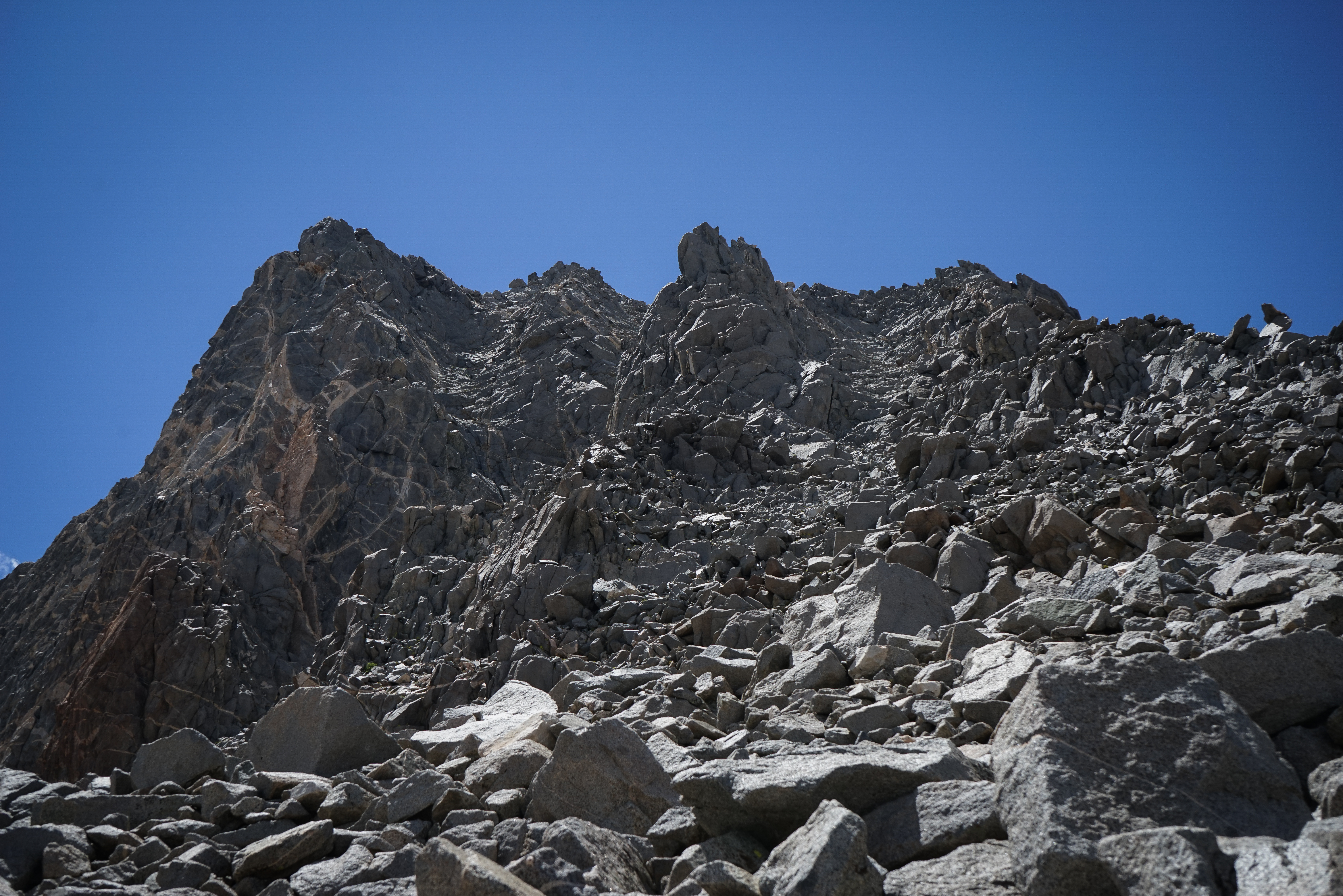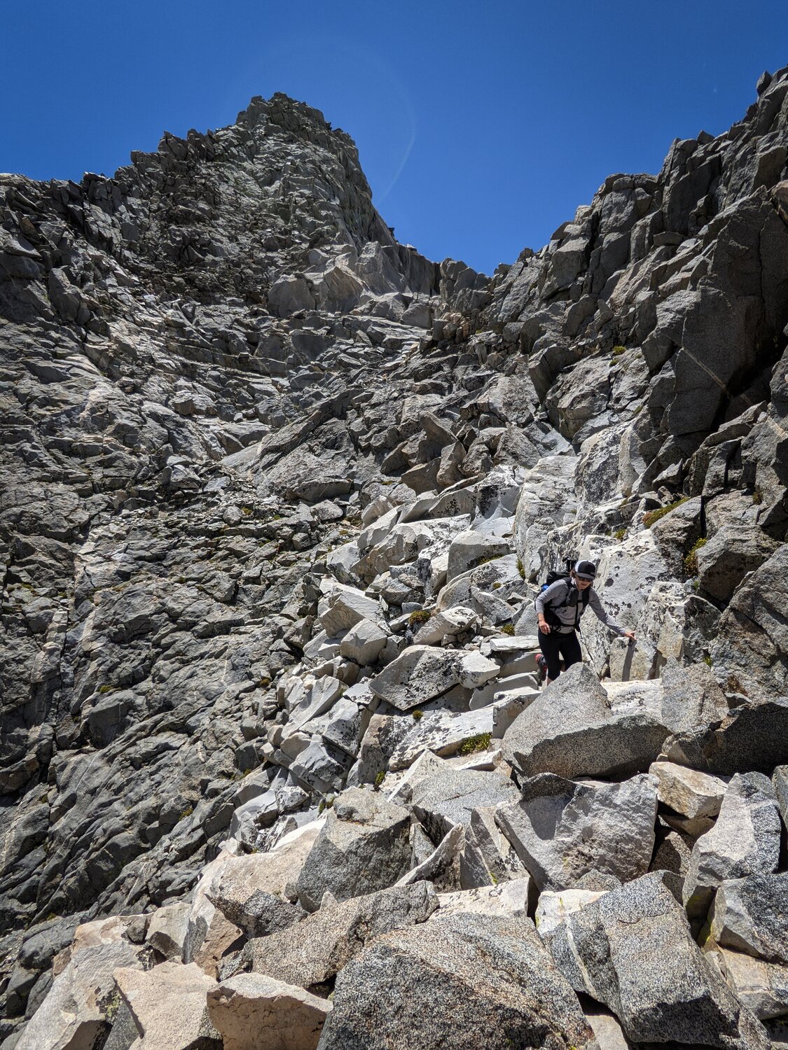 It was almost 11 by the time we reached the base of the correct route, which we confirmed because we saw the other hiker coming down. Between the altitude and the vast sea of large talus, we were not moving particularly fast today. Fortunately, the weather was holding.