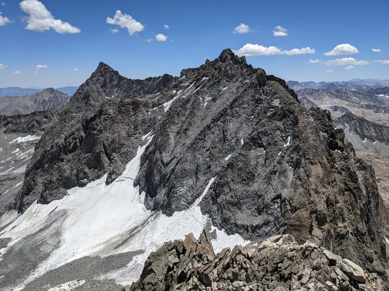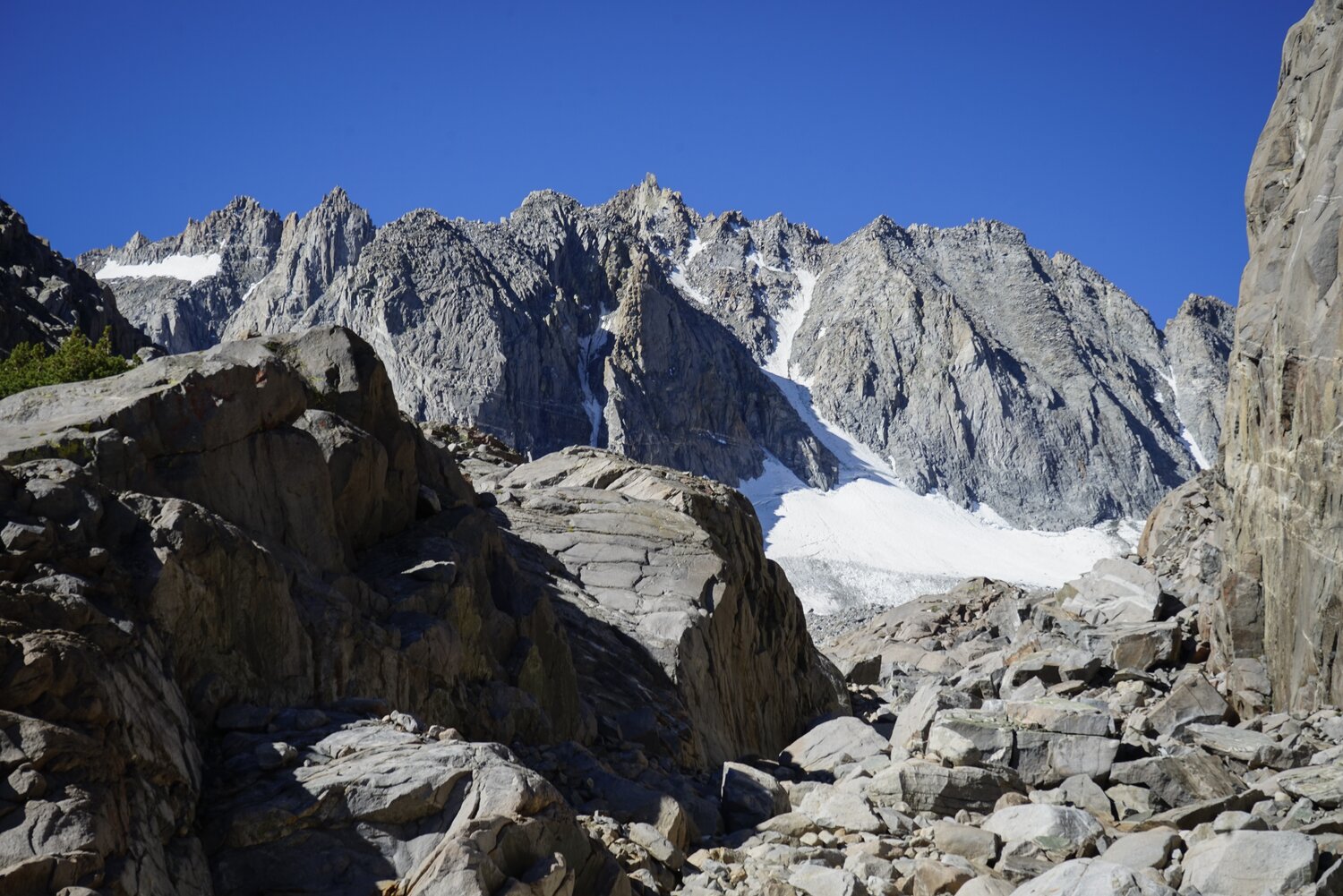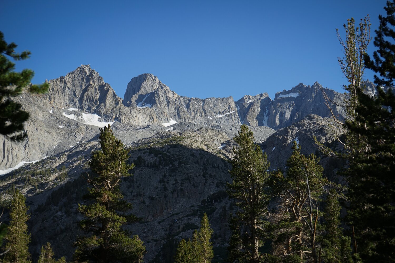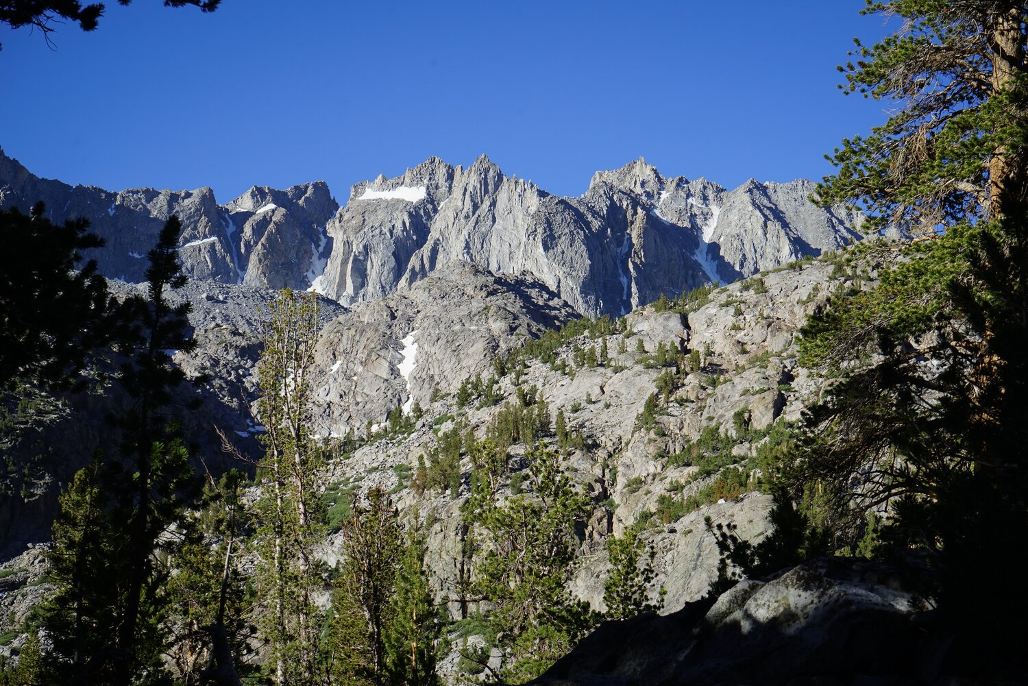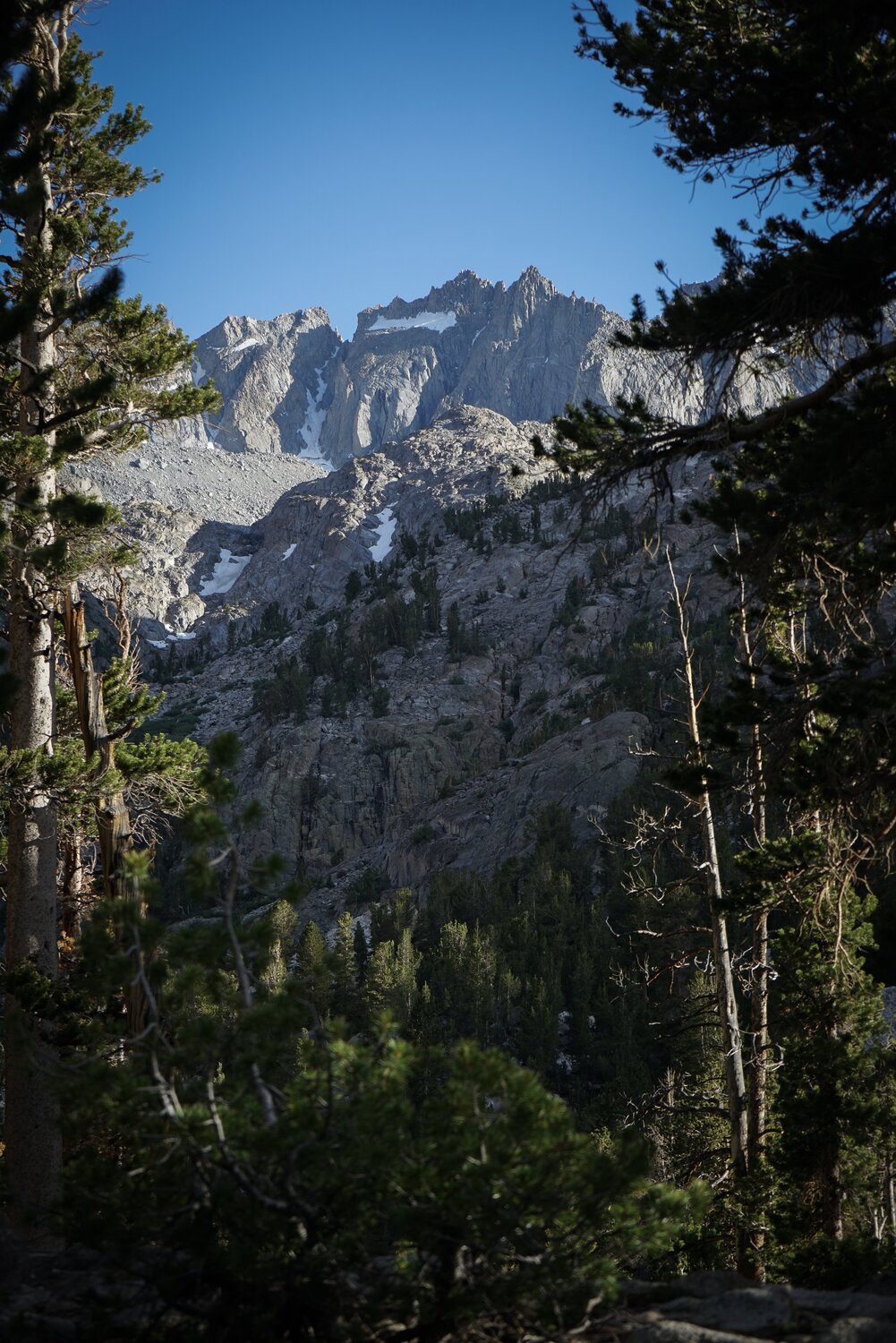First views of the North Palisade massif from above Sam Mack Meadow.