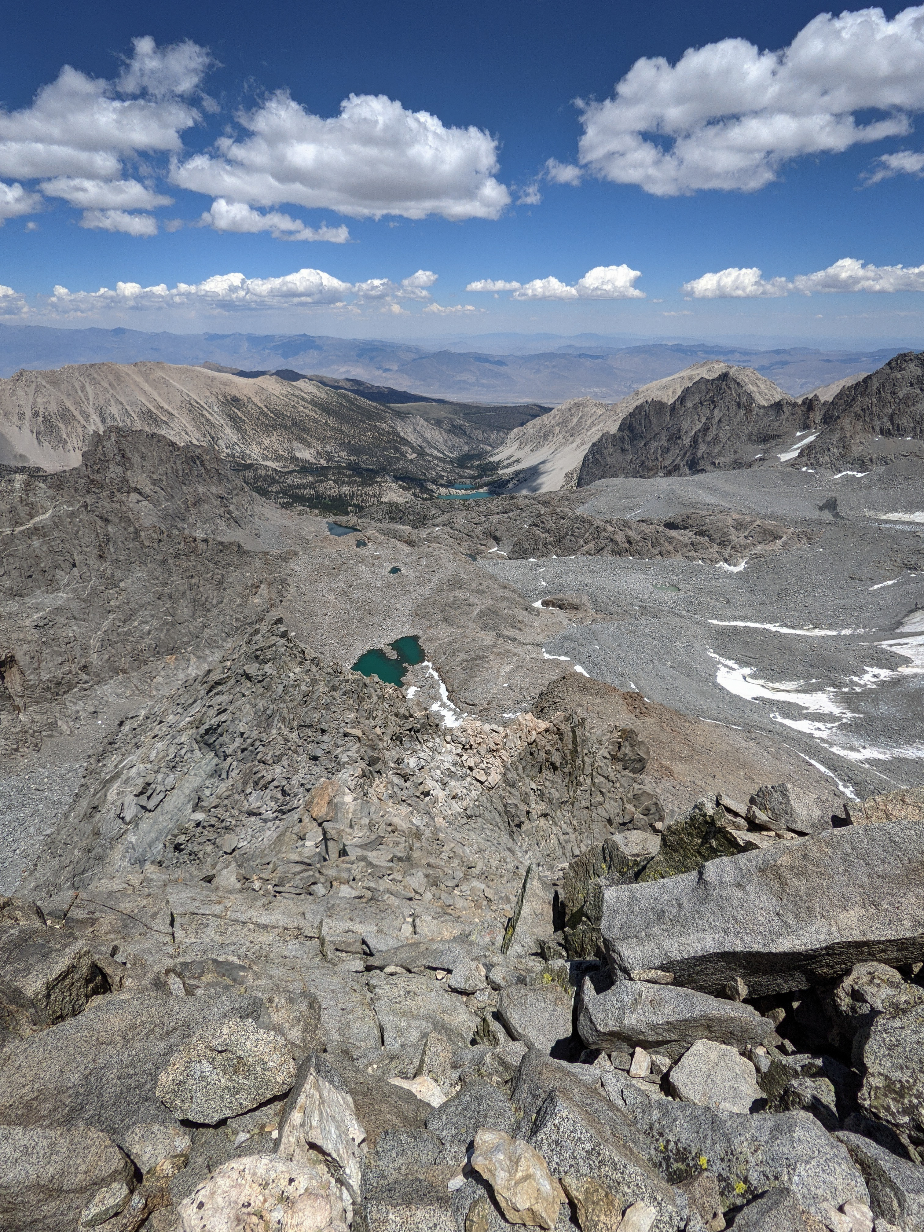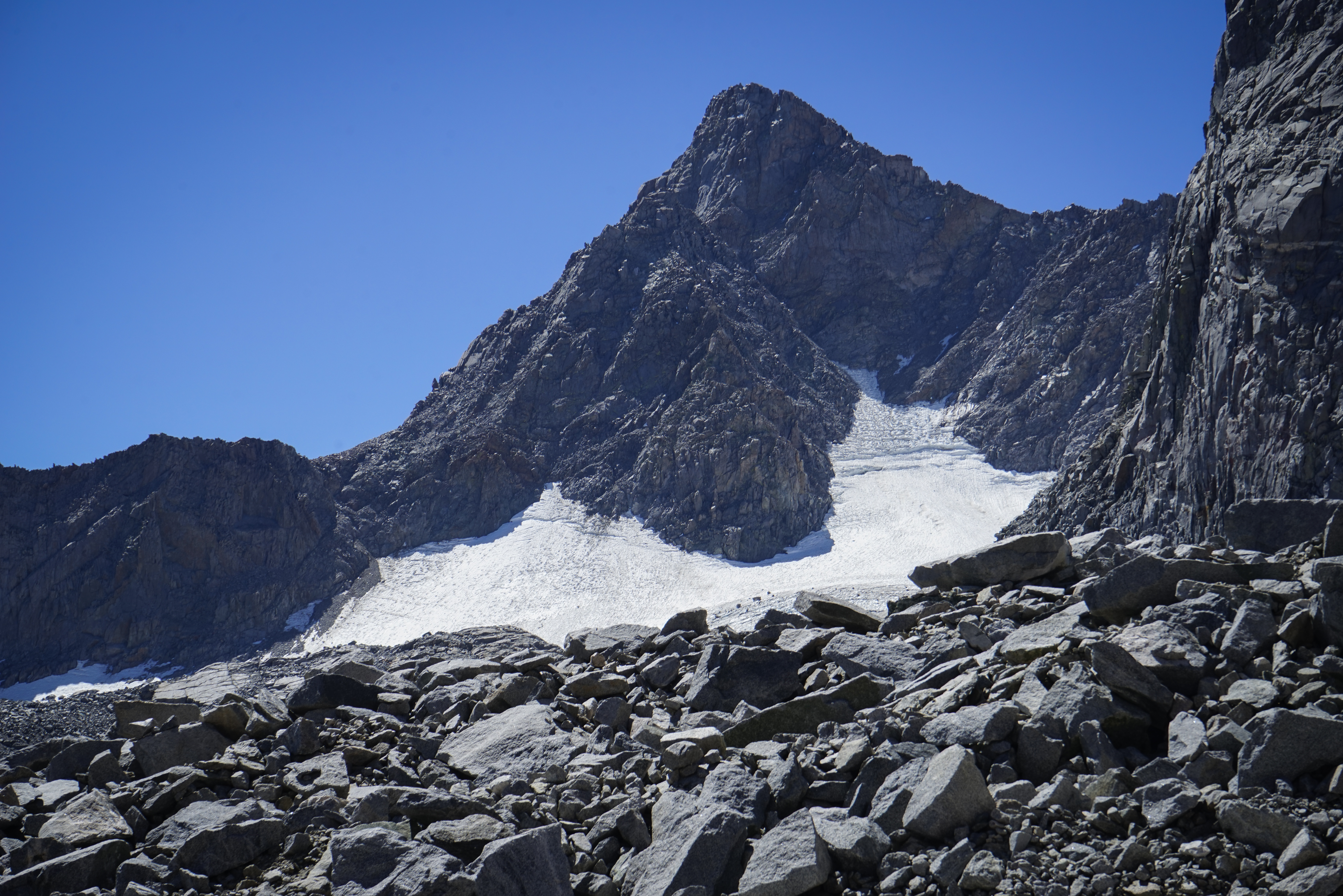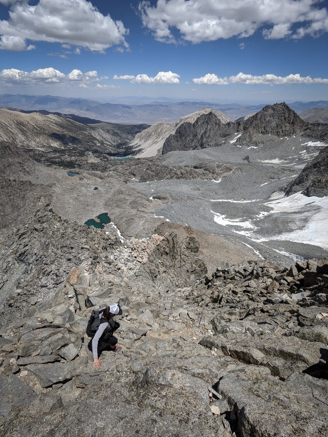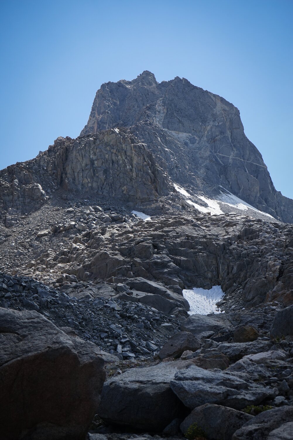Above the small lake, we climbed about 50 vertical feet up onto the massive moraine of the Palisade Glacier and continued making very slow progress towards Mount Winchell. I initially wanted to cut off a little bit sooner, aiming for what I thought was the East Arete and the white rocks, but Shannon pointed out that Secor had said to wrap around closer to the Thunderbolt Glacier. She was right and so we continued rock hopping upwards.